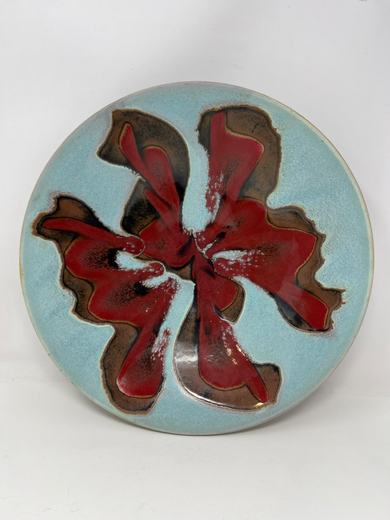 Wall-hung studio pottery art bowl signed Patten on the base. Features red and brown abstract glaze over a blue background. Includes hanging loop on back. Glossy glazed finish with expressive painterly style Signed on base Wire hanger attached for wall display Due to Size/Fragility: This Item Is Not Eligible for Shipping. Available for Local Pickup Only.