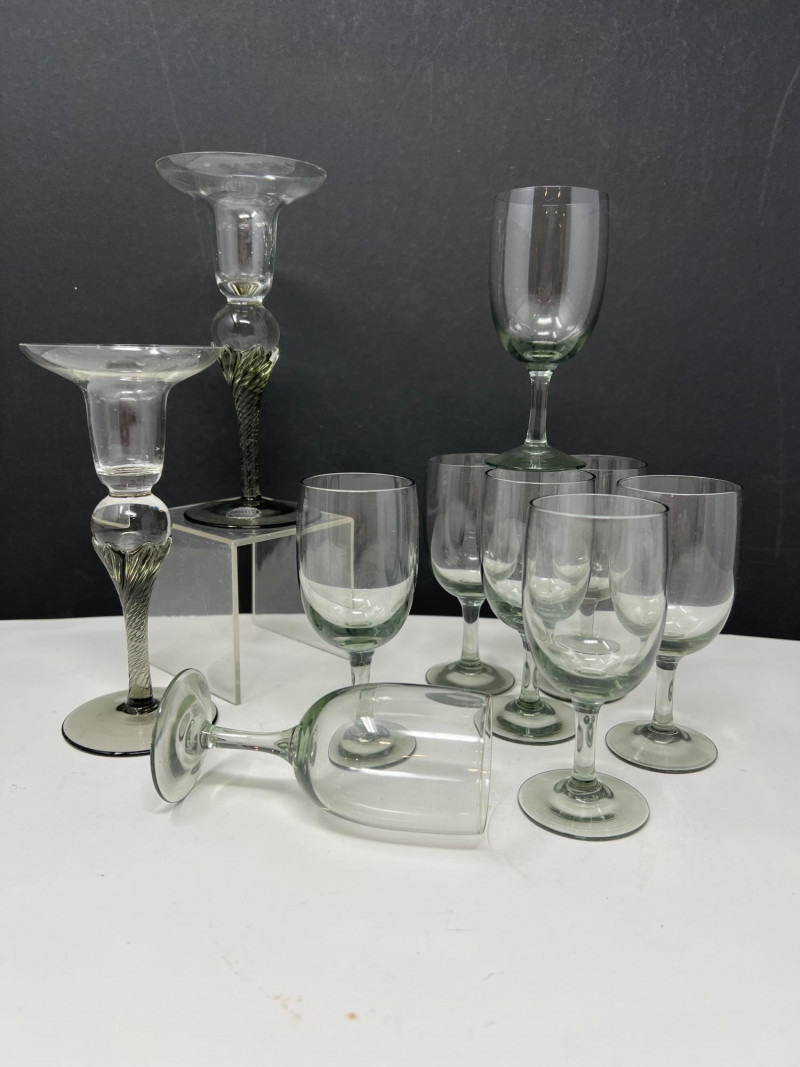 Lot # 96 - Bohemia Crystal Candlesticks & 7 Smoky Cordials – Czech Glass Set