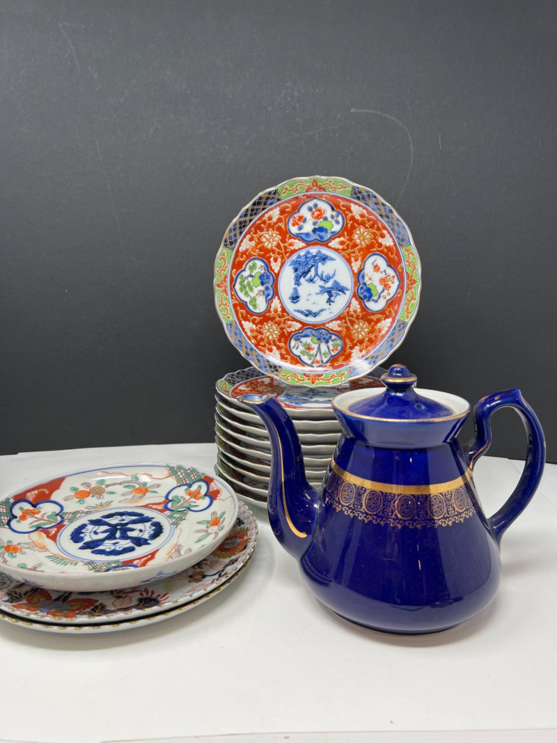 Mixed lot of Asian-style porcelain and ceramic dishware. Includes Imari-style plates with vibrant hand-painted floral and landscape designs and a red Chinese mark on the base, a deep cobalt blue Hall 5-cup teapot with gold detailing (063X), and assorted pieces marked Spode Copeland and F&C Osler, London. A colorful and collectible group blending Chinese, Japanese, and English influences. Tea pot measures 6.5 in H x 8 in L x 4 in W Plates measure 8.25 in diameter and 7.25 in diameter. Due to Size/Fragility: This Item Is Not Eligible for Shipping. Available for Local Pickup Only.