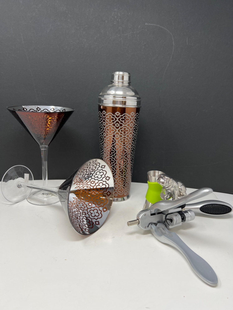 Barware bundle includes a Slant copper and silver-tone cocktail shaker with two matching martini glasses featuring metallic floral motifs. Also includes a Metrokane rabbit-style corkscrew, Trudeau stainless jigger with silicone grip, and a novelty bulldog bottle stopper. Eye-catching set for your home bar or entertaining setup.