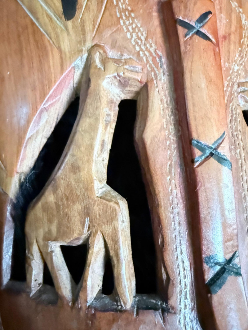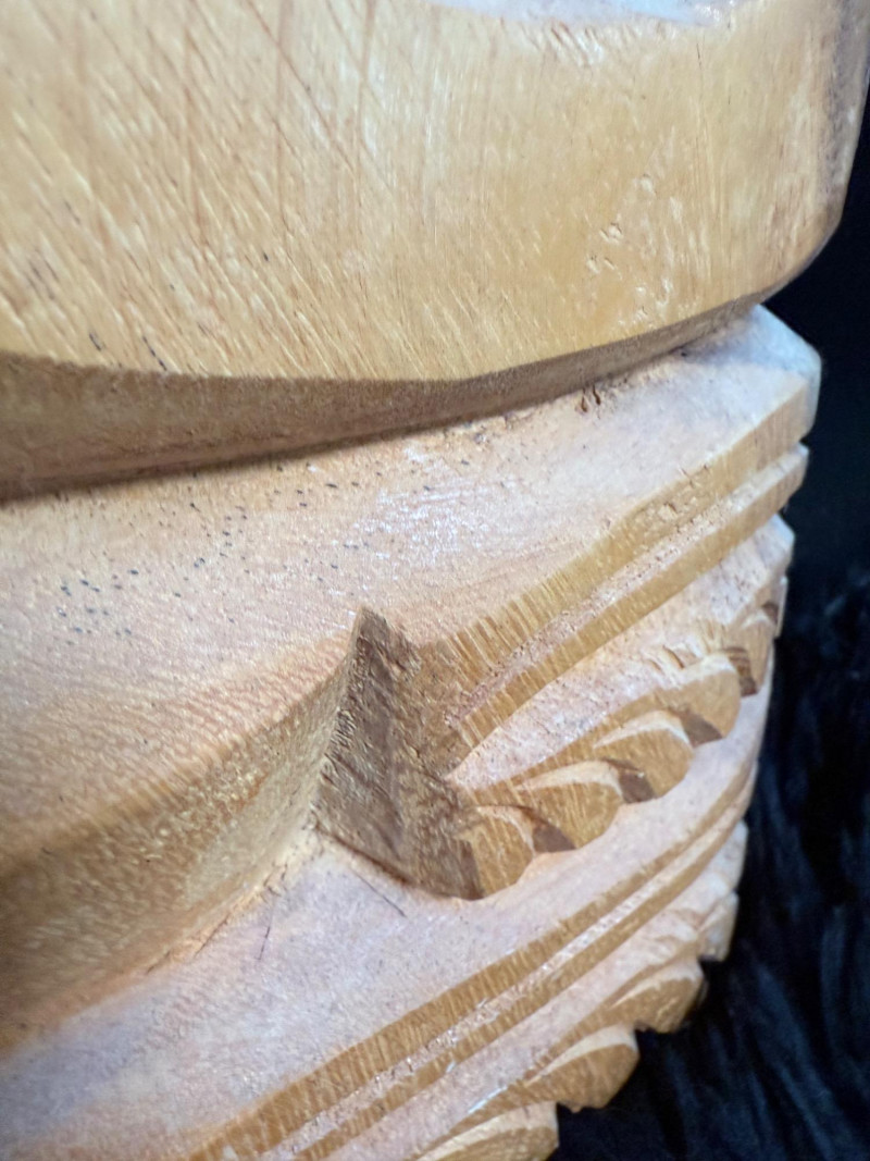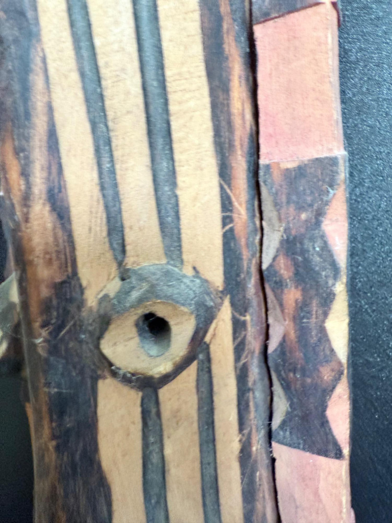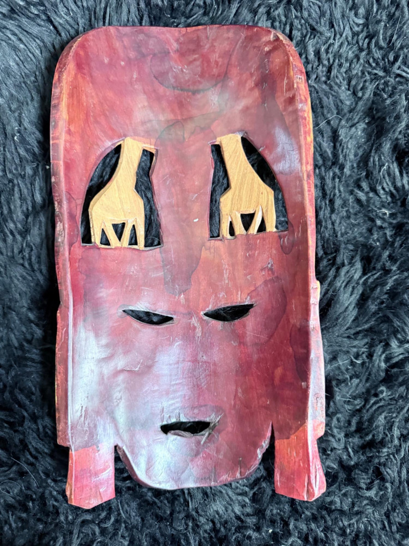 Painted red surface with raised animal figures at the crown and geometric carvings across the face.