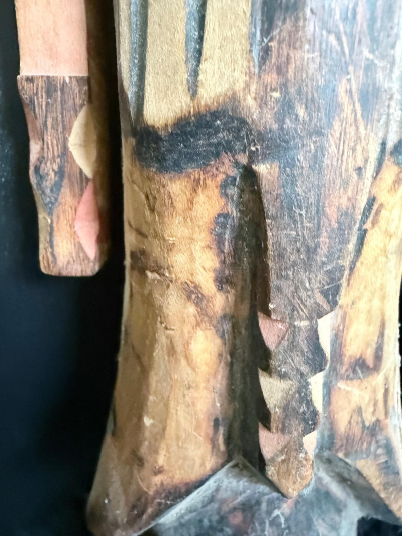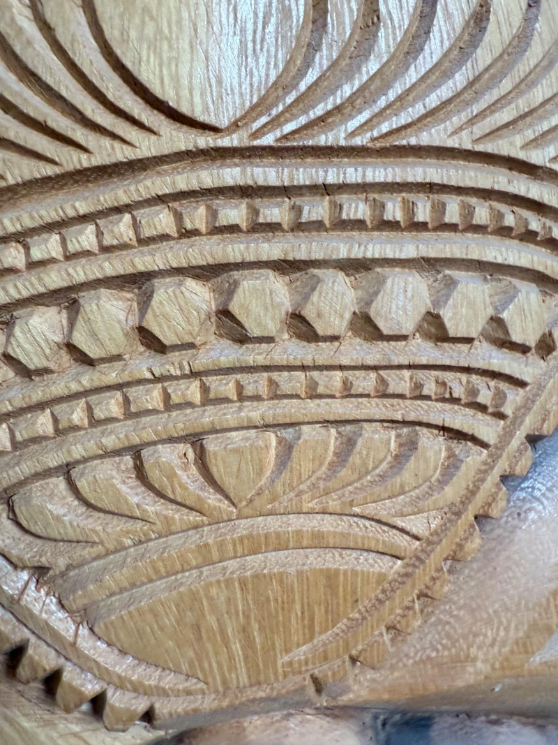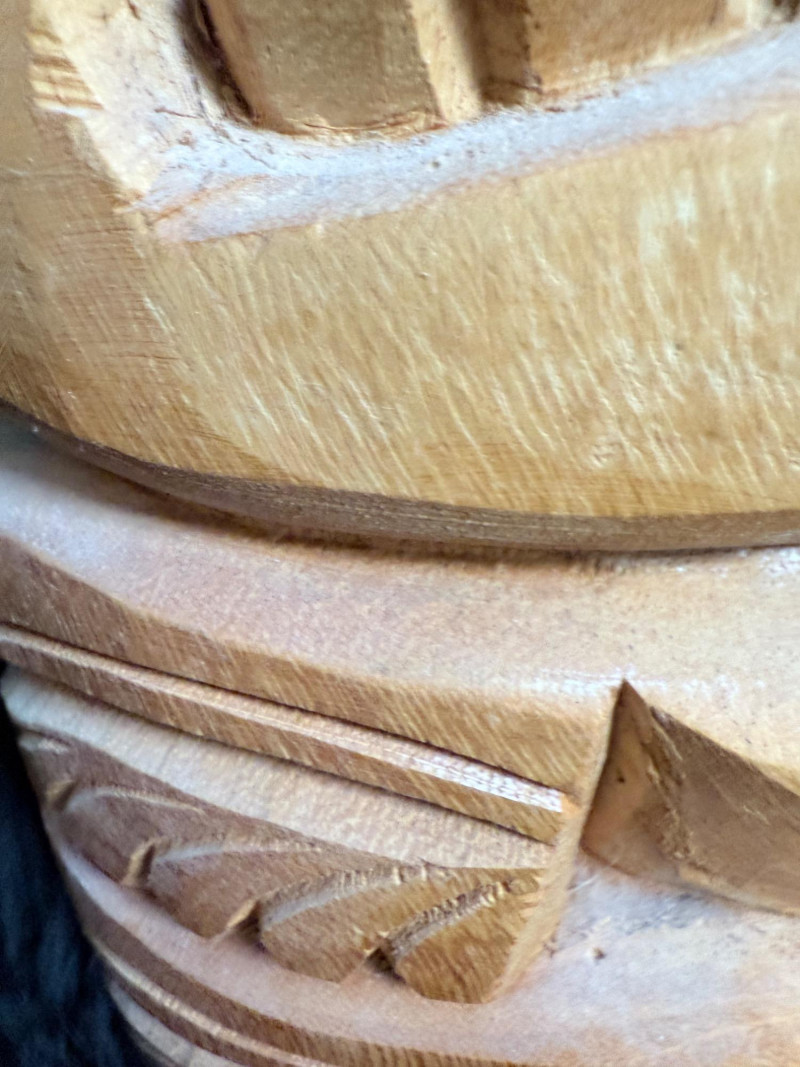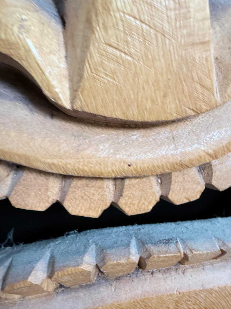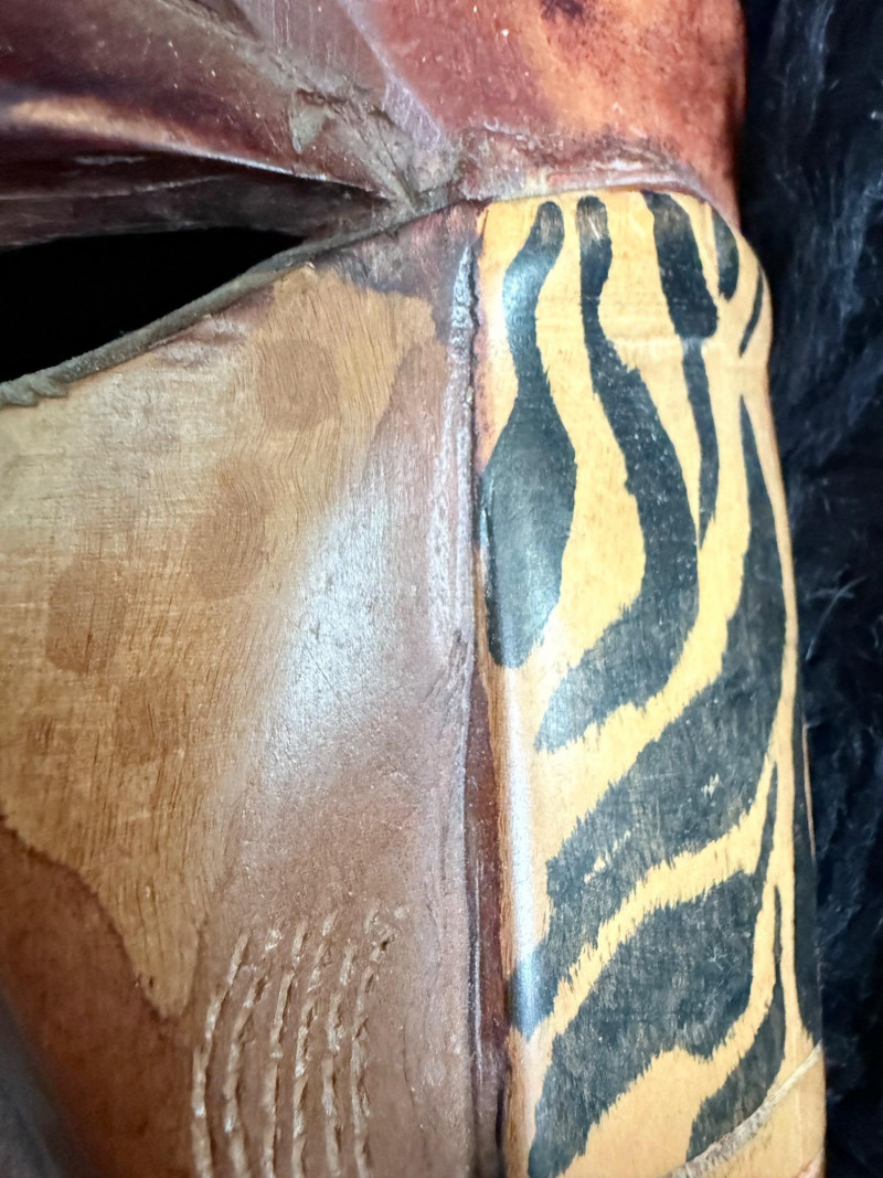 Painted red surface with raised animal figures at the crown and geometric carvings across the face.