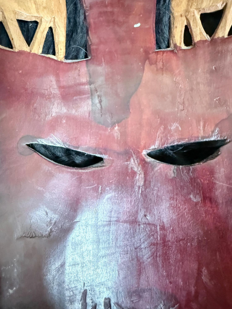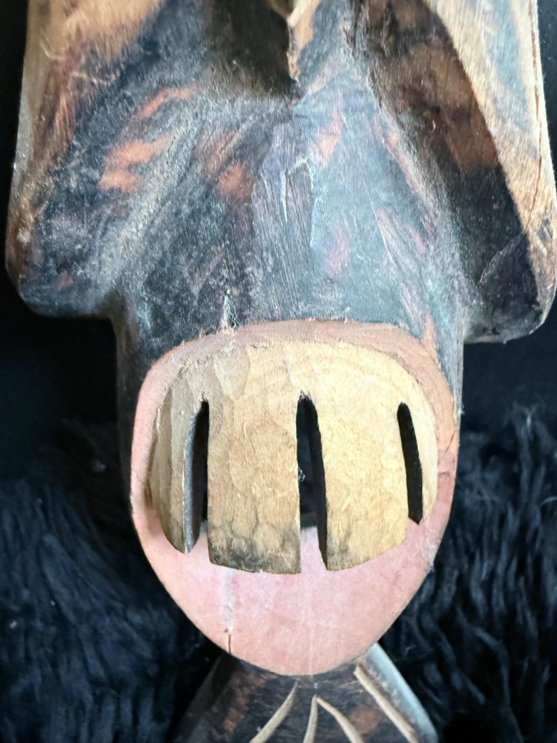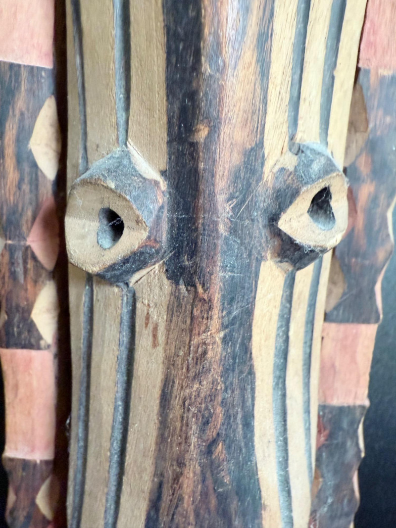 Vertical mask with striped surface design, protruding snout, and drilled eye openings.