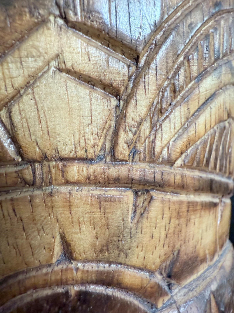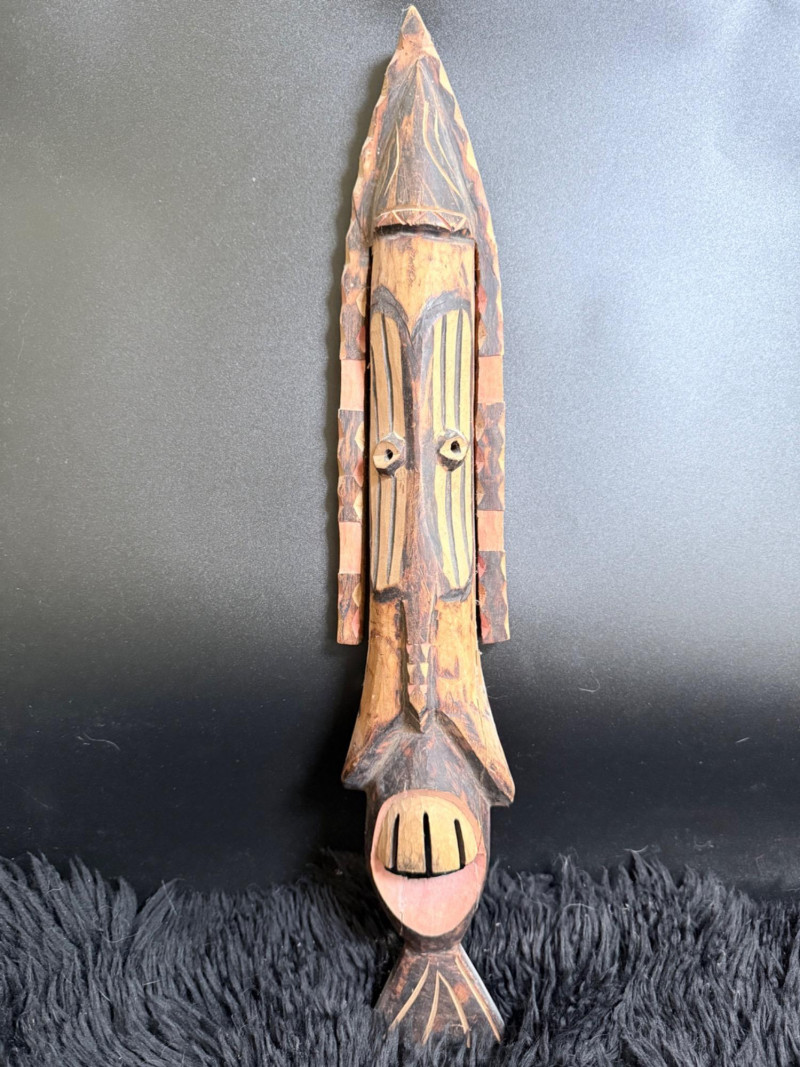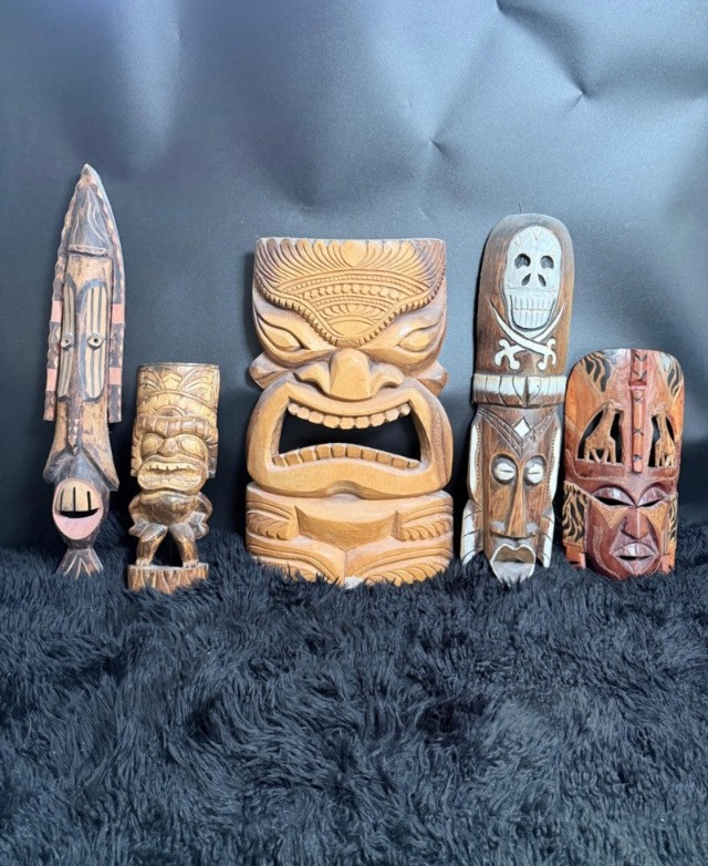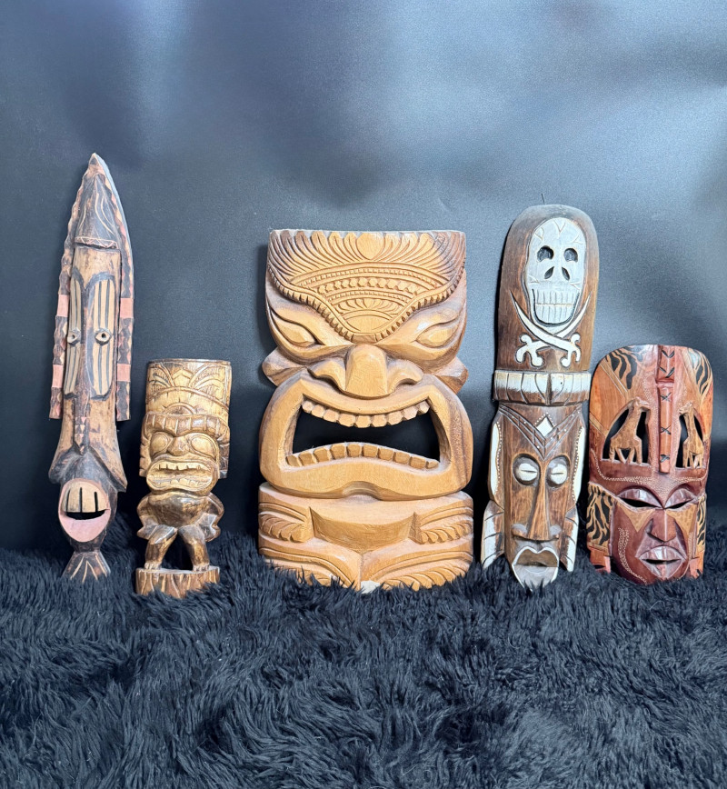 Carved Wood Tribal Mask and Tiki Figure Collection Collection of five hand-carved wood pieces featuring a variety of stylized faces, incised patterns, and cultural motifs. Tiki Mask signed “L. Kamea” Tribal Mask marked “DSKK 2-75” Tall Mask with Inset Eyes and Ribbed Surface Skull Mask with Crossbones Motif Flat-Back Red Mask with Cutout Eyes Range of size 12-20 inches
