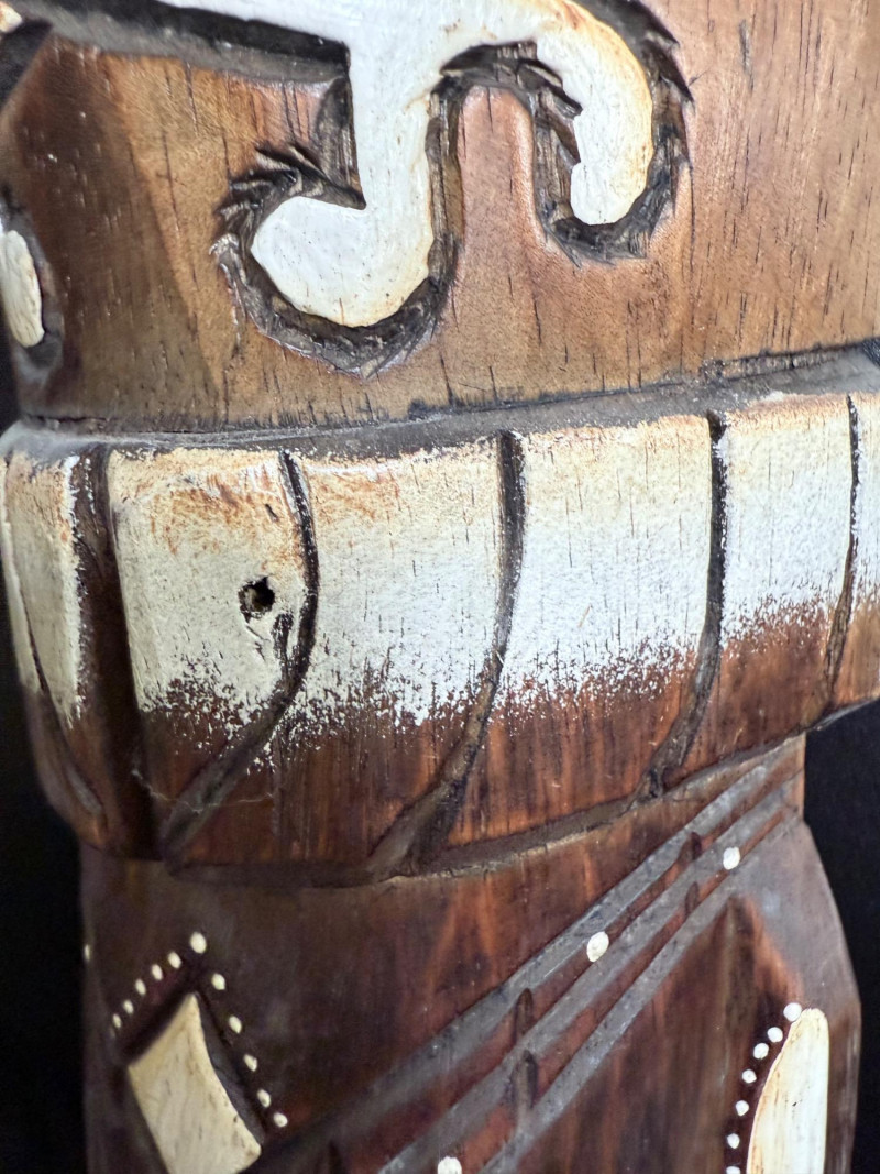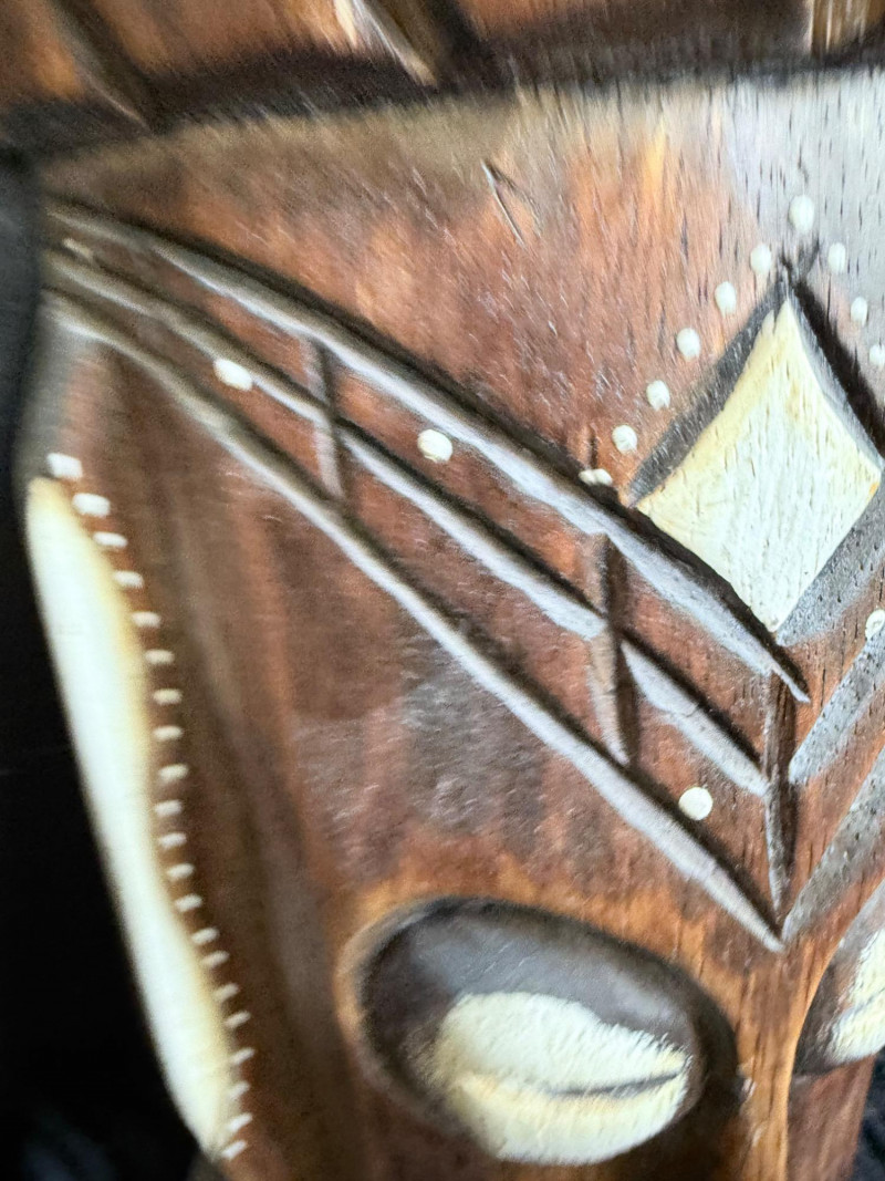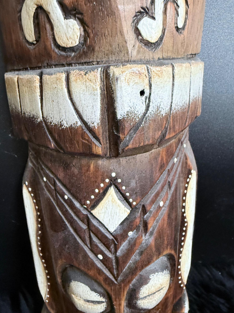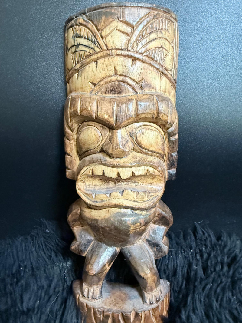 Carved Wood Tribal Mask and Tiki Figure Collection Collection of five hand-carved wood pieces featuring a variety of stylized faces, incised patterns, and cultural motifs. Tiki Mask signed “L. Kamea” Tribal Mask marked “DSKK 2-75” Tall Mask with Inset Eyes and Ribbed Surface Skull Mask with Crossbones Motif Flat-Back Red Mask with Cutout Eyes Range of size 12-20 inches