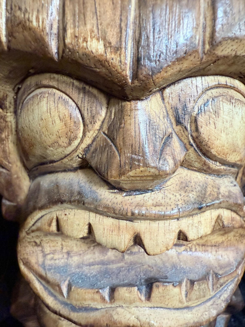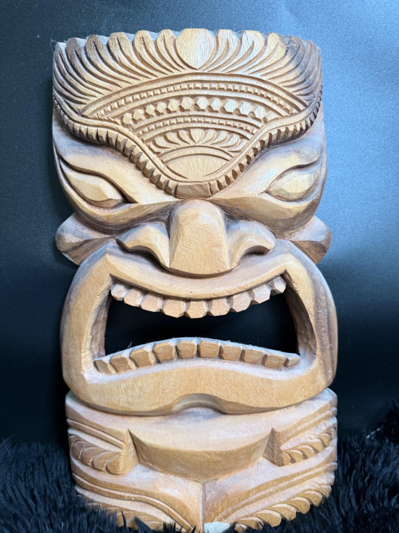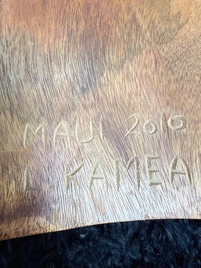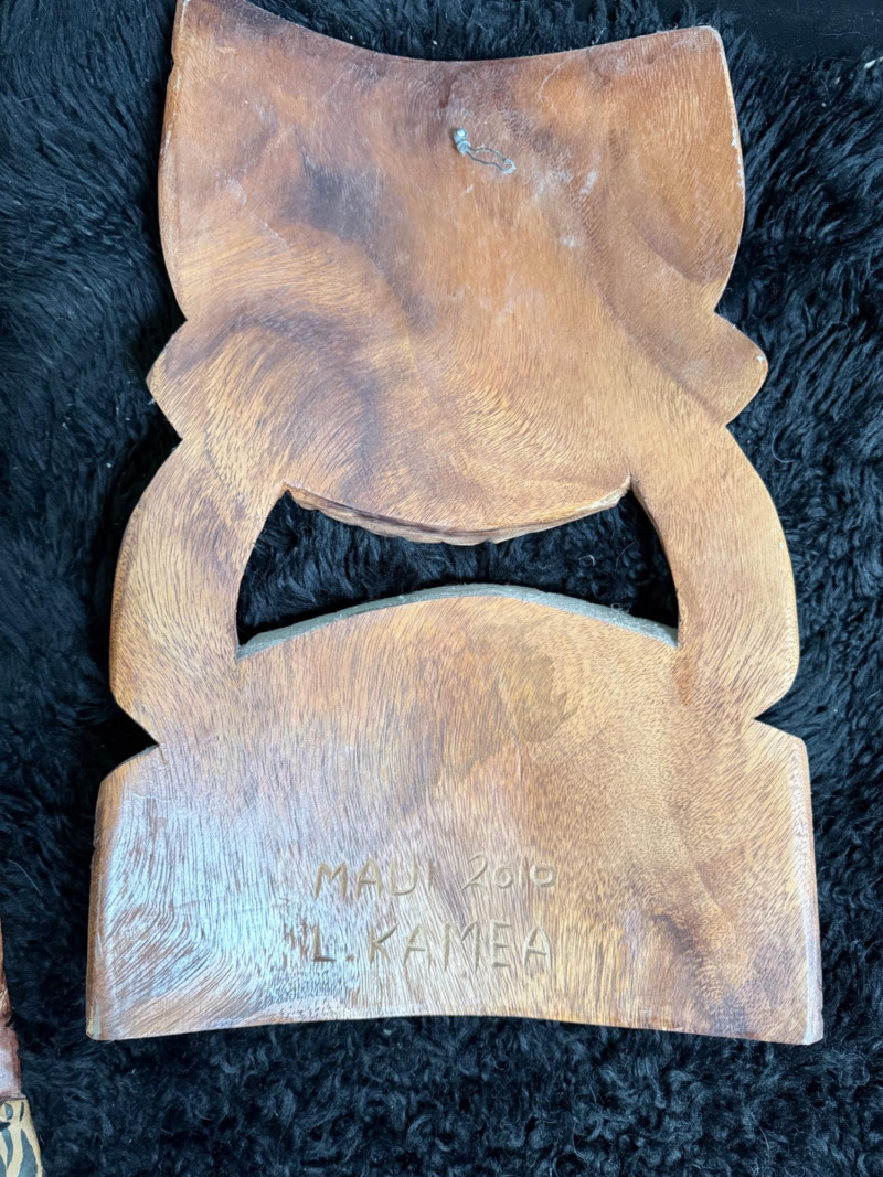 Broad-faced carving with arched brows, open mouth with two rows of teeth, and layered forehead detailing. Inscribed on the reverse “Maui 2010 L. Kamea.”