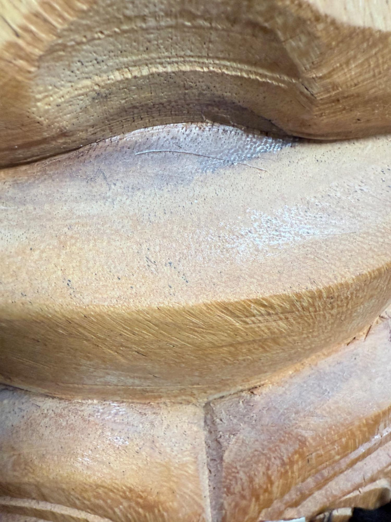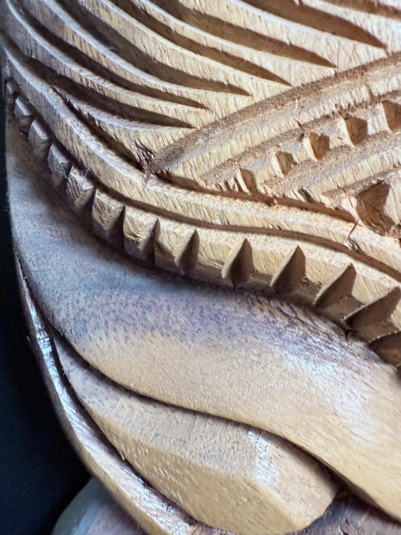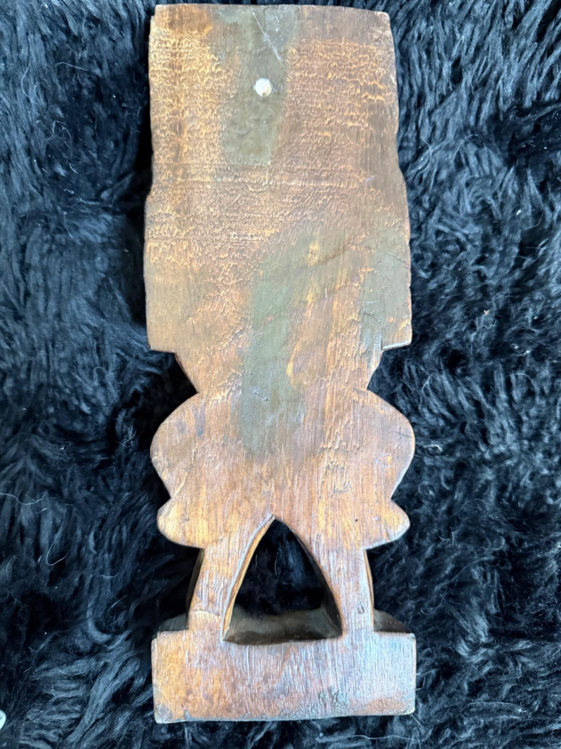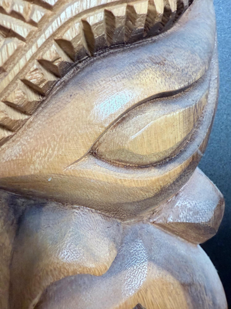 Broad-faced carving with arched brows, open mouth with two rows of teeth, and layered forehead detailing. Inscribed on the reverse “Maui 2010 L. Kamea.”