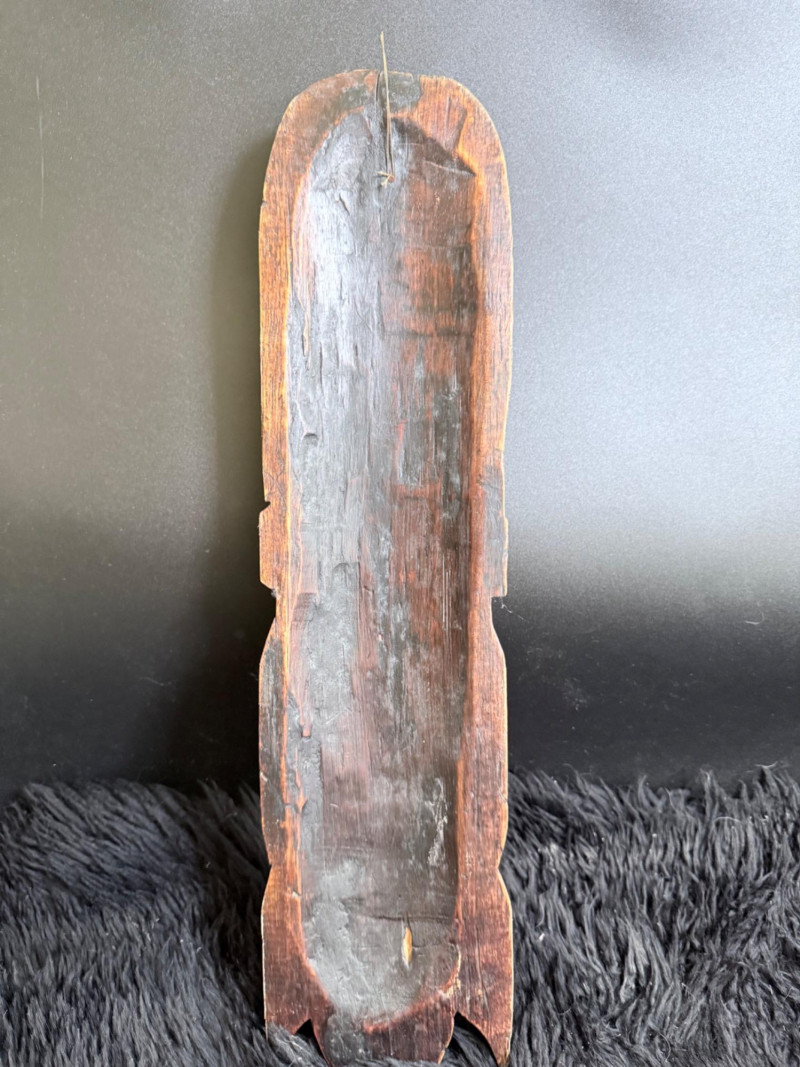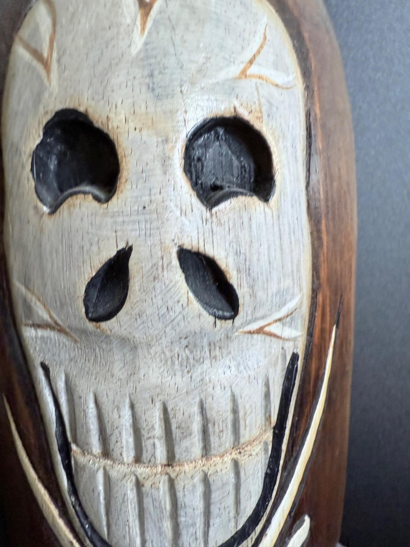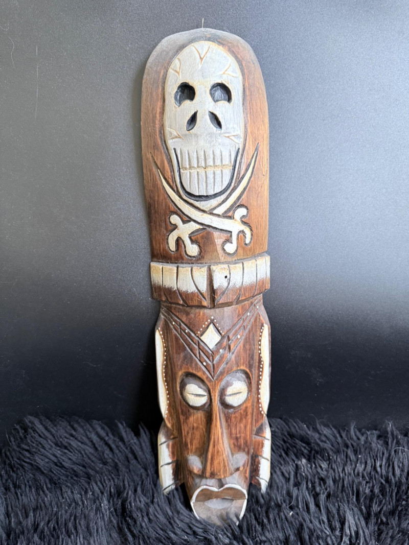 Elongated mask carved with a skull face and crossed bone design across the front.