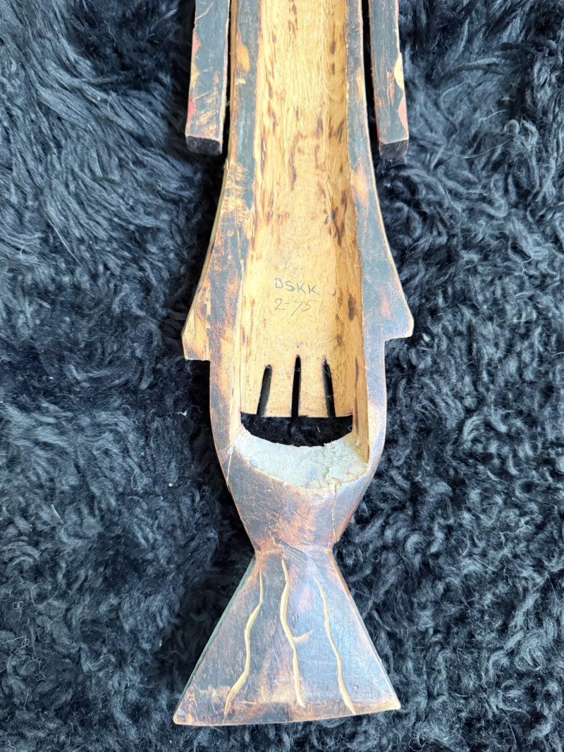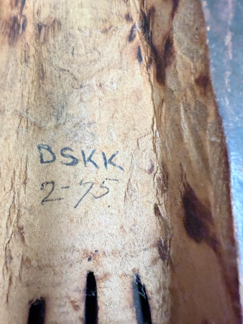 Elongated form with extended snout, raised circular eyes, and vertical facial lines. Reverse bears the marking “DSKK 2-75.”