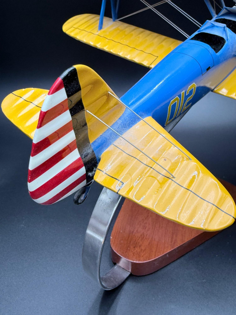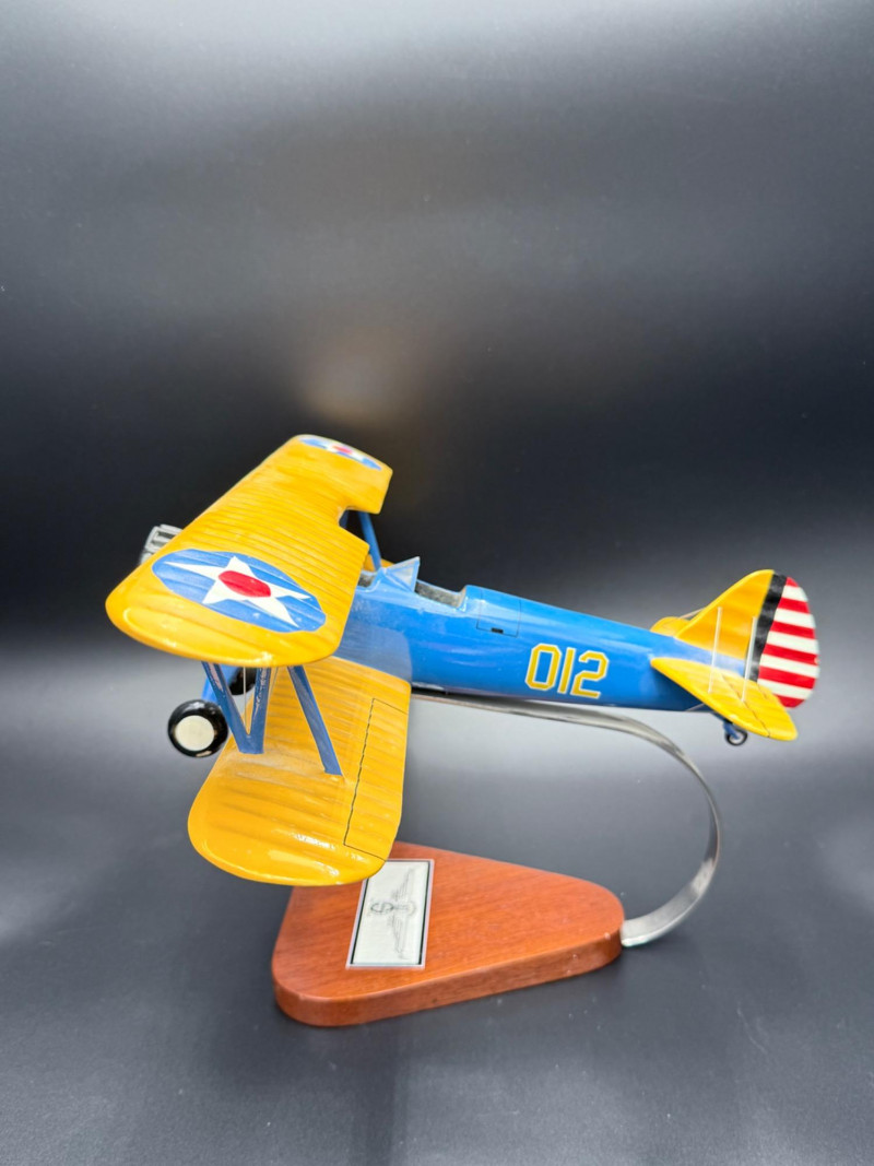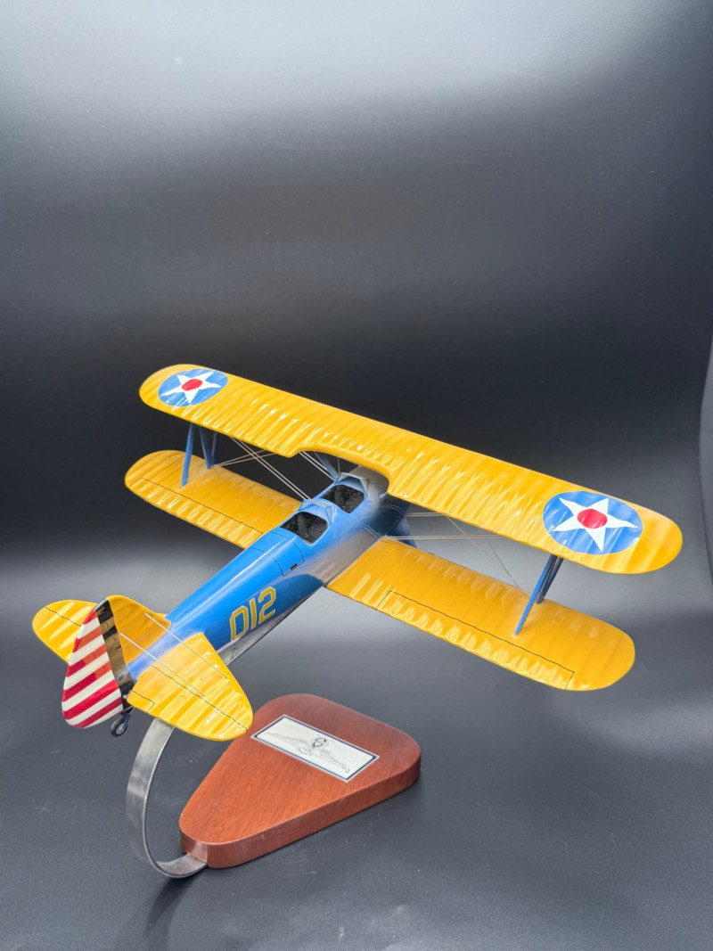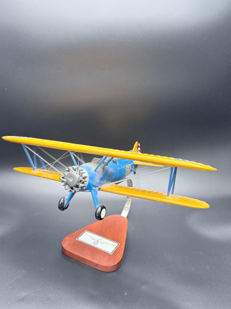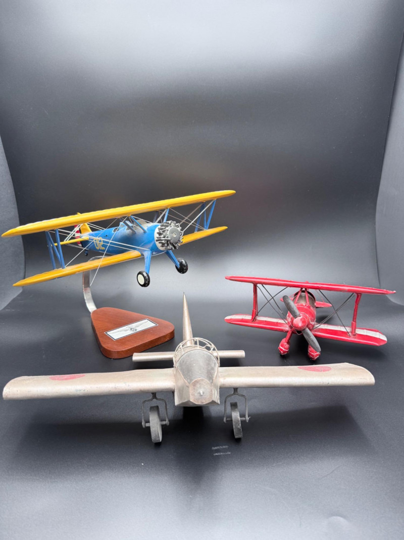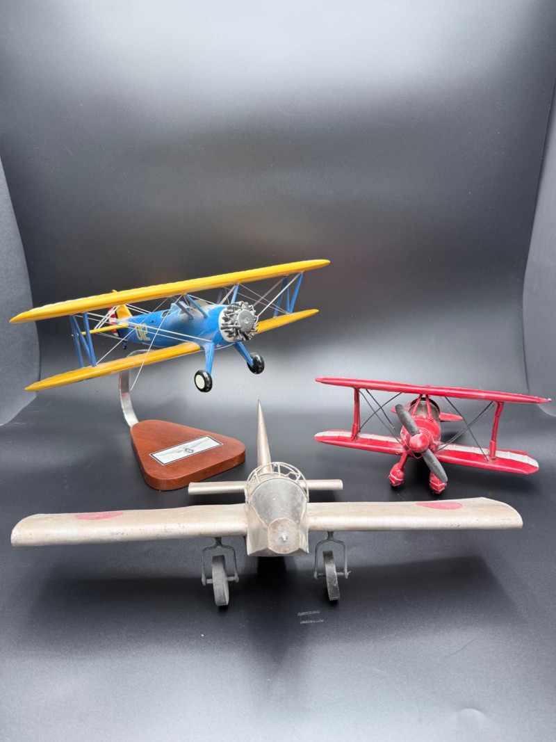 Three Model Aircraft – Stearman Trainer, Red Biplane & Japanese Zero Set of three handcrafted aircraft models representing distinct aviation styles. The first is a wooden biplane with blue fuselage, yellow wings, and U.S. military insignia, mounted on a display base labeled “Stearman Aircraft Company, Wichita Kansas,” referencing the Boeing-Stearman Model 75. The second is a red-painted metal biplane with fixed landing gear and dual wings, evoking early 20th-century barnstormer aircraft. The third is a metal monoplane painted in silver-gray with red roundels on each wing, referencing the Mitsubishi A6M Zero. Measurements: Stearman biplane (wood): 17" W x 12" D x 10" H Red biplane (metal): 10.5" wingspan x 11" W Silver monoplane (metal): 16" wingspan x 10" W