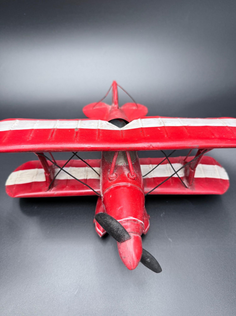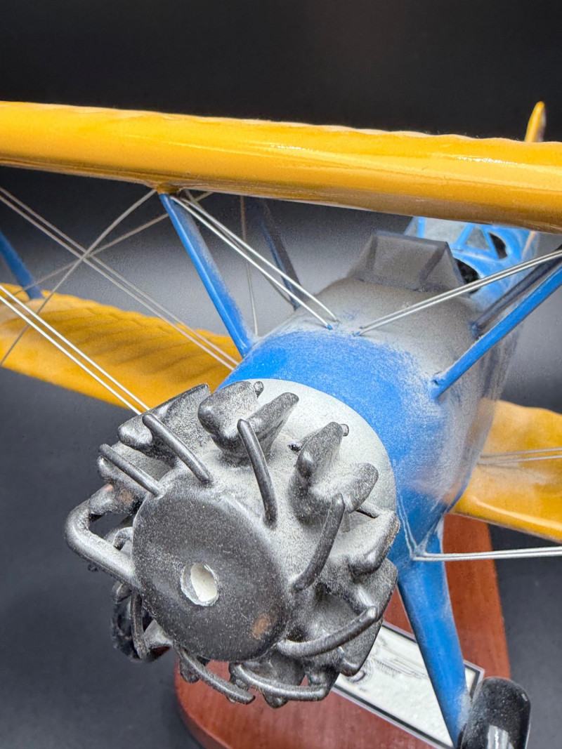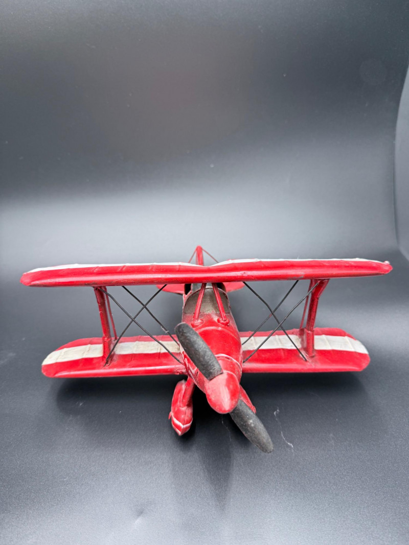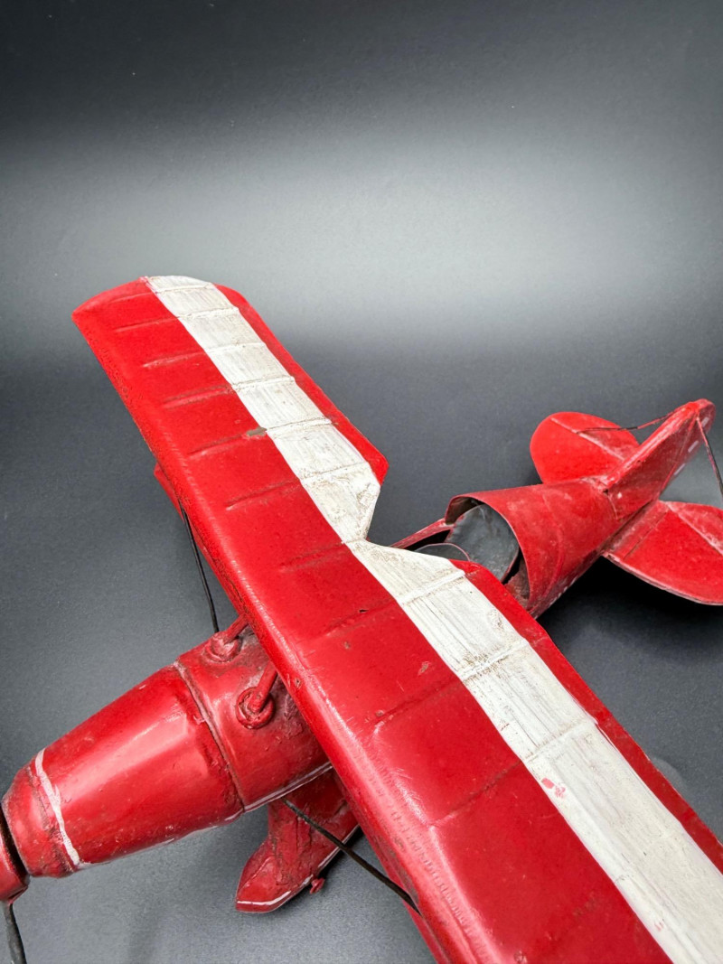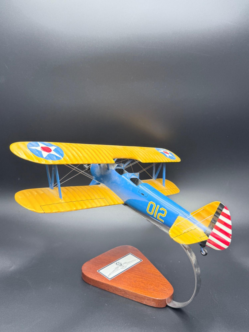 Three Model Aircraft – Stearman Trainer, Red Biplane & Japanese Zero Set of three handcrafted aircraft models representing distinct aviation styles. The first is a wooden biplane with blue fuselage, yellow wings, and U.S. military insignia, mounted on a display base labeled “Stearman Aircraft Company, Wichita Kansas,” referencing the Boeing-Stearman Model 75. The second is a red-painted metal biplane with fixed landing gear and dual wings, evoking early 20th-century barnstormer aircraft. The third is a metal monoplane painted in silver-gray with red roundels on each wing, referencing the Mitsubishi A6M Zero. Measurements: Stearman biplane (wood): 17" W x 12" D x 10" H Red biplane (metal): 10.5" wingspan x 11" W Silver monoplane (metal): 16" wingspan x 10" W