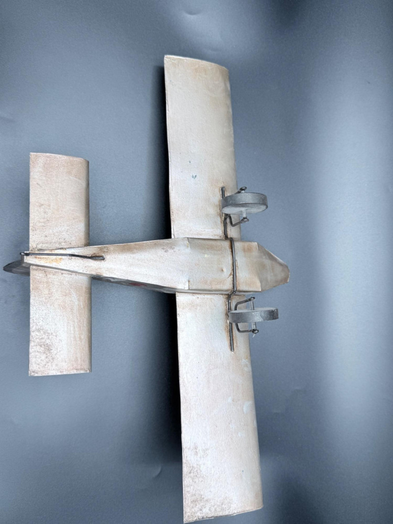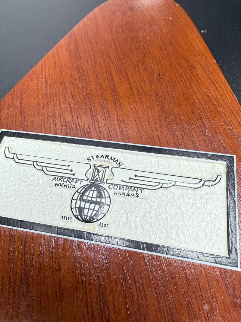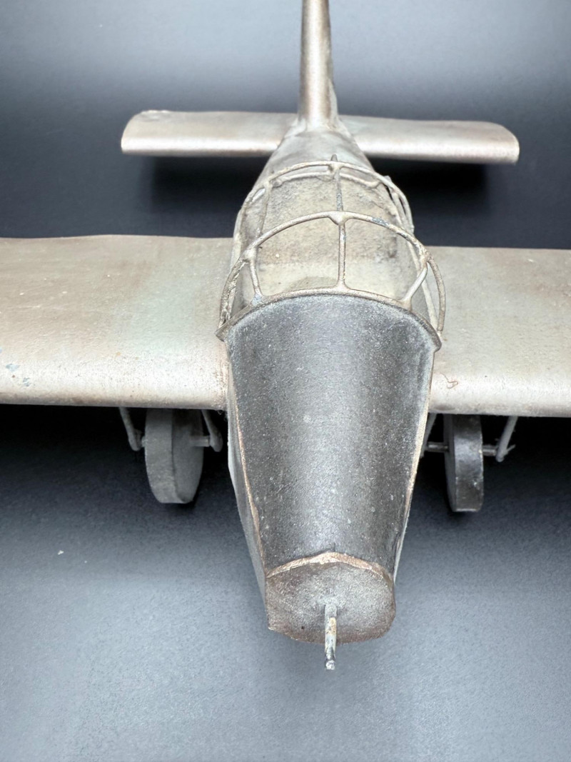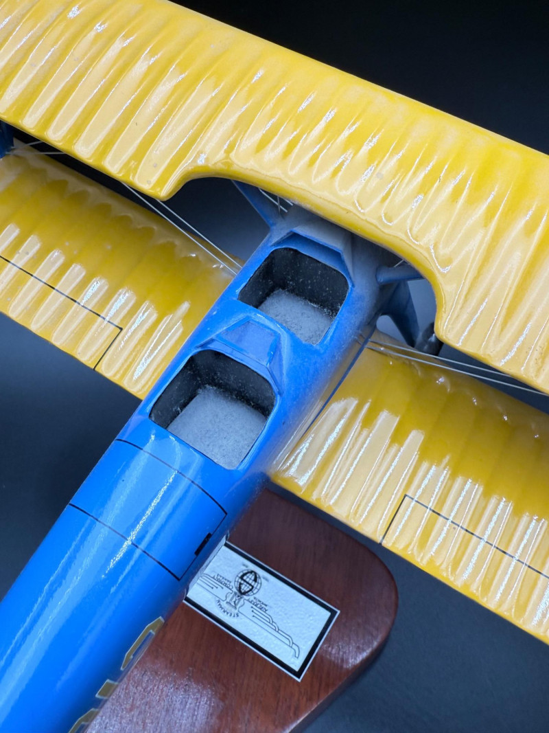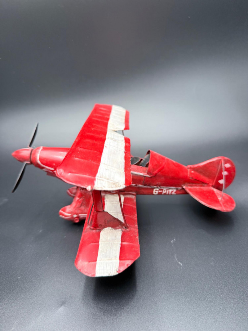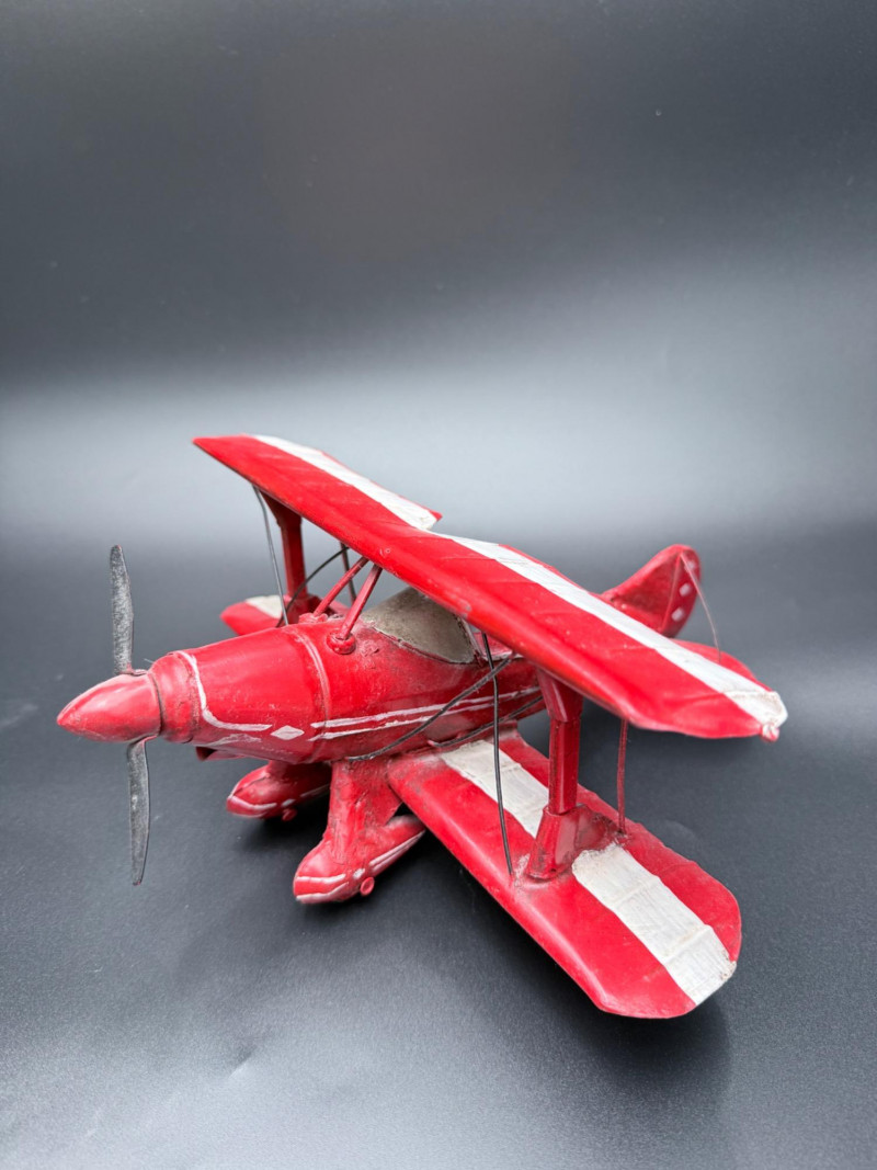 Three Model Aircraft – Stearman Trainer, Red Biplane & Japanese Zero Set of three handcrafted aircraft models representing distinct aviation styles. The first is a wooden biplane with blue fuselage, yellow wings, and U.S. military insignia, mounted on a display base labeled “Stearman Aircraft Company, Wichita Kansas,” referencing the Boeing-Stearman Model 75. The second is a red-painted metal biplane with fixed landing gear and dual wings, evoking early 20th-century barnstormer aircraft. The third is a metal monoplane painted in silver-gray with red roundels on each wing, referencing the Mitsubishi A6M Zero. Measurements: Stearman biplane (wood): 17" W x 12" D x 10" H Red biplane (metal): 10.5" wingspan x 11" W Silver monoplane (metal): 16" wingspan x 10" W