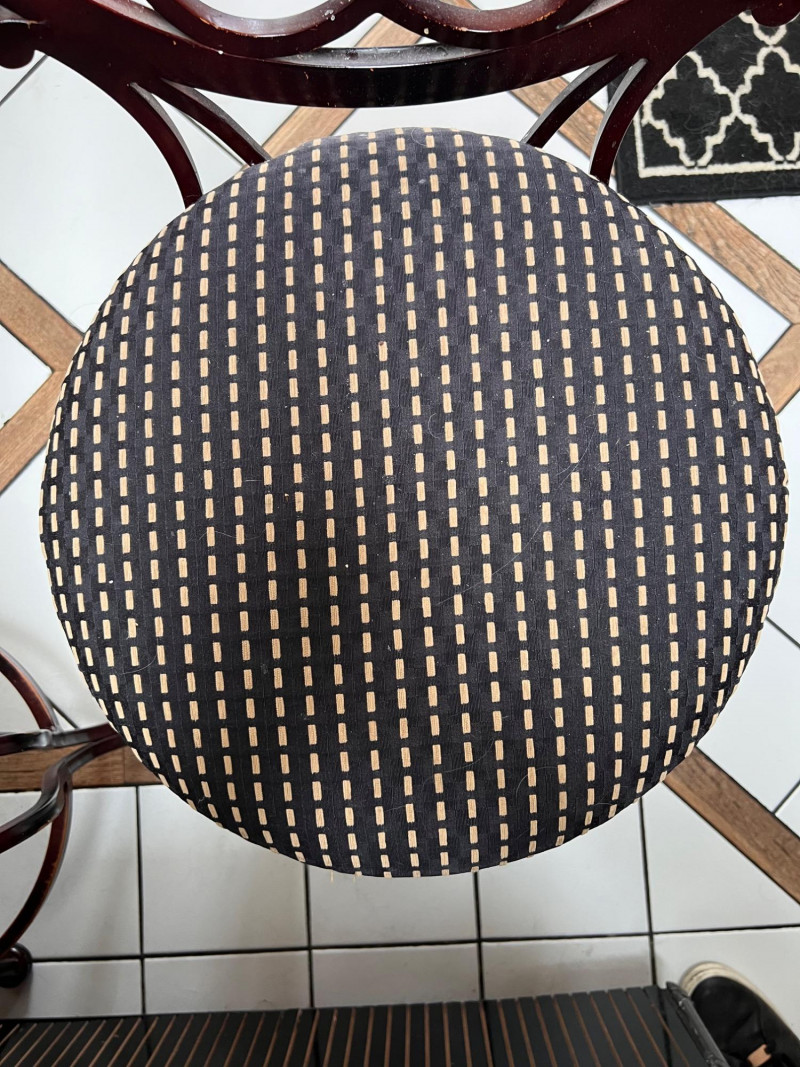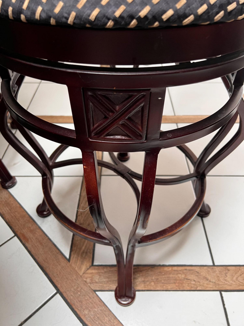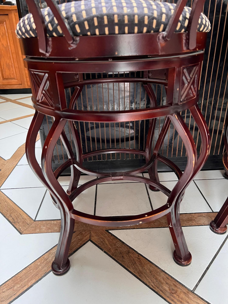 Set of Four Swivel Kitchen Barstools Each barstool is constructed with a wood frame and features a swivel seat upholstered in a patterned fabric. The backrest displays an open oval design with scroll detailing, while the apron includes square carved panels. The frame is supported by four curved legs connected by a circular footrest ring and X-form stretchers. Dimensions: