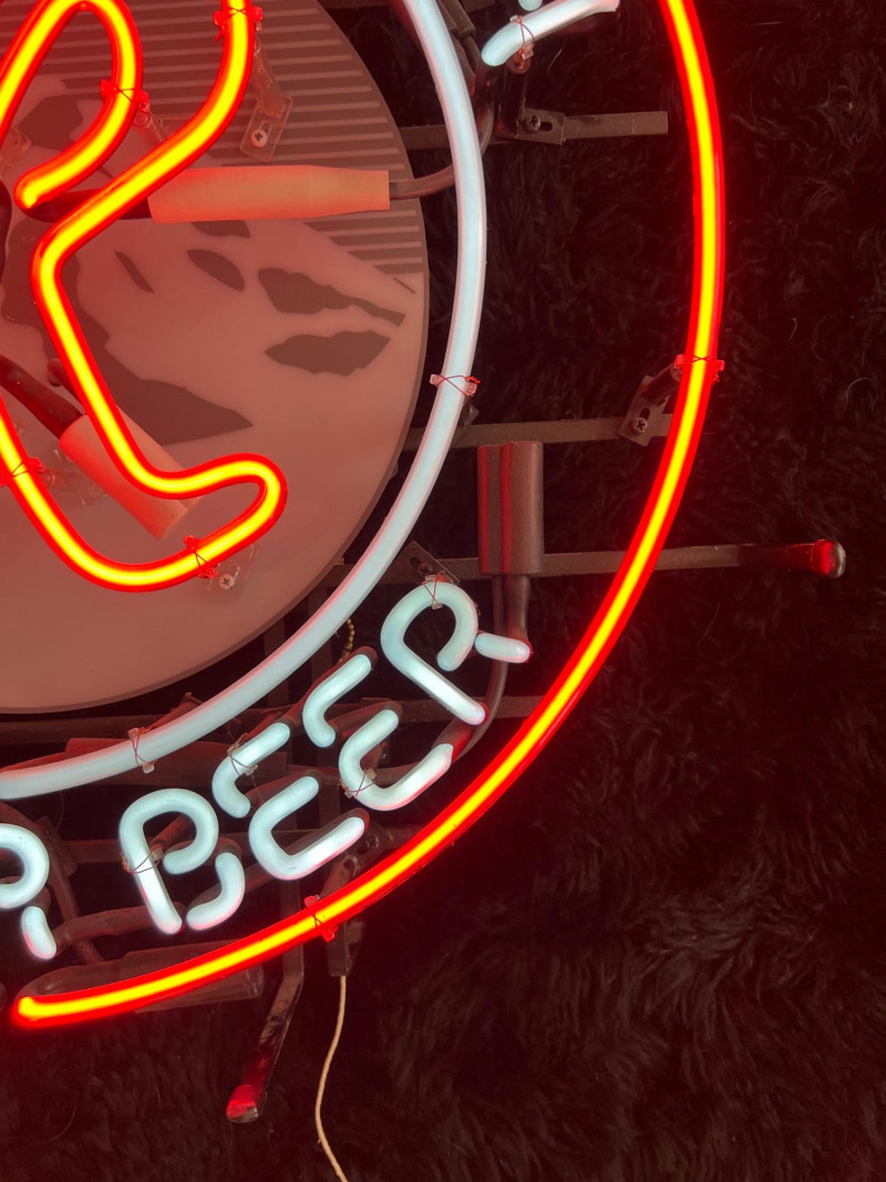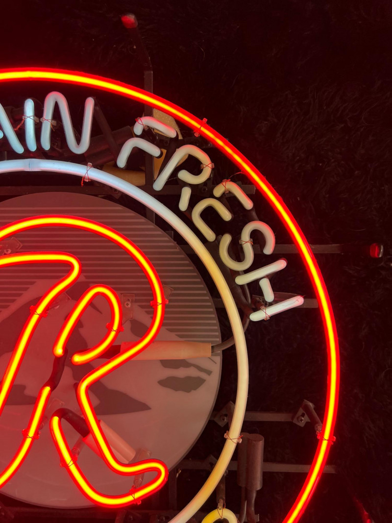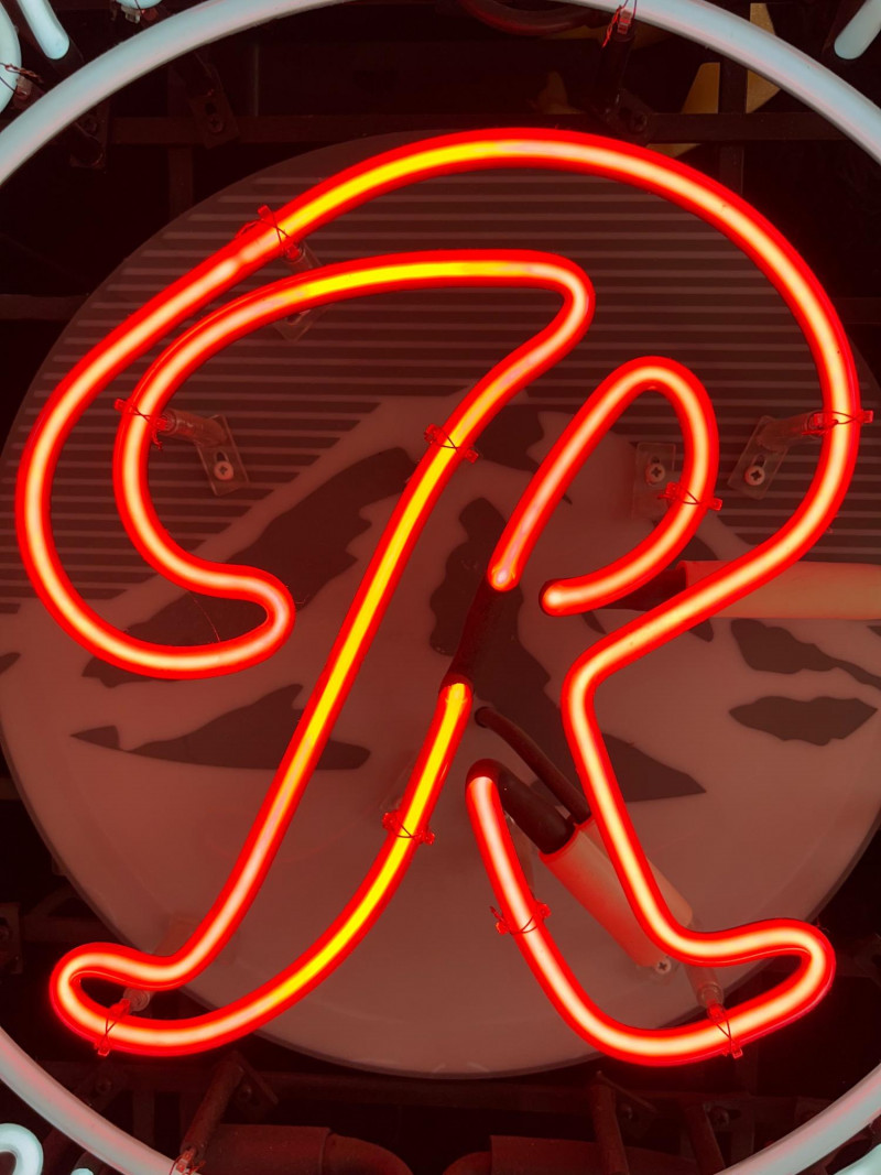 Mountain Fresh Rainier Beer Neon Sign Round neon sign displaying the Rainier Beer logo. Features a red neon “R” at the center, encircled by the words “MOUNTAIN FRESH” and “RAINIER BEER” in white tubing. Mounted on a circular backing with metal support frame and includes pull-chain and dimmer switch. Dimensions: 24" W x 24" H
