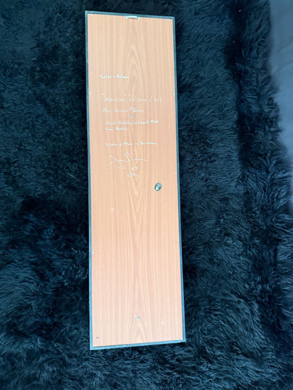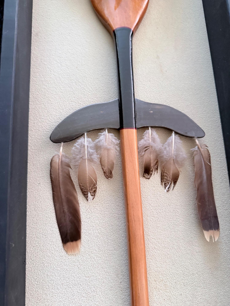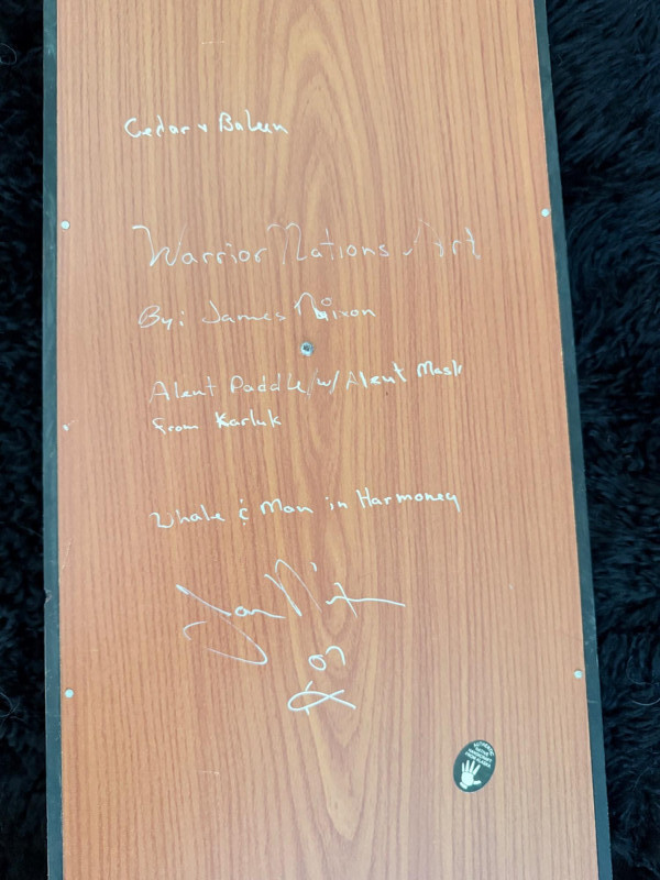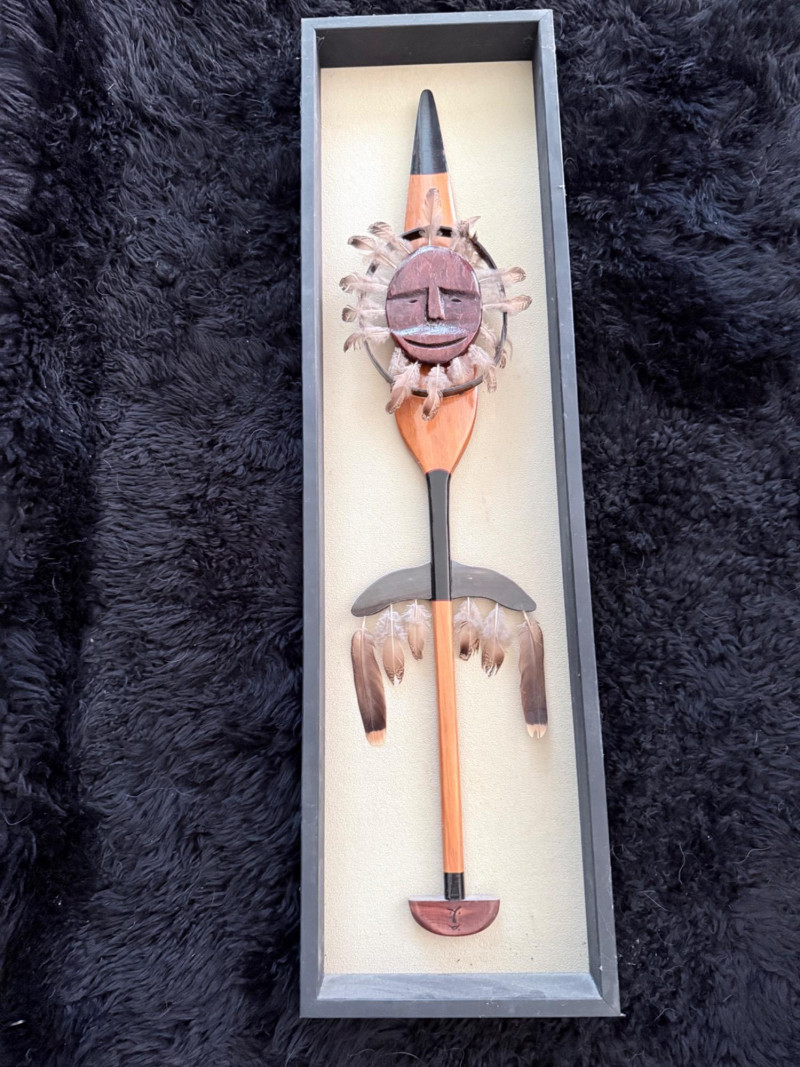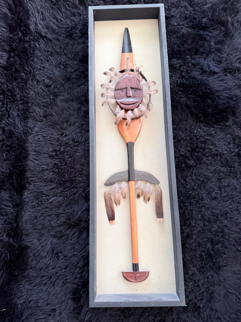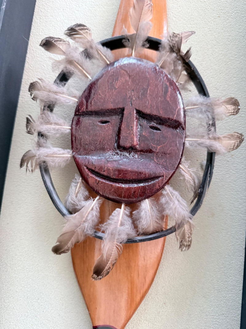 Warrior Nations Art – Aleut Paddle with Mask by James Nixon (2007) Wall-mounted sculptural artwork featuring a long-form wooden paddle with a central carved mask framed in a ring of feathers. The shaft integrates a black-painted midsection and crosspiece with suspended feathers, tapering to a rounded blade with incised detail. Made from cedar and balsam wood. Signed and inscribed on verso: Label: Authentic Native Handcraft from Alaska Dimensions: