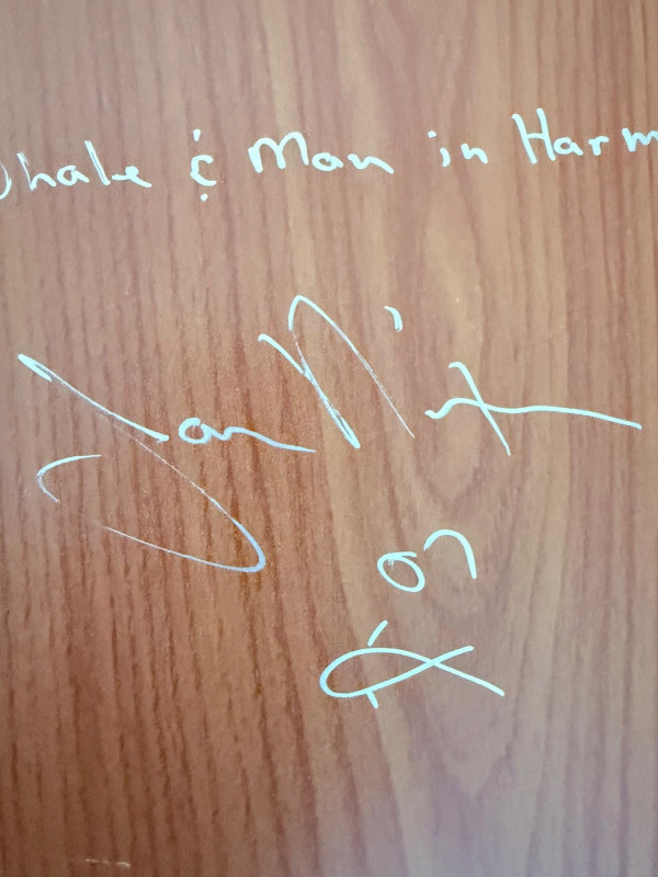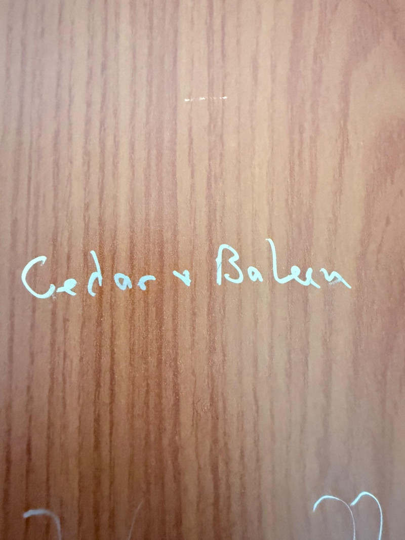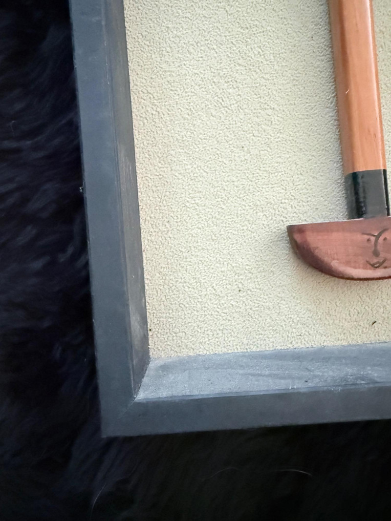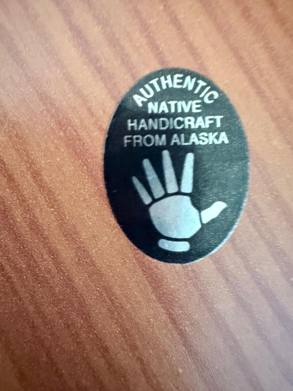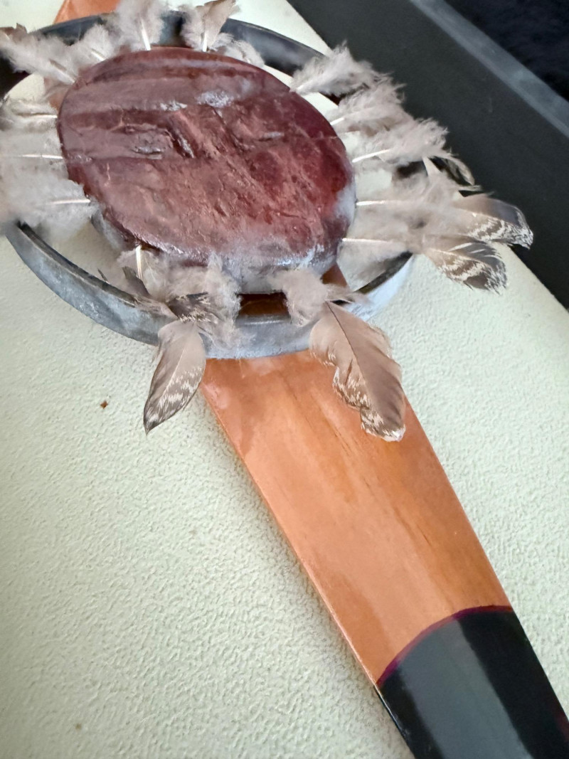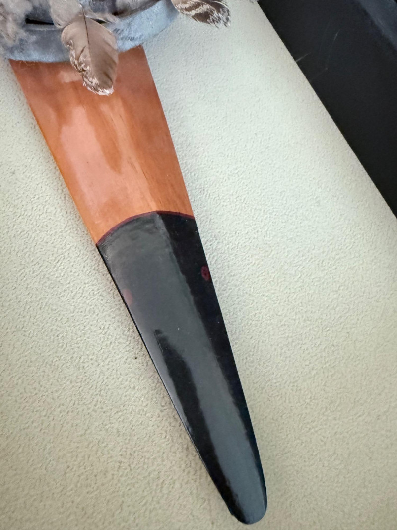 Warrior Nations Art – Aleut Paddle with Mask by James Nixon (2007) Wall-mounted sculptural artwork featuring a long-form wooden paddle with a central carved mask framed in a ring of feathers. The shaft integrates a black-painted midsection and crosspiece with suspended feathers, tapering to a rounded blade with incised detail. Made from cedar and balsam wood. Signed and inscribed on verso: Label: Authentic Native Handcraft from Alaska Dimensions: