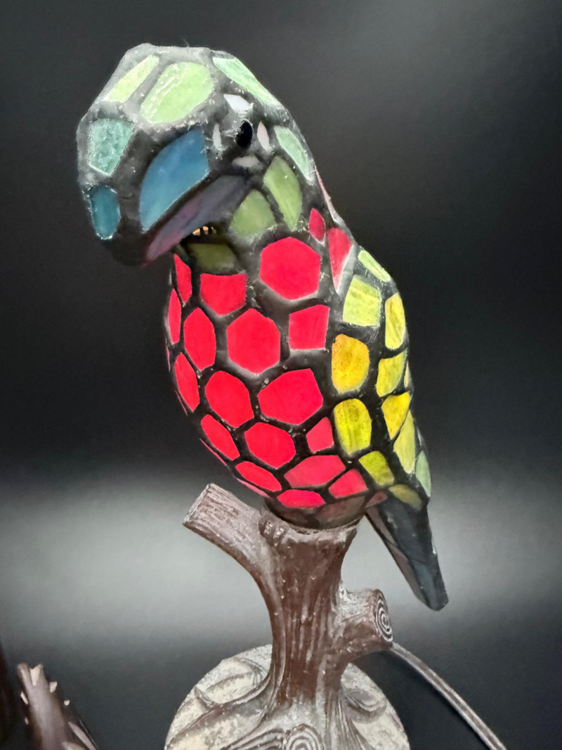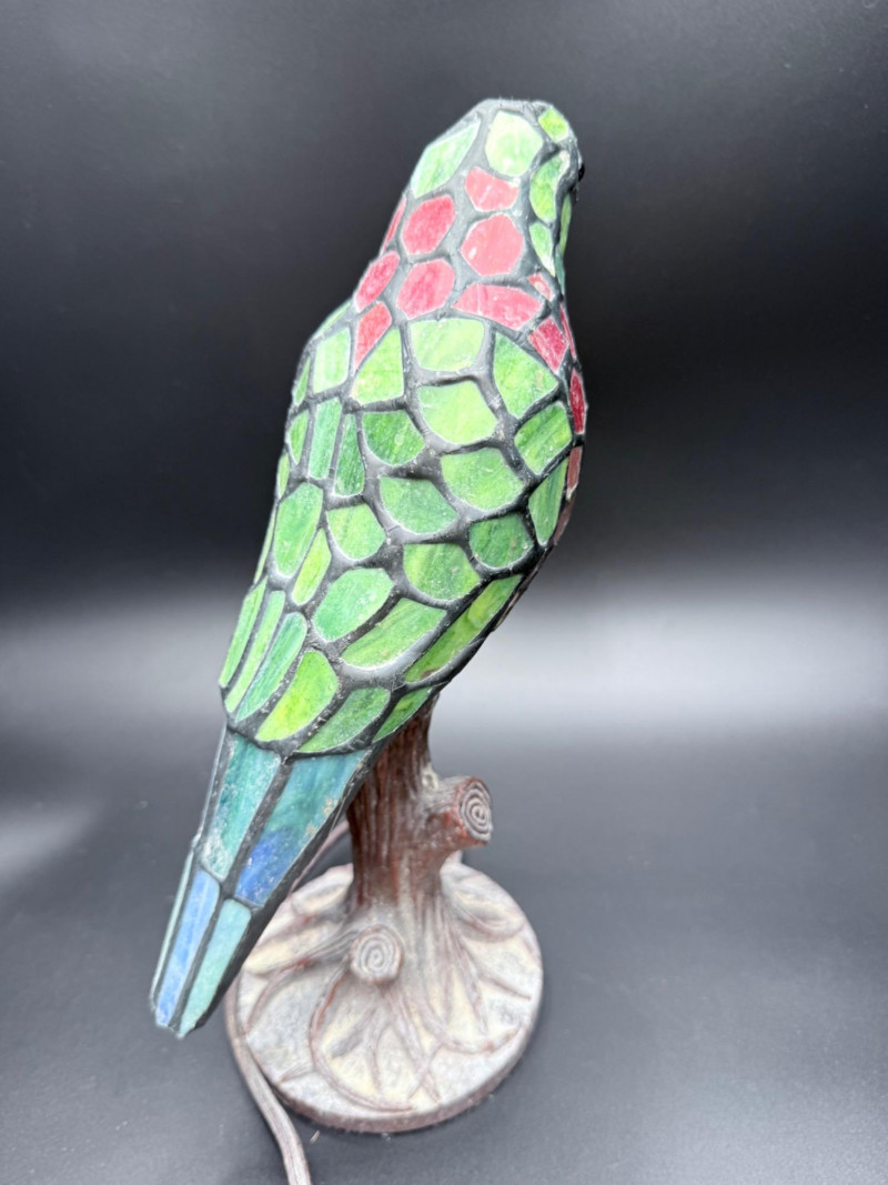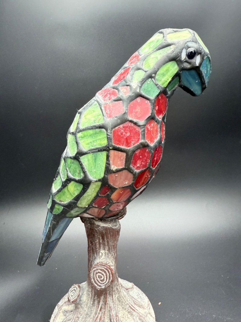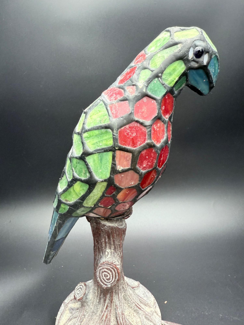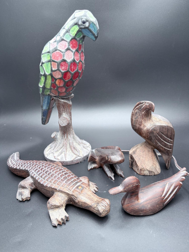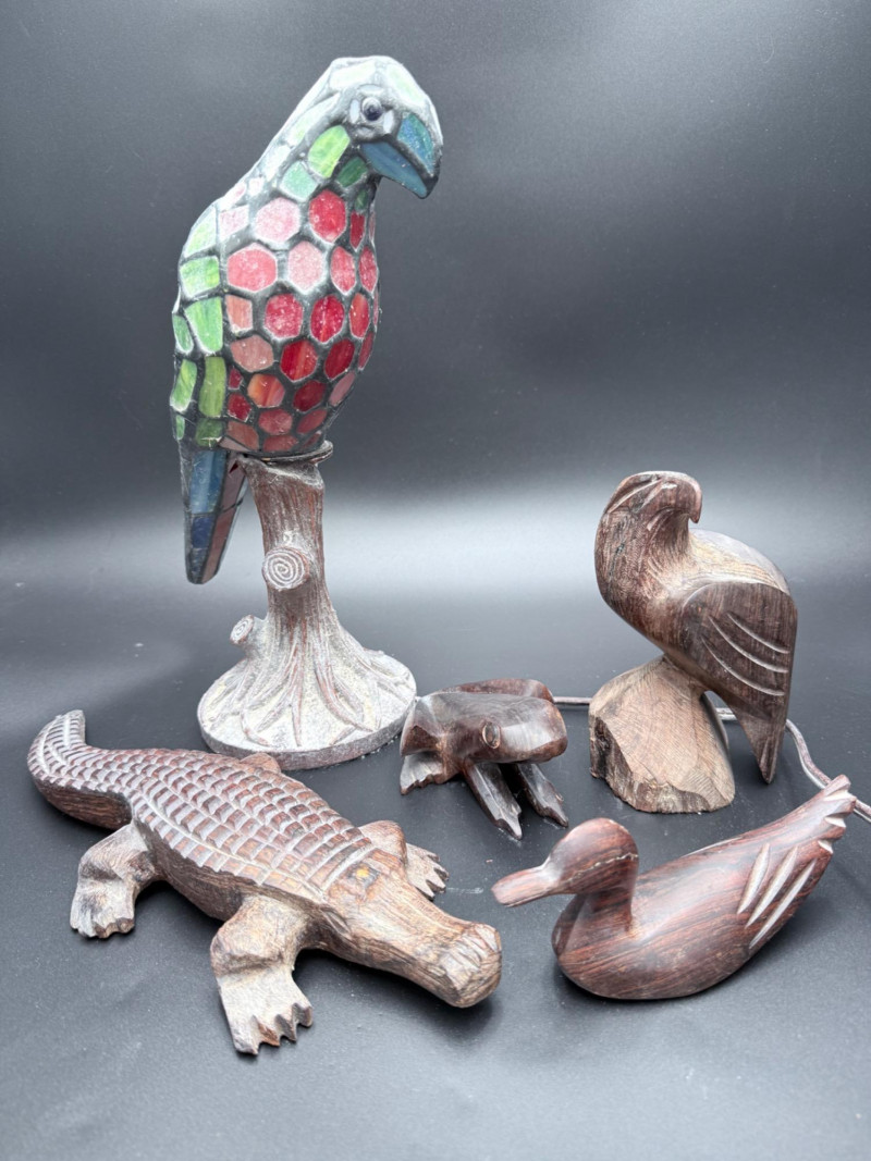 Stained Glass Parrot Lamp and Hand-Carved Wooden Animal Figures A group of decorative objects composed of a stained glass parrot lamp and five carved wooden animals. The parrot lamp features a glass mosaic shade in the form of a bird perched on a tree branch. It is equipped with a wired socket and switch. The design is likely Tiffany-style. The wooden figures include a carved alligator, a bird of prey, a duck, and a frog. The duck is likely made of ironwood, while the others are shaped from solid hardwood. Each figure is rendered with distinct forms and postures. Set includes: Stained glass parrot lamp – 13" tall x 5" base diameter, likely Tiffany-style Carved alligator – 13" long Carved hawk – 6.5" tall x 3" wide Carved duck – 6" long, likely ironwood Carved frog – 5.5" wide Note: Parrot lamp light is in working condition.