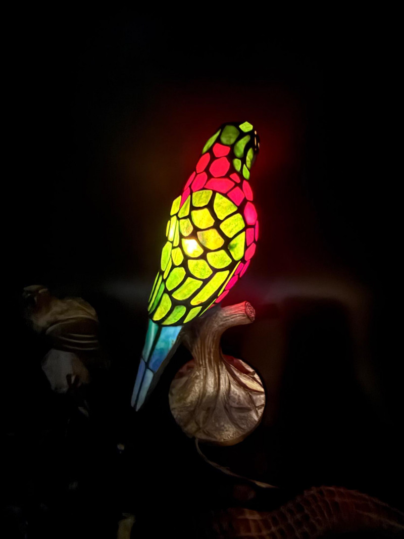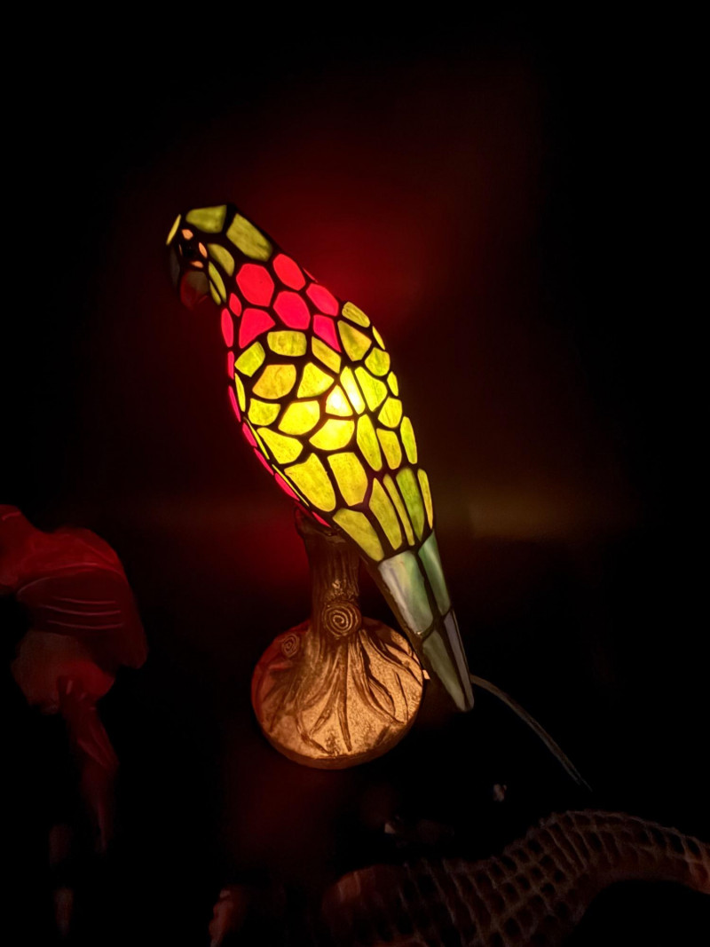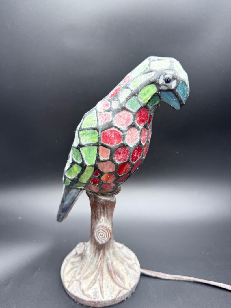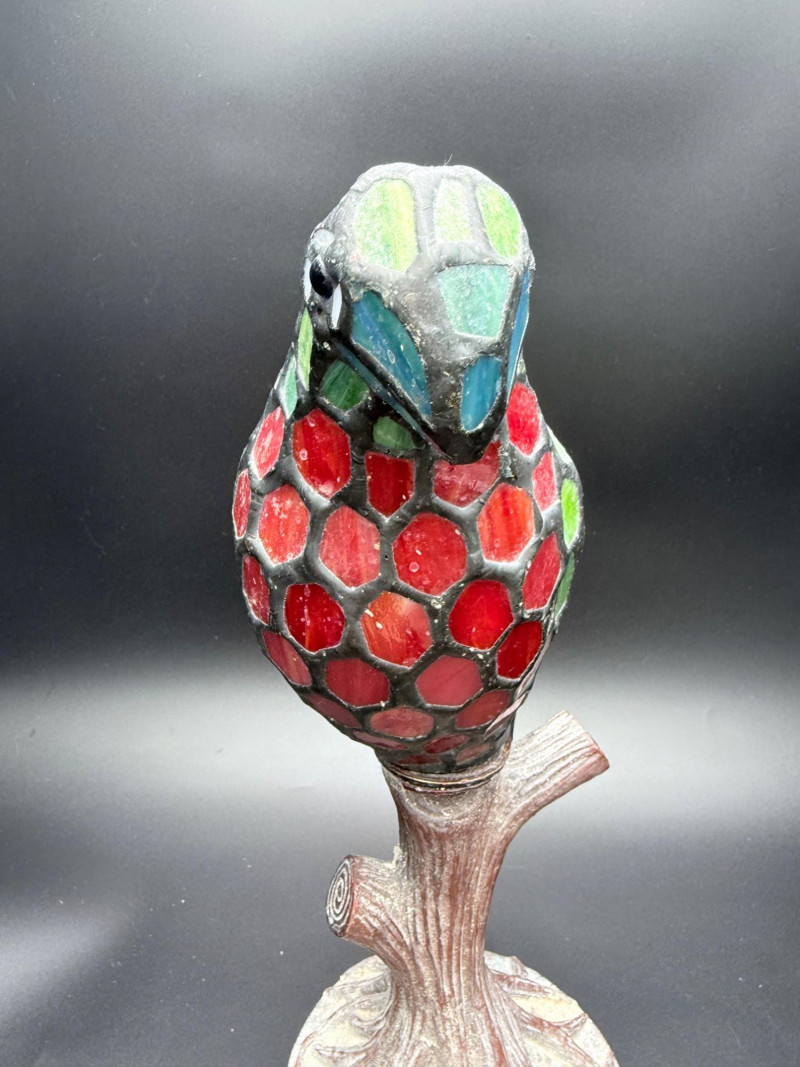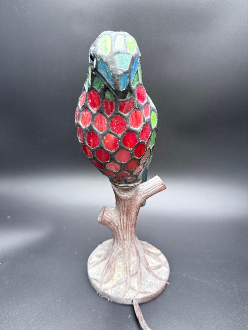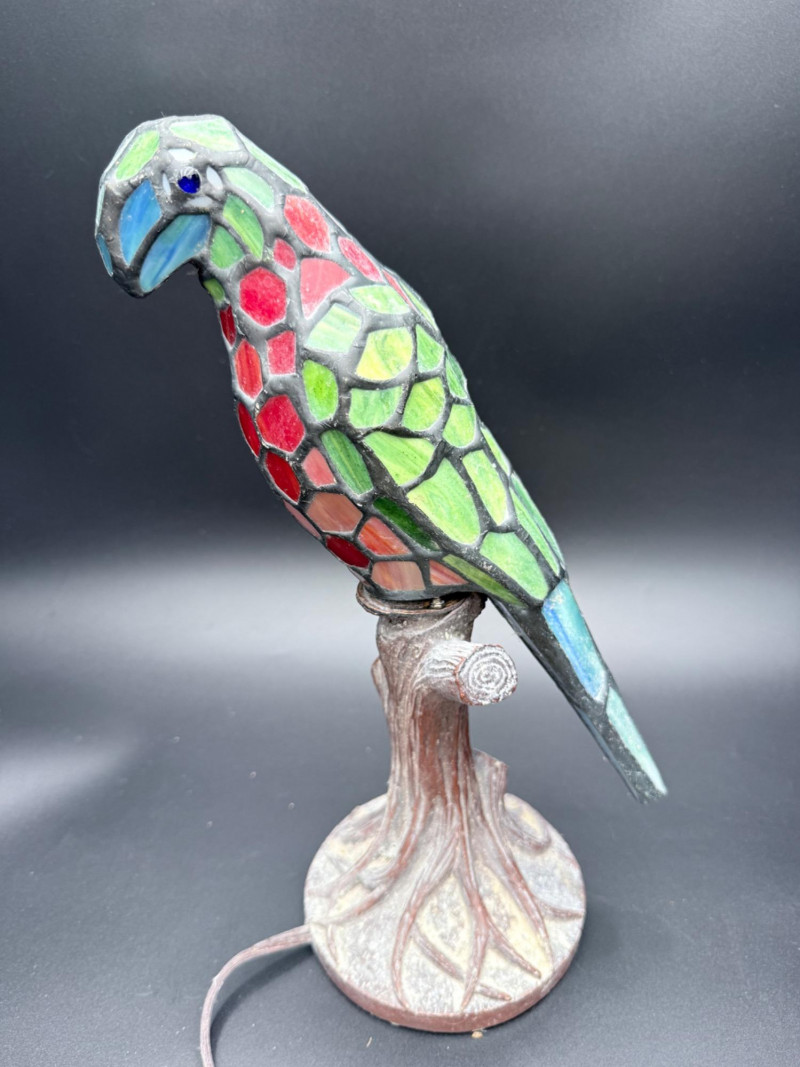 Stained Glass Parrot Lamp and Hand-Carved Wooden Animal Figures A group of decorative objects composed of a stained glass parrot lamp and five carved wooden animals. The parrot lamp features a glass mosaic shade in the form of a bird perched on a tree branch. It is equipped with a wired socket and switch. The design is likely Tiffany-style. The wooden figures include a carved alligator, a bird of prey, a duck, and a frog. The duck is likely made of ironwood, while the others are shaped from solid hardwood. Each figure is rendered with distinct forms and postures. Set includes: Stained glass parrot lamp – 13" tall x 5" base diameter, likely Tiffany-style Carved alligator – 13" long Carved hawk – 6.5" tall x 3" wide Carved duck – 6" long, likely ironwood Carved frog – 5.5" wide Note: Parrot lamp light is in working condition.