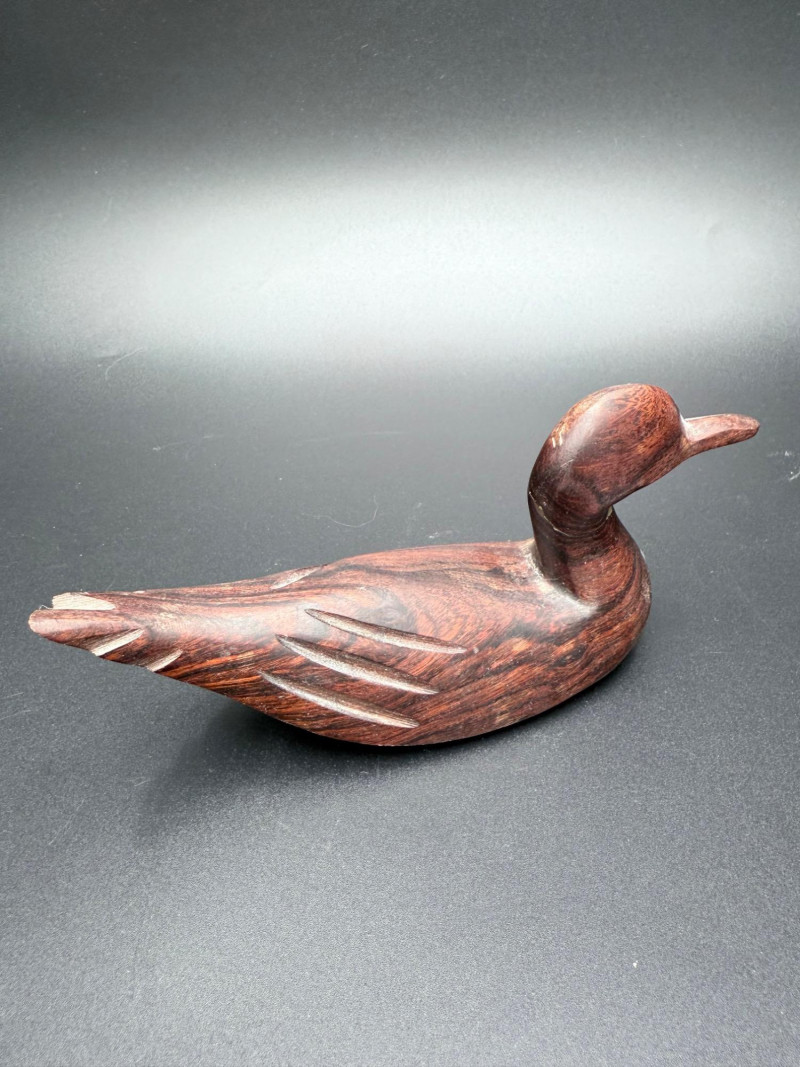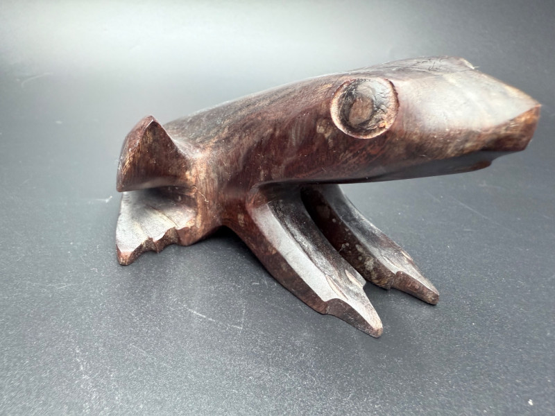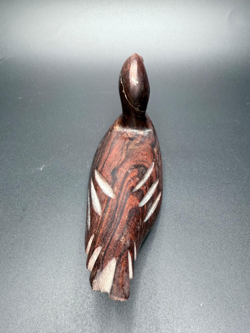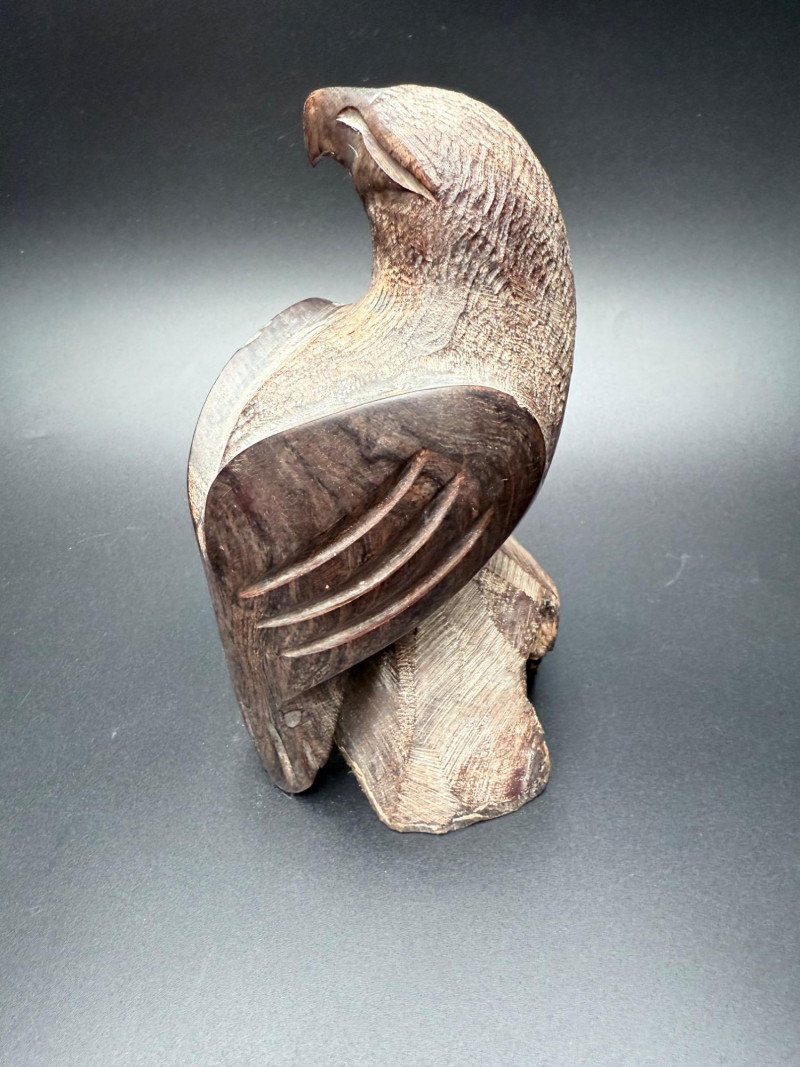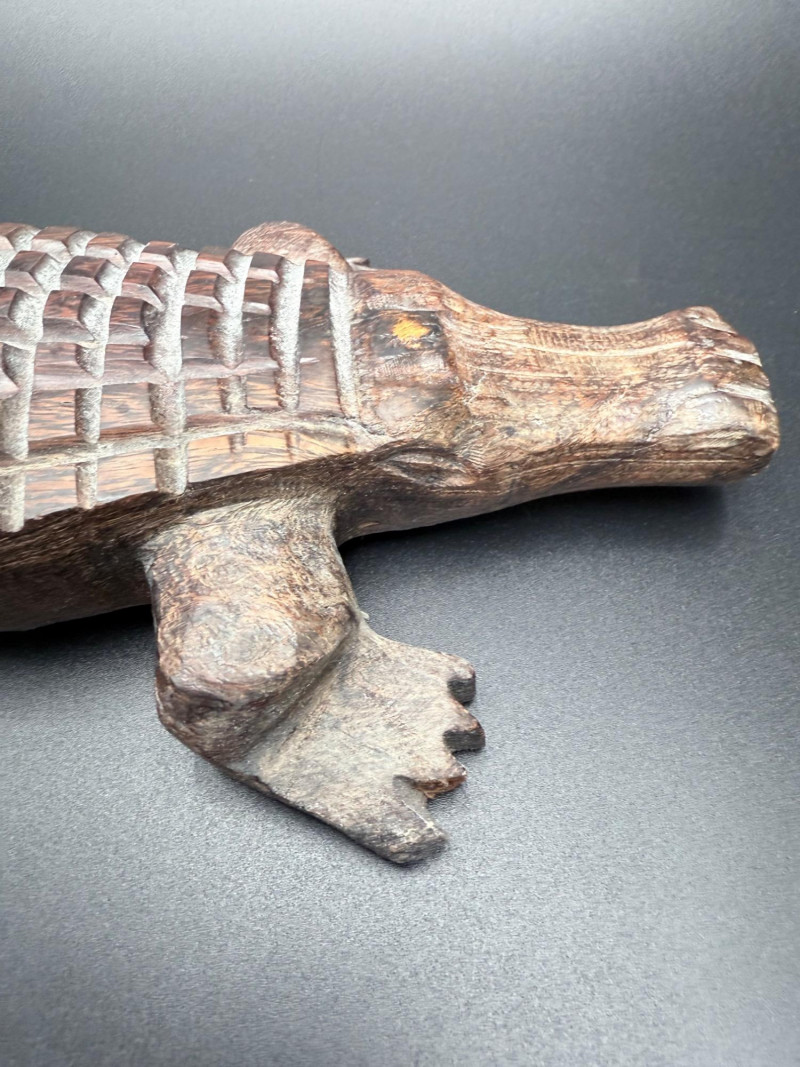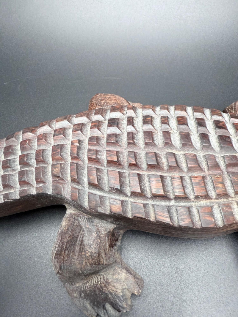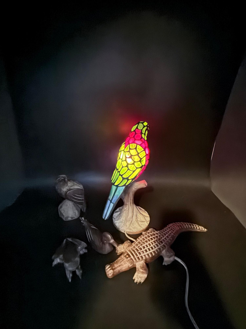 Stained Glass Parrot Lamp and Hand-Carved Wooden Animal Figures A group of decorative objects composed of a stained glass parrot lamp and five carved wooden animals. The parrot lamp features a glass mosaic shade in the form of a bird perched on a tree branch. It is equipped with a wired socket and switch. The design is likely Tiffany-style. The wooden figures include a carved alligator, a bird of prey, a duck, and a frog. The duck is likely made of ironwood, while the others are shaped from solid hardwood. Each figure is rendered with distinct forms and postures. Set includes: Stained glass parrot lamp – 13" tall x 5" base diameter, likely Tiffany-style Carved alligator – 13" long Carved hawk – 6.5" tall x 3" wide Carved duck – 6" long, likely ironwood Carved frog – 5.5" wide Note: Parrot lamp light is in working condition.