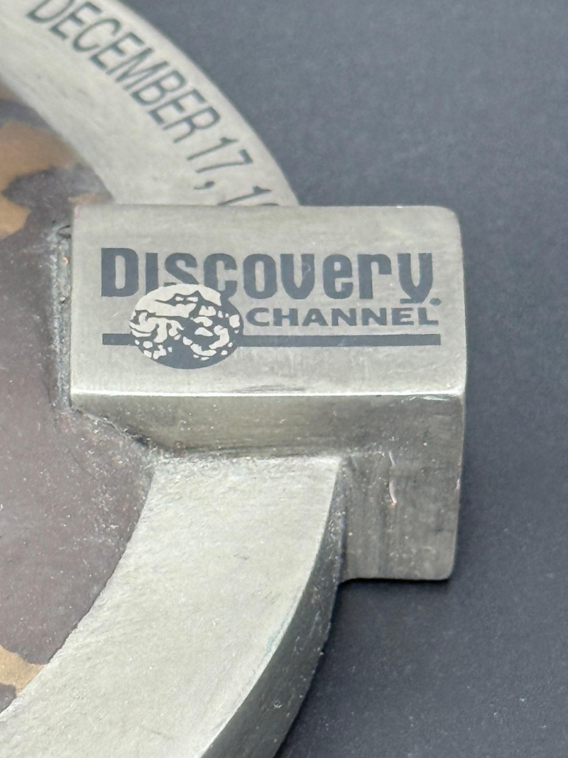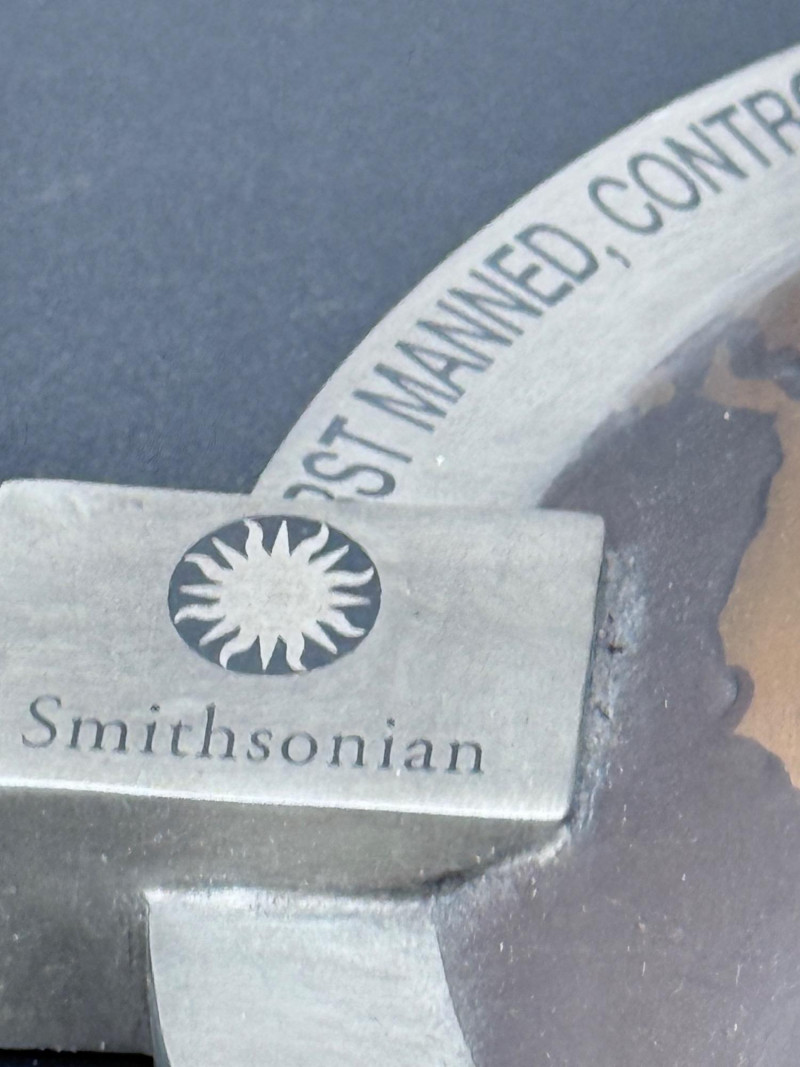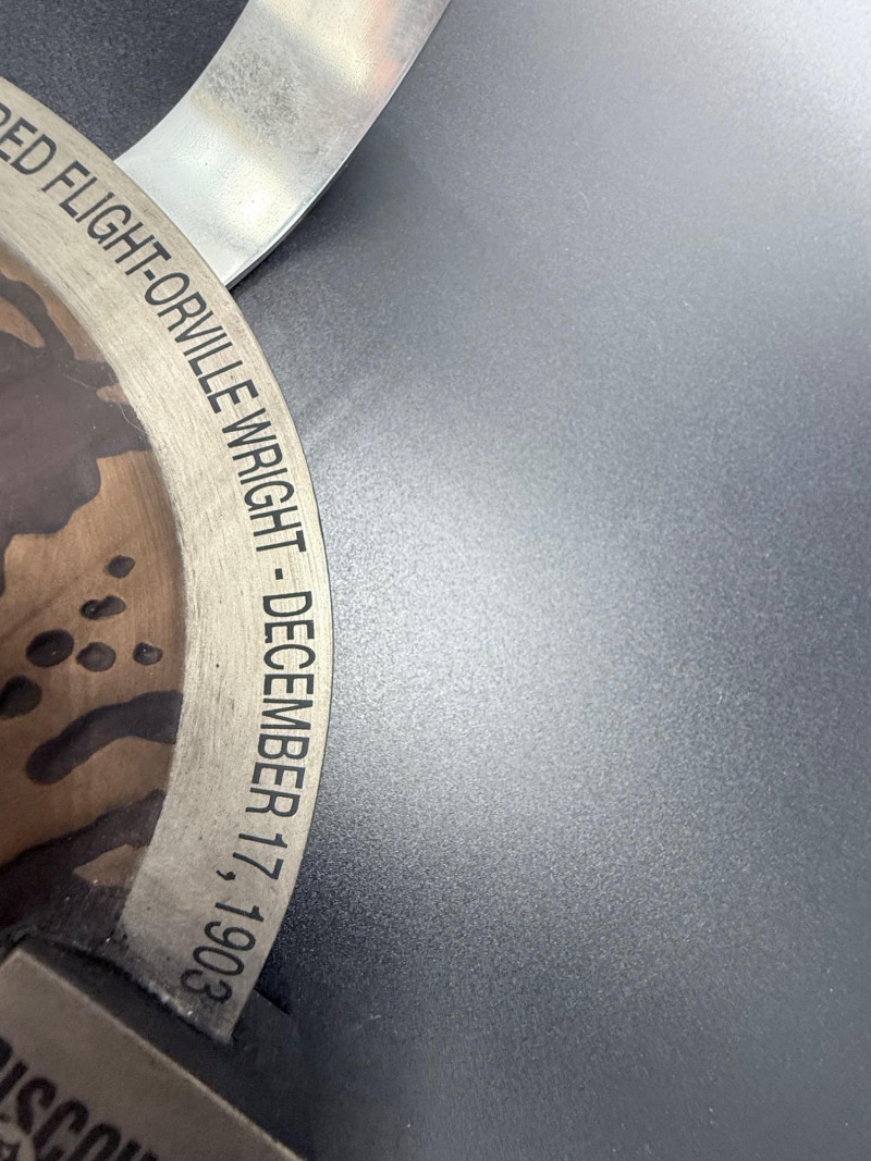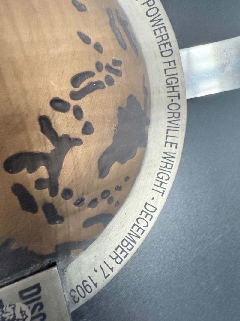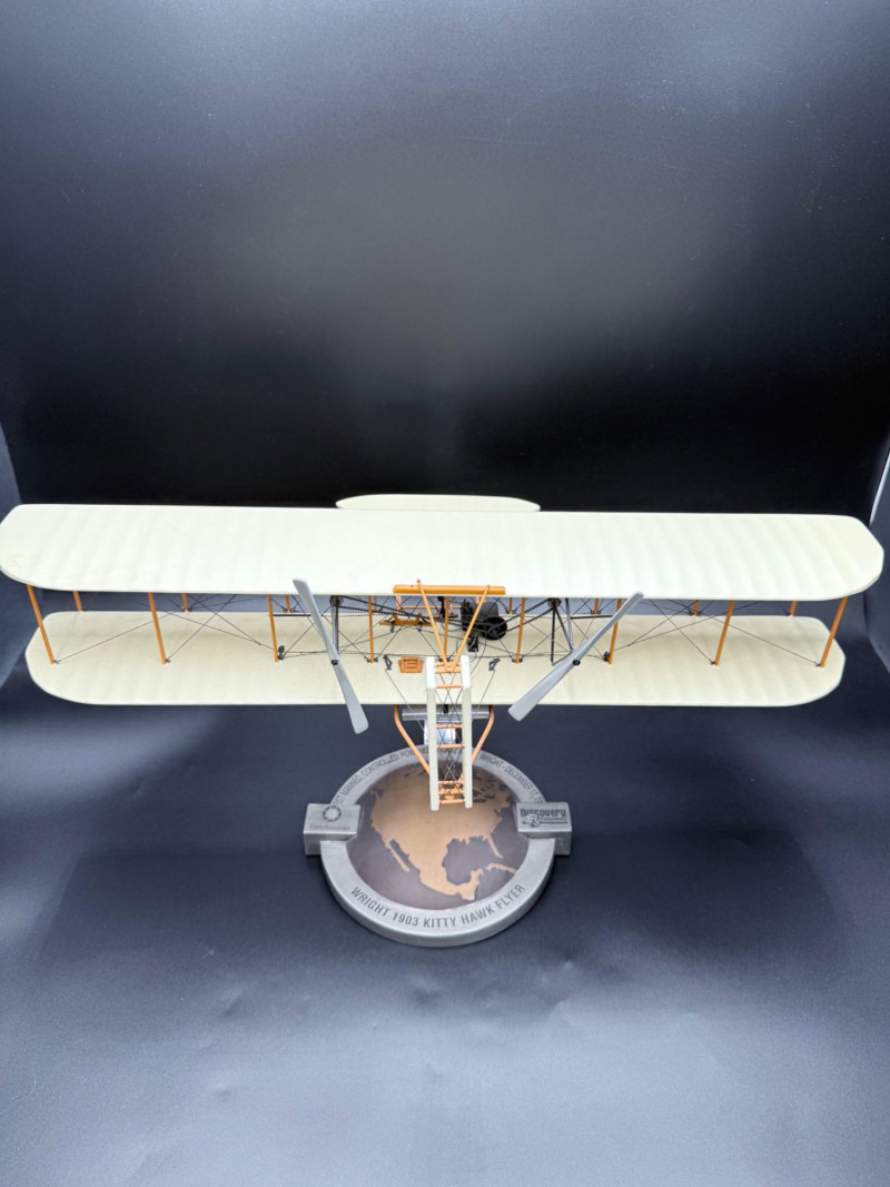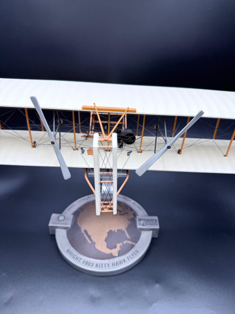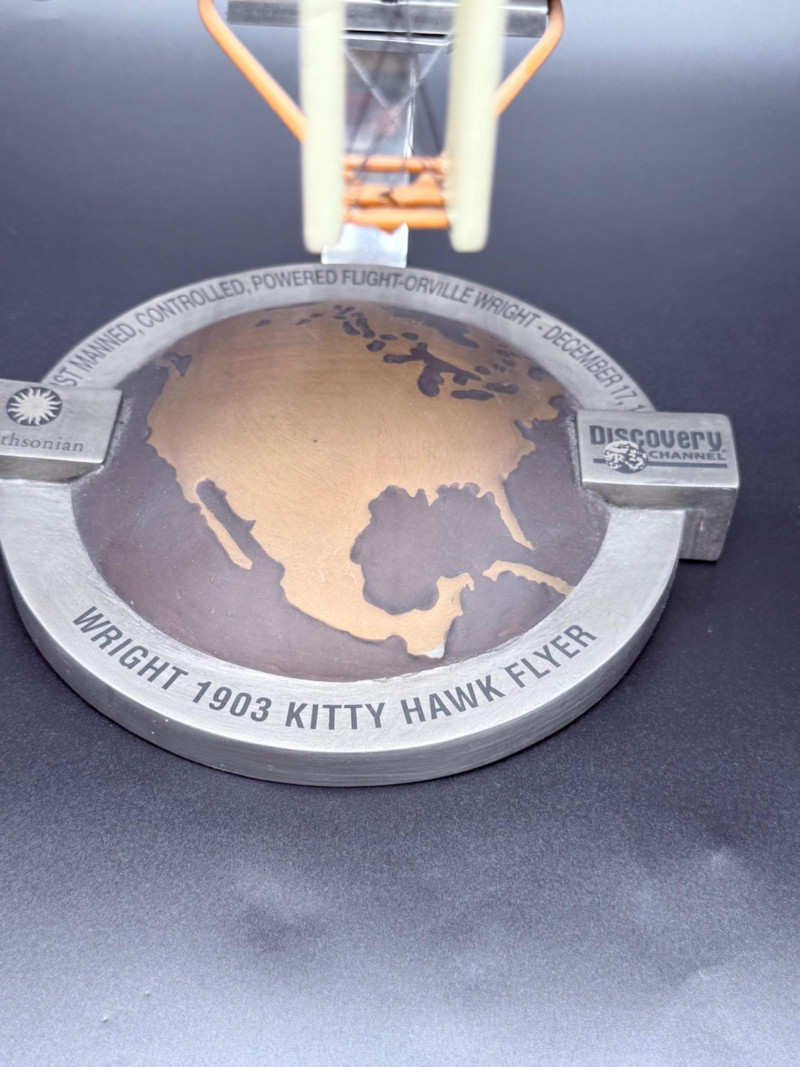 Wright 1903 Kitty Hawk Flyer Model – Smithsonian x Discovery Channel Replica model of the 1903 Wright Flyer, commemorating the first manned, controlled, and powered flight by Orville Wright on December 17, 1903, in Kitty Hawk, North Carolina. Constructed with twin wings, dual propellers, and structural rigging. Mounted on a round metal base featuring a relief map of North America and engraved text. Base is marked with Smithsonian and Discovery Channel logos. Dimensions: Wingspan: 20" Height: 10"