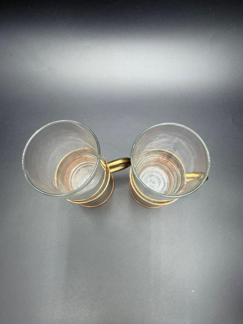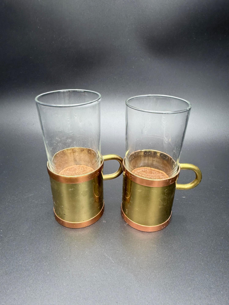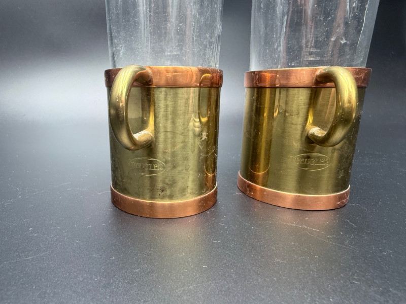 Clear cylindrical glasses fitted into brass and copper-tone holders with integrated handles. Marked “BEUCHLER.”