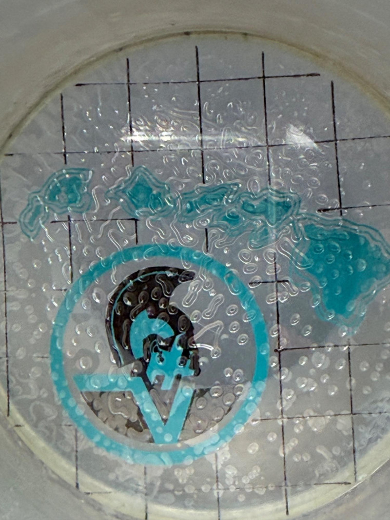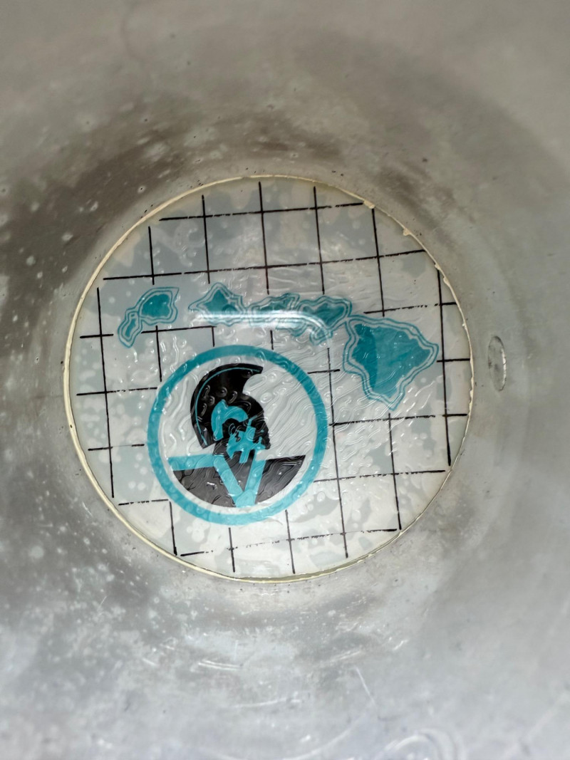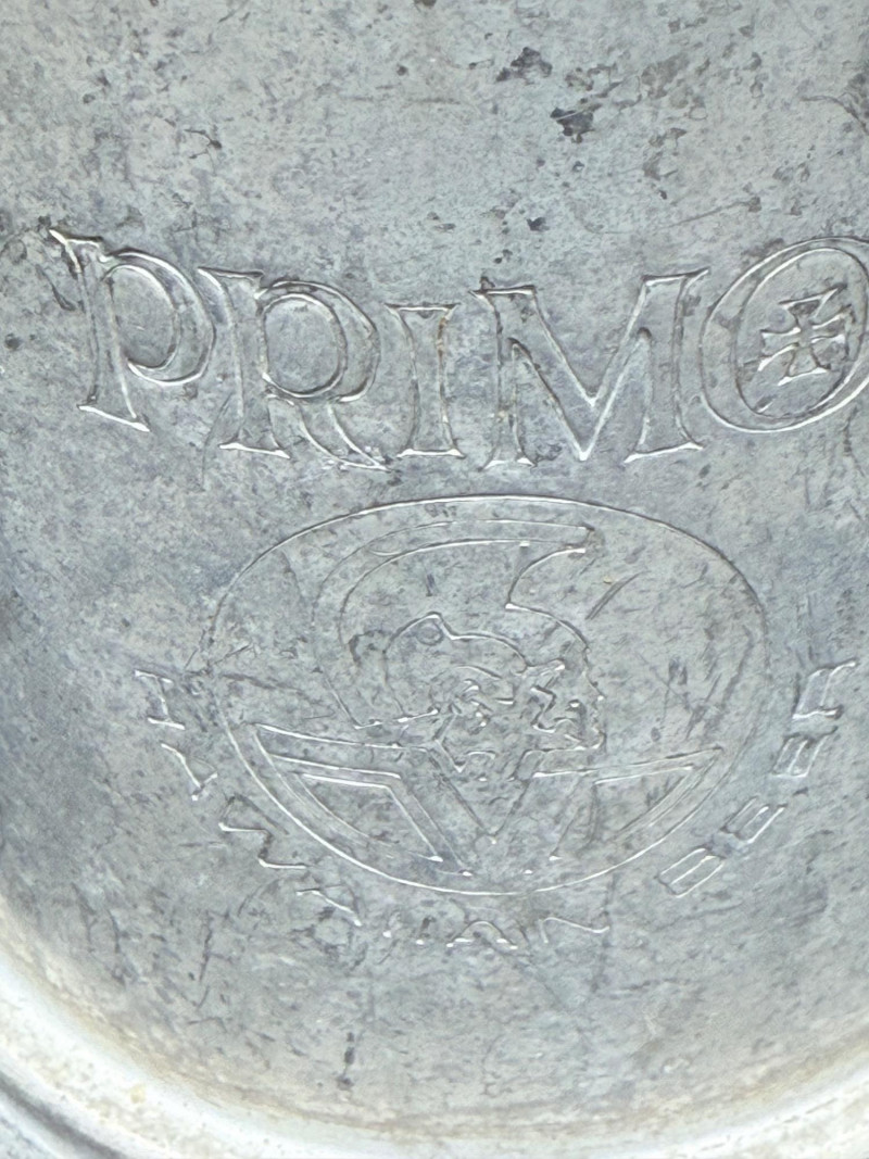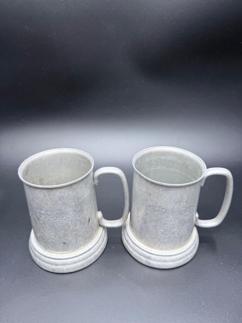 Brushed aluminum mugs with applied Primo Beer logo inside the base. Map of Hawaiian Islands visible beneath the logo.