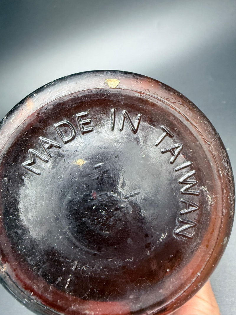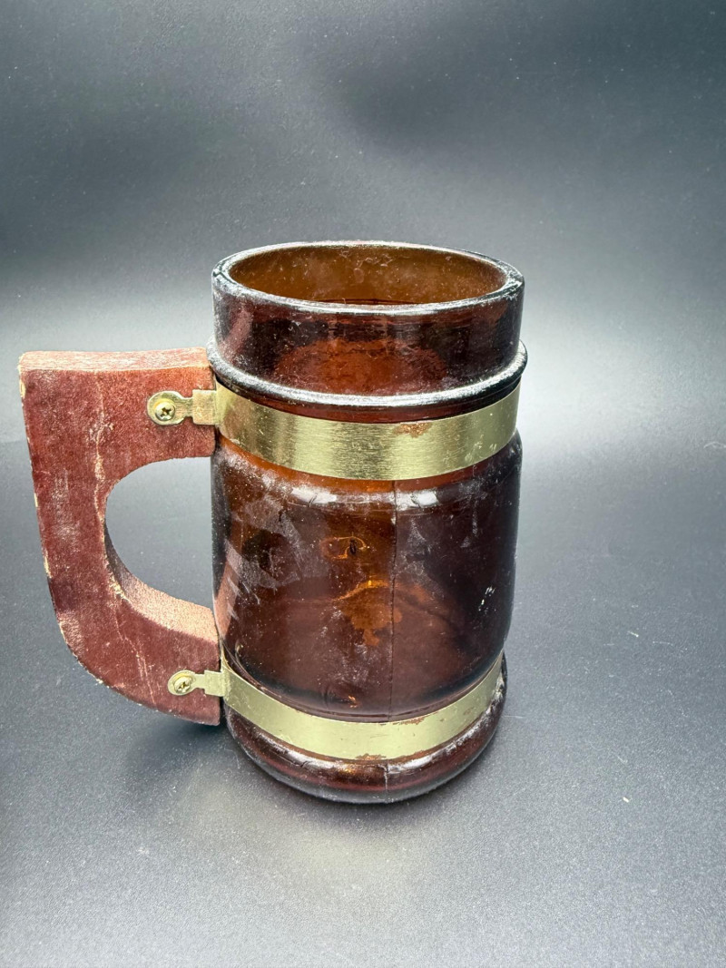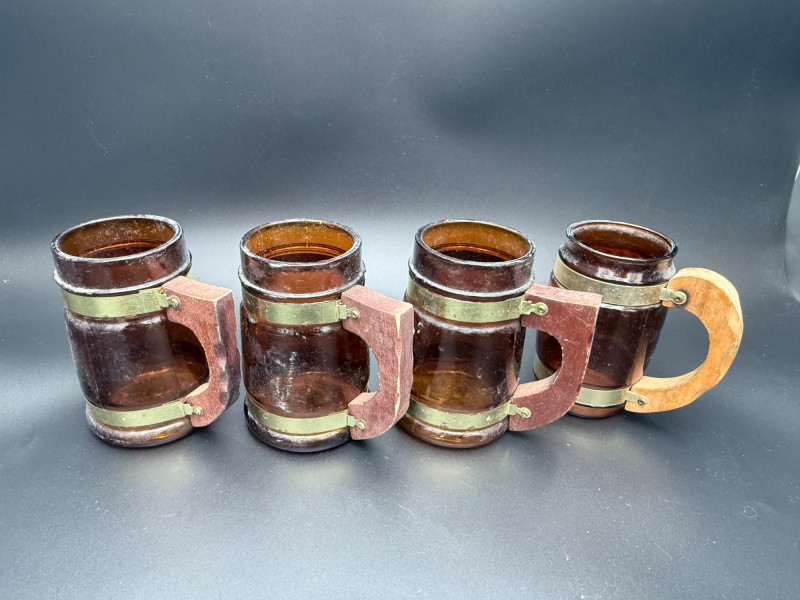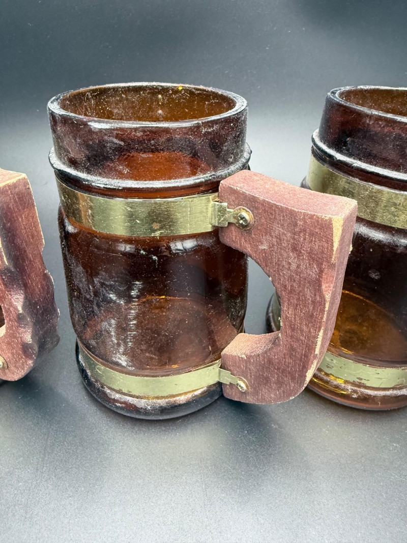 Brown glass mugs with wood handles and metal bands, marked "Made in Taiwan." Similar in style to Siesta Ware.