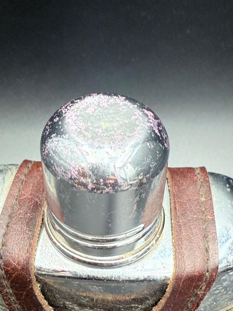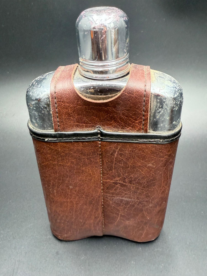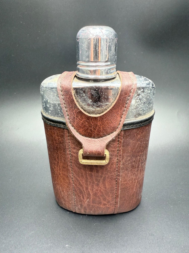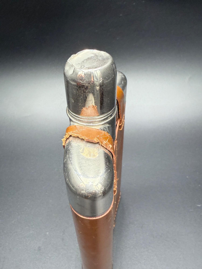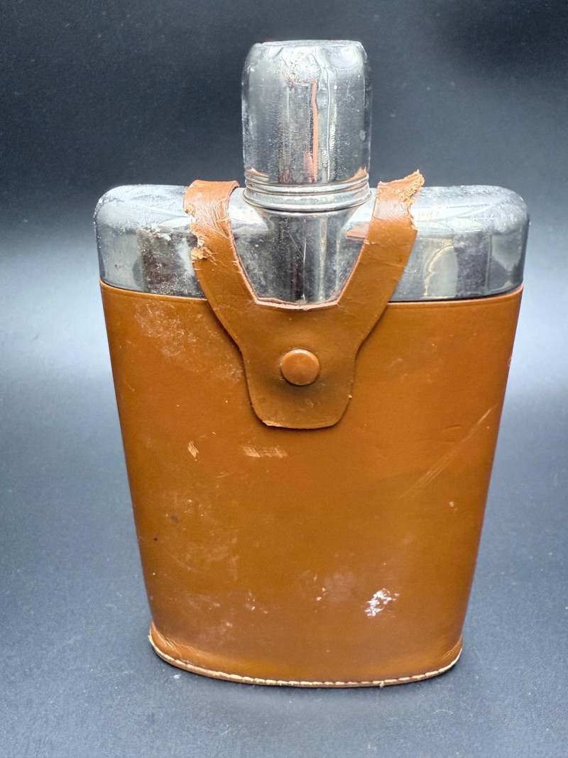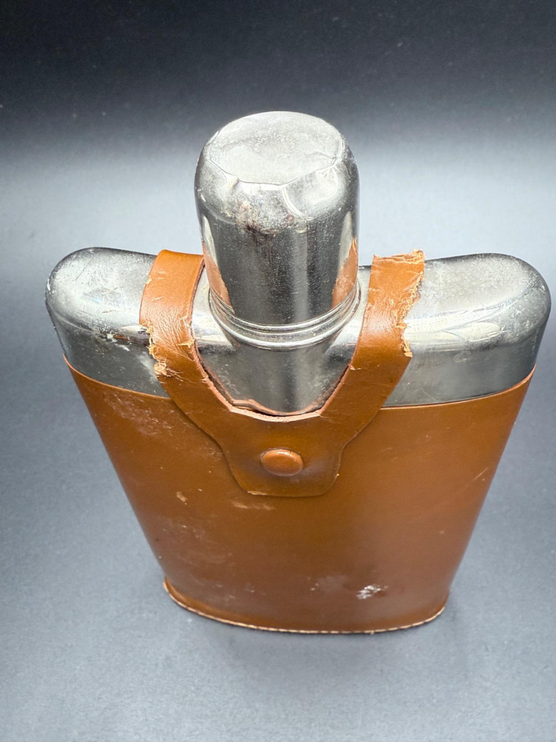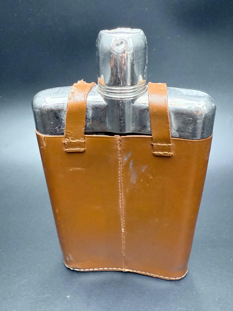 Metal-body flasks with screw-top lids, housed in stitched faux leather cases with strap closures.