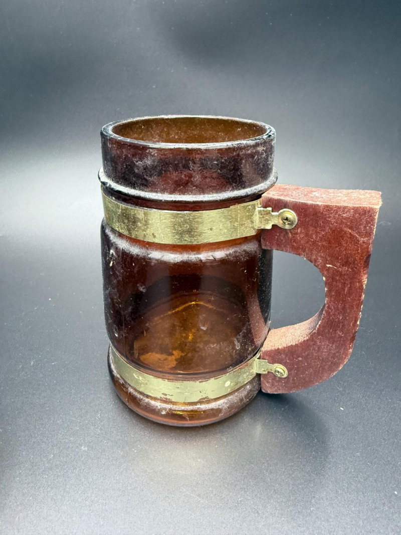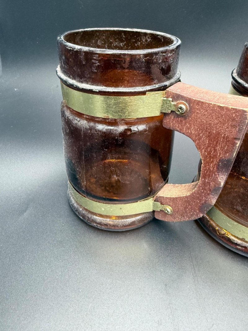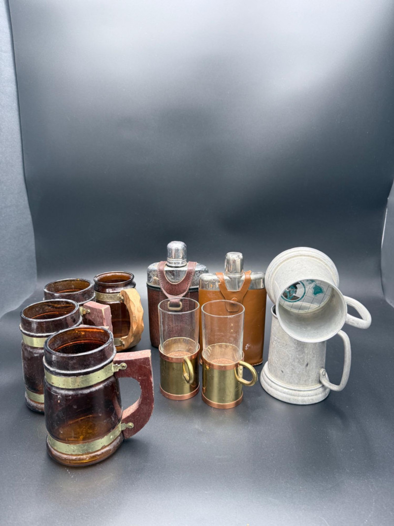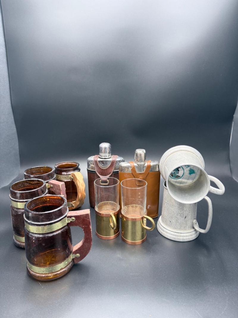 Barware Assortment – Primo Mugs, Beuchler Glasses and Flasks A mixed group of vintage barware featuring drinkware and flasks in glass, brass, aluminum, and faux leather. The collection includes Taiwan-made amber glass mugs similar in style to Siesta Ware, Beuchler brass-handled glasses, Primo aluminum beer mugs, and metal flasks in stitched cases. Set includes: 4 Amber Glass Mugs – 5.5" H 2 Beuchler Brass and Copper Glasses – 5" H 2 Primo Hawaiian Beer Aluminum Mugs – 4.5" 2 Vintage Flasks with Faux Leather Cases – 7" H