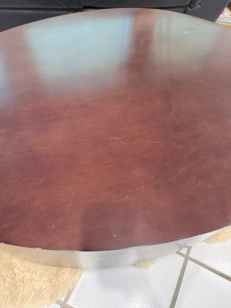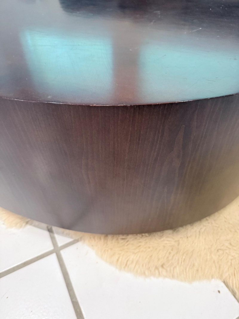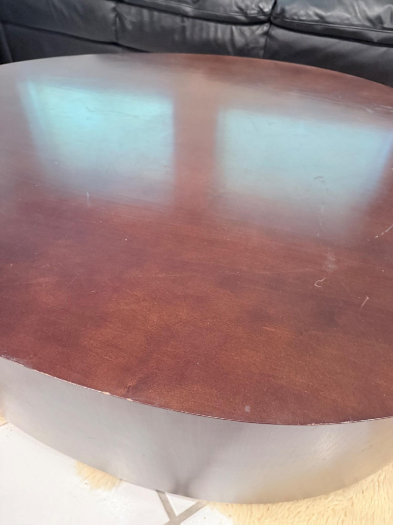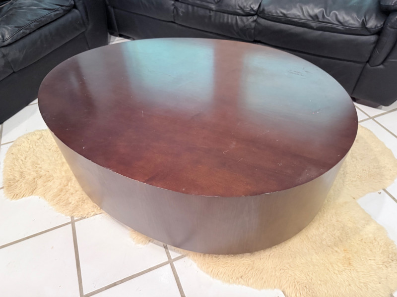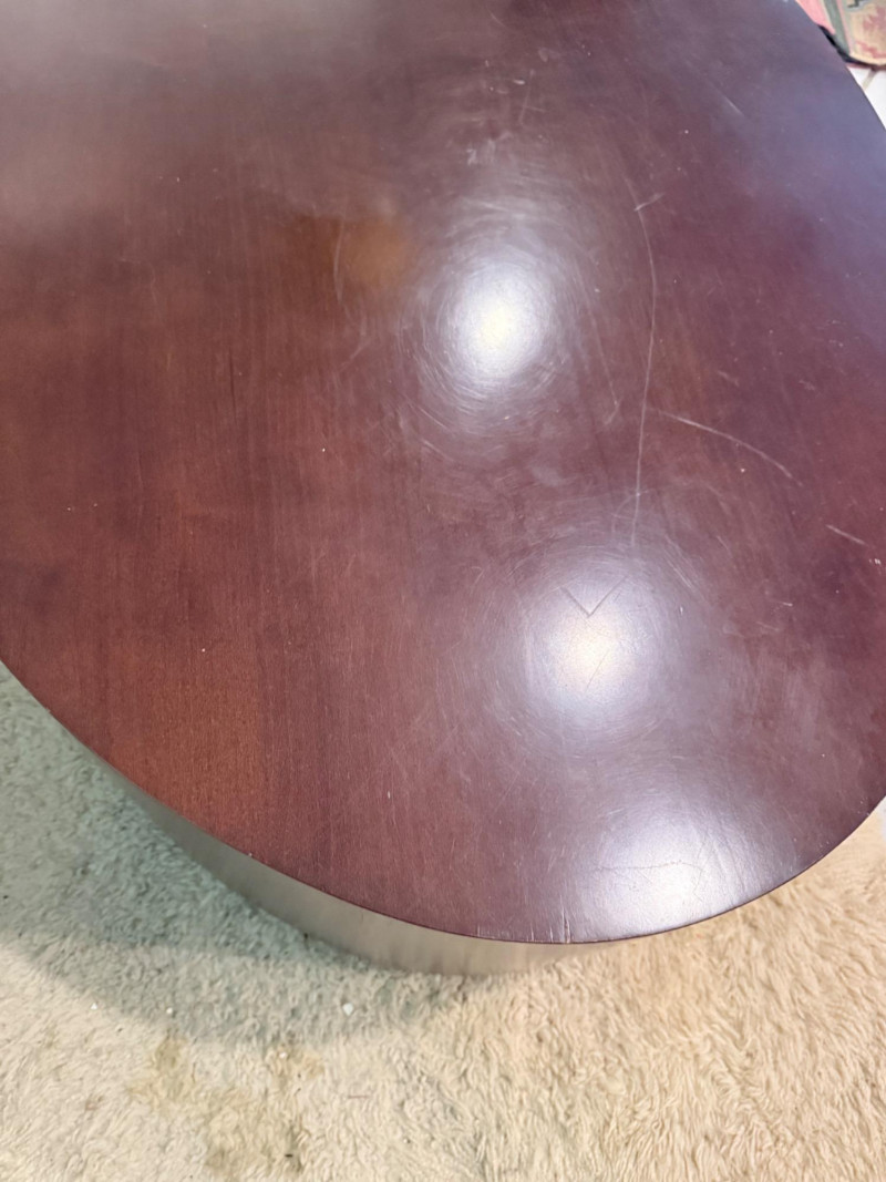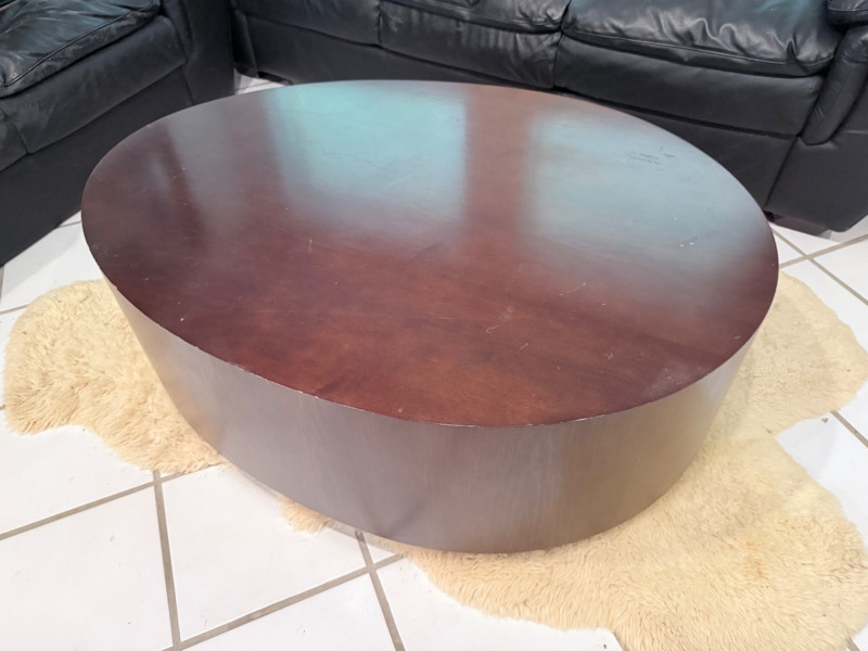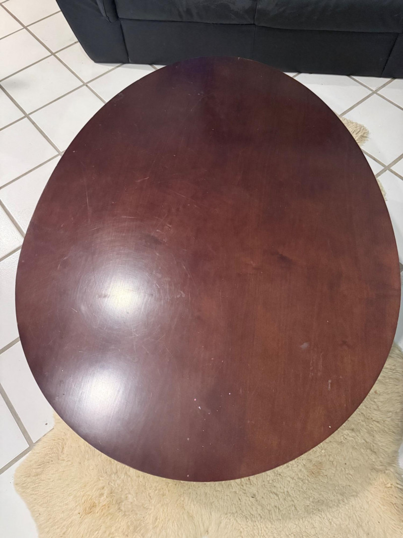 Oval Egg Coffee Table – 46" Wide Wood coffee table featuring an oval, egg-shaped top with a cylindrical base. The surface shows visible wear including scratches and scuffs. Finished in a satin sheen. Dimensions: 46" W x 34" D x 16" H