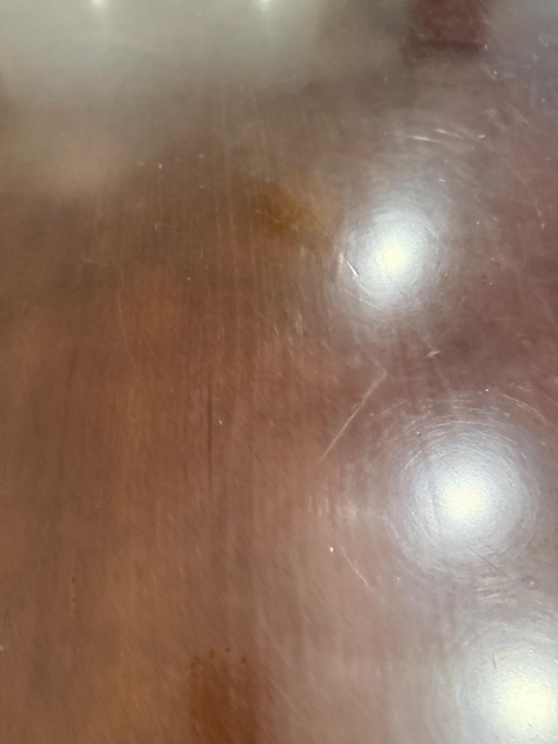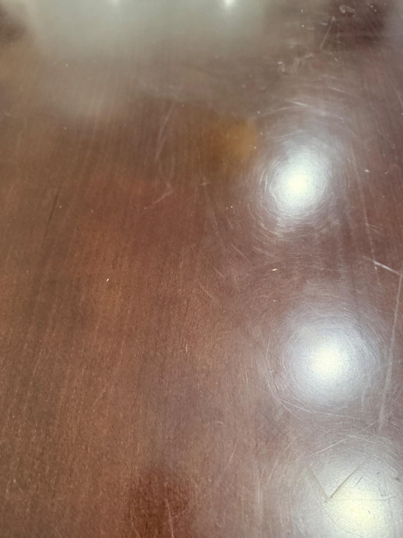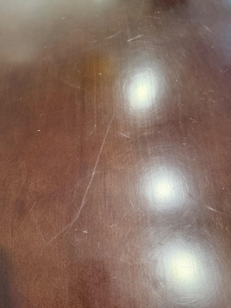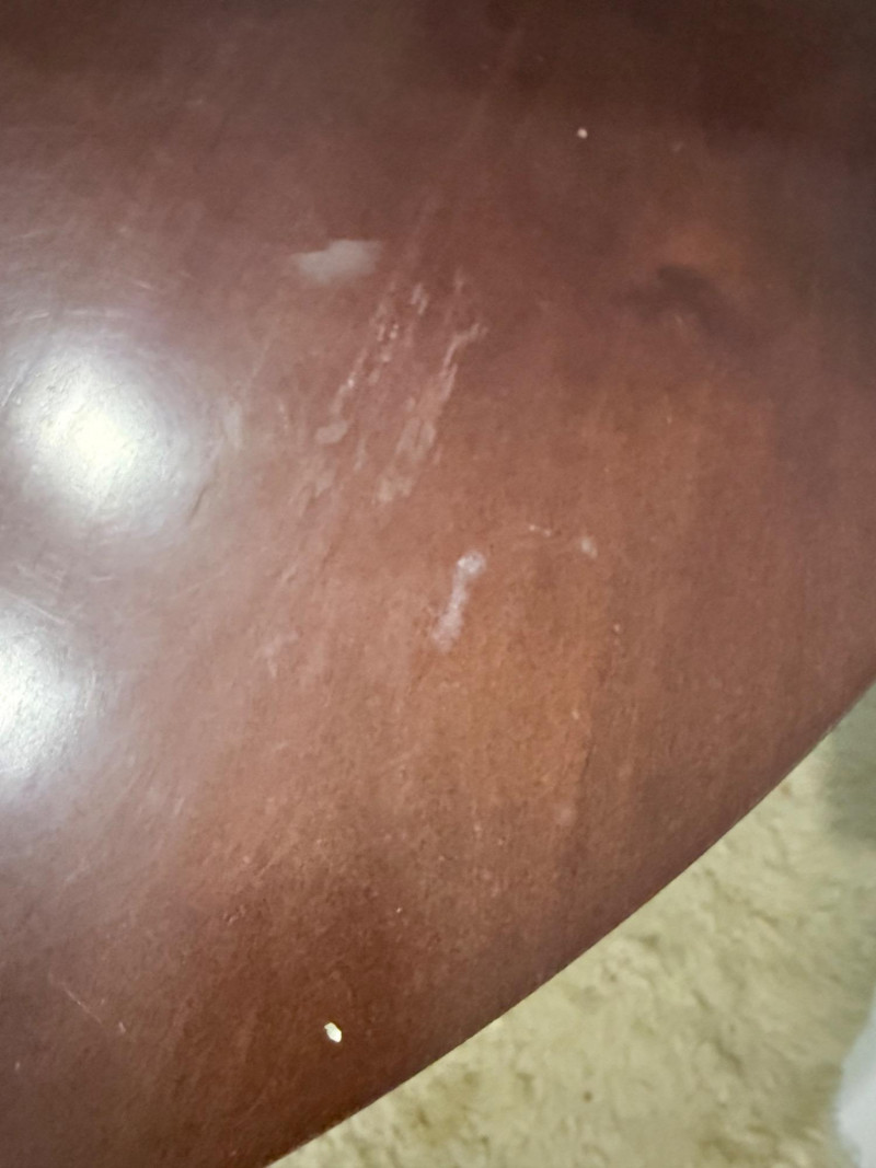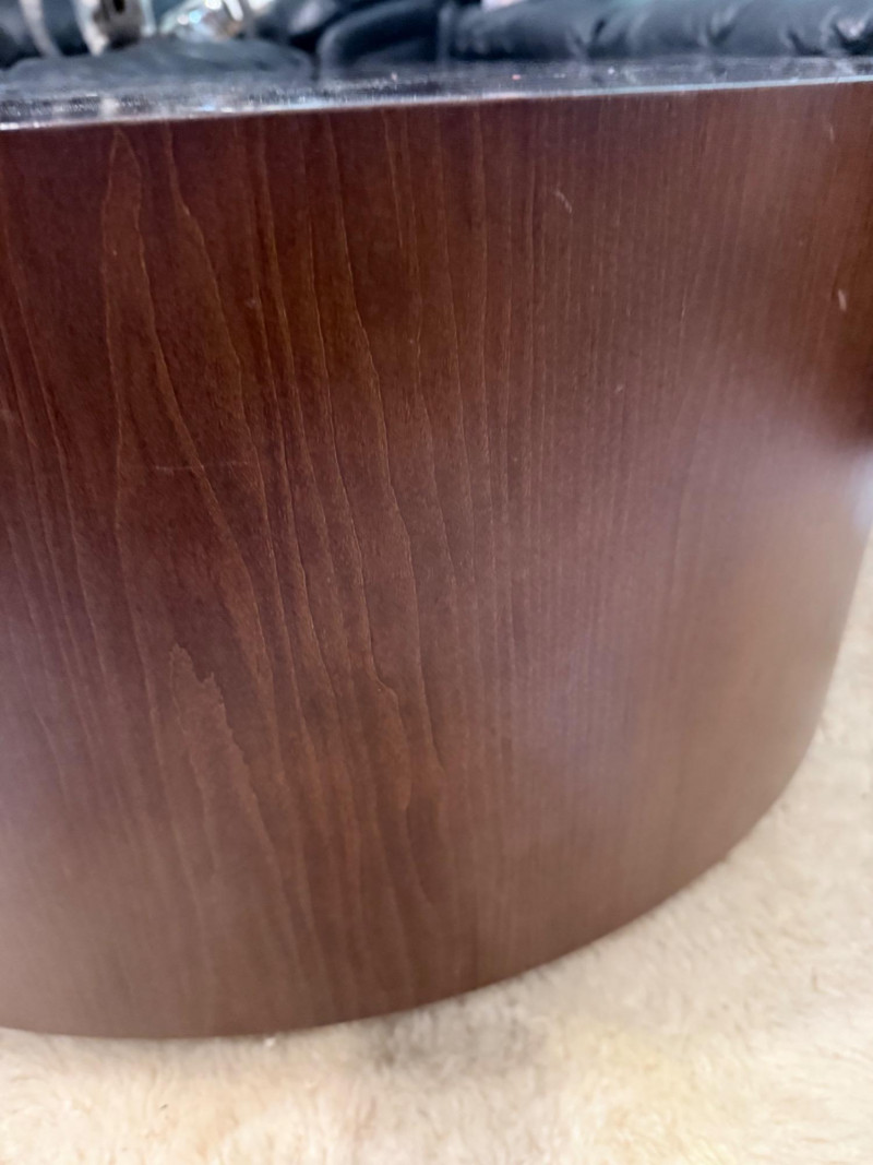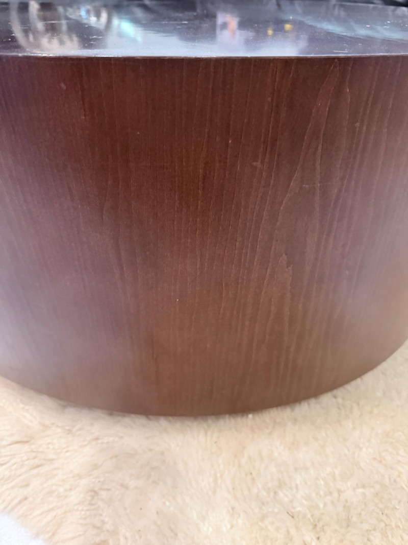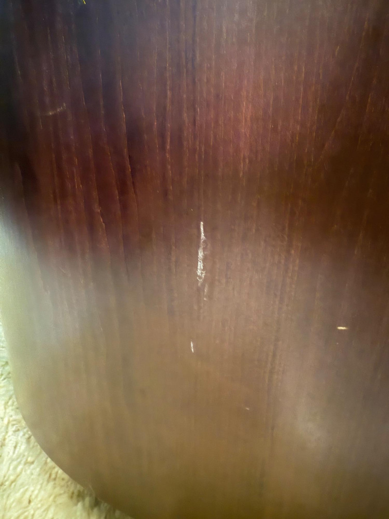 Oval Egg Coffee Table – 46" Wide Wood coffee table featuring an oval, egg-shaped top with a cylindrical base. The surface shows visible wear including scratches and scuffs. Finished in a satin sheen. Dimensions: 46" W x 34" D x 16" H