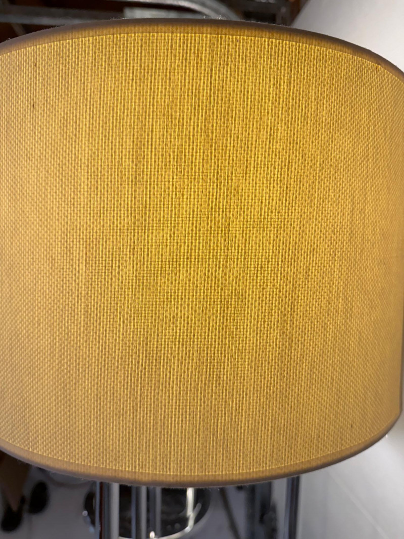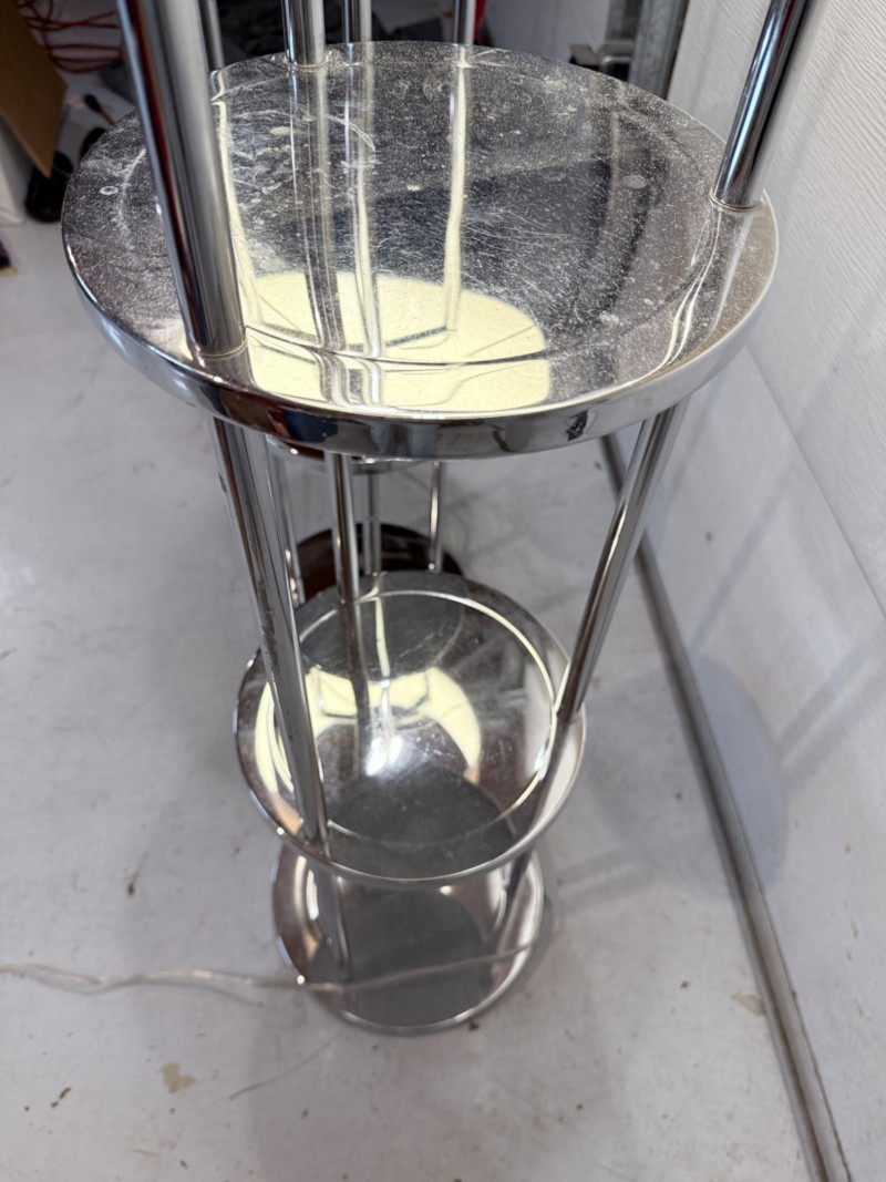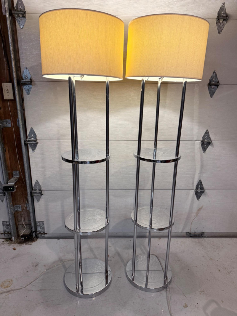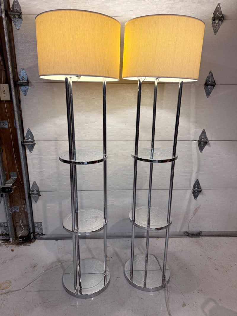 Pair of Floor Lamps with Tiered Shelves – 60" Tall Each lamp features a cylindrical fabric shade measuring 16" in diameter. The frame includes three round platforms supported by vertical chrome-finished rods. Power cords extend from the base. Set includes two matching lamps. Dimensions: 60" H x 16" Diameter (shade)