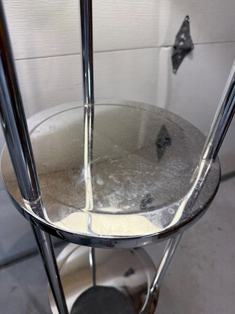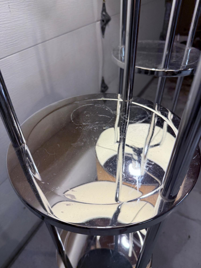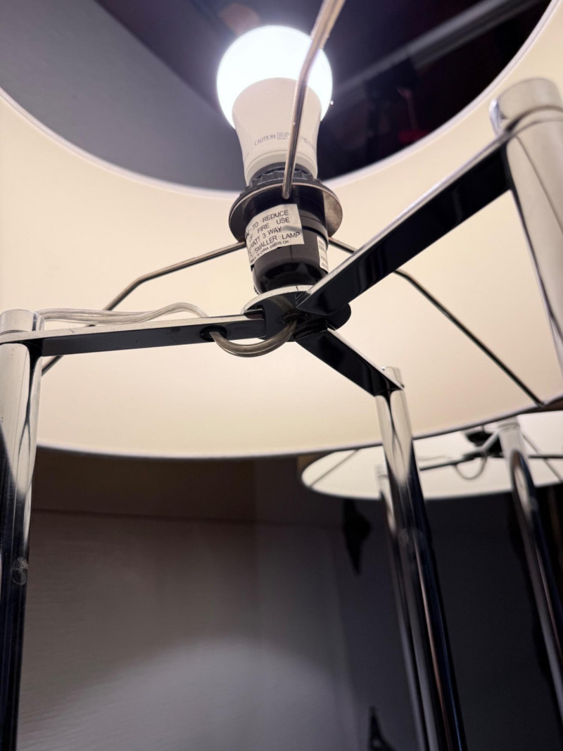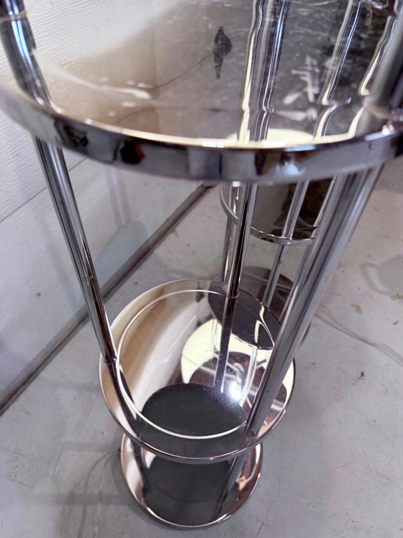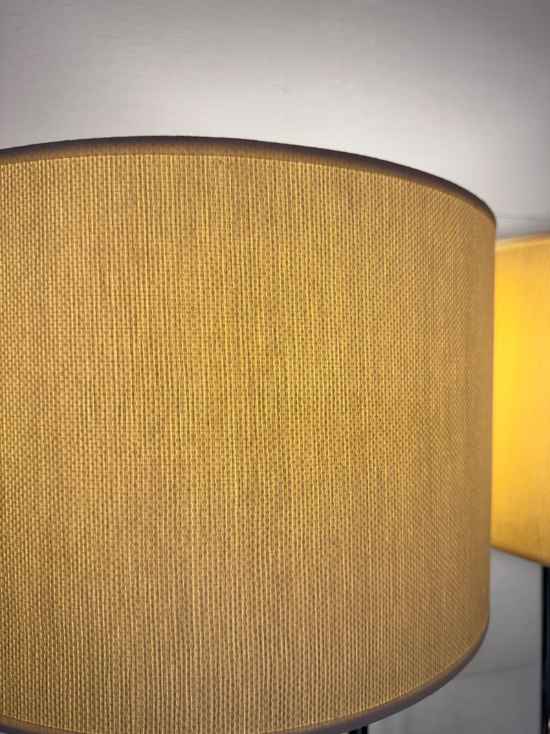 Pair of Floor Lamps with Tiered Shelves – 60" Tall Each lamp features a cylindrical fabric shade measuring 16" in diameter. The frame includes three round platforms supported by vertical chrome-finished rods. Power cords extend from the base. Set includes two matching lamps. Dimensions: 60" H x 16" Diameter (shade)
