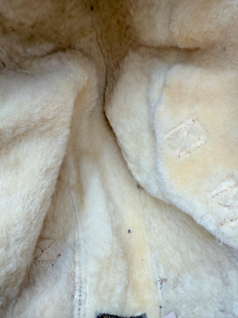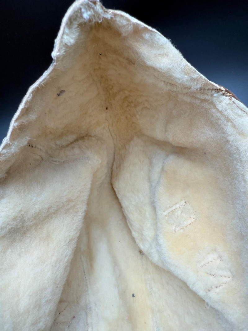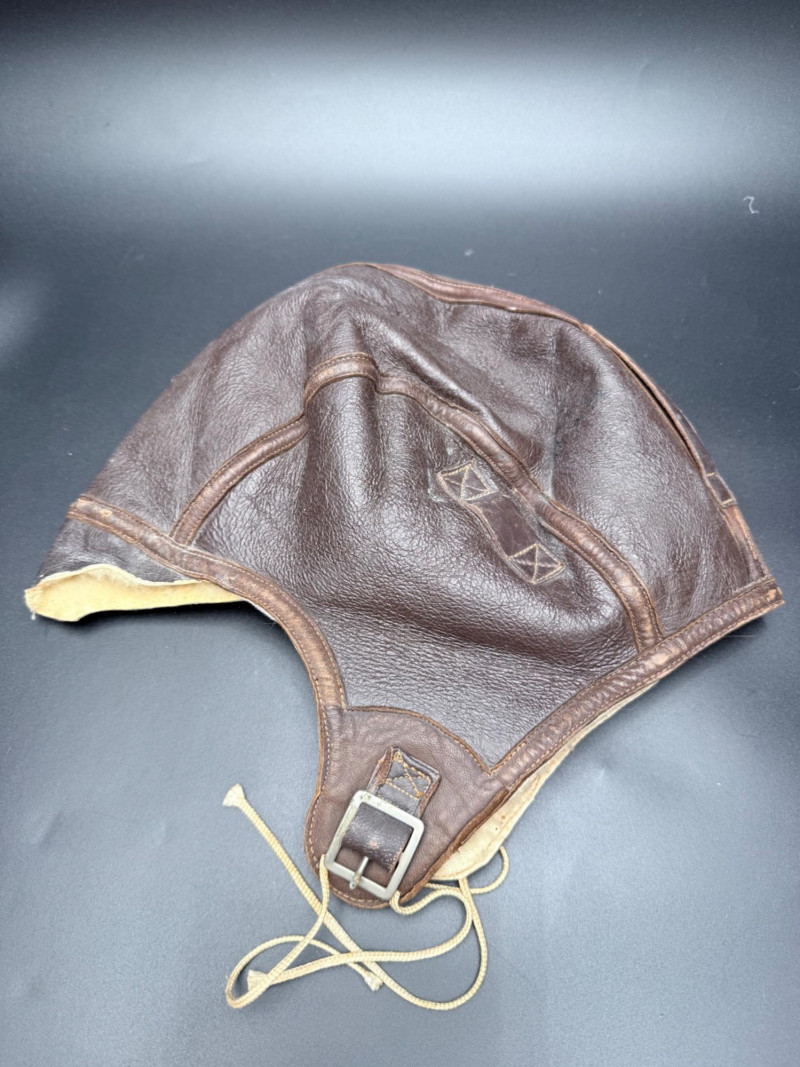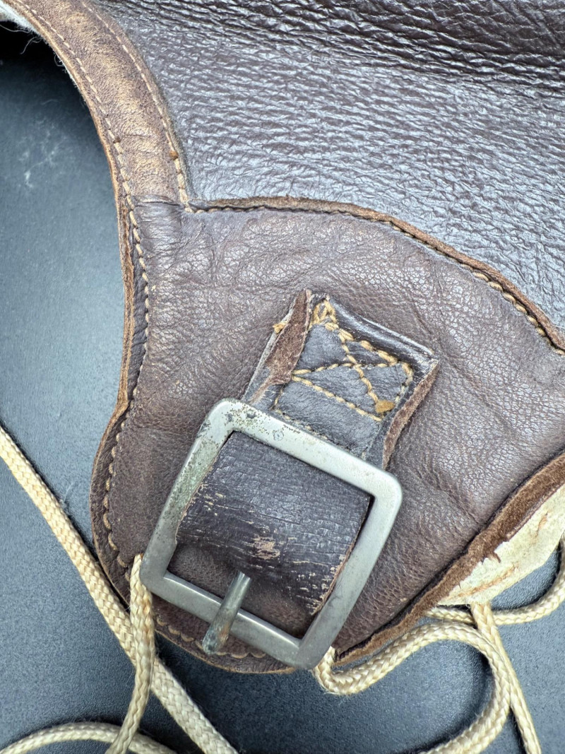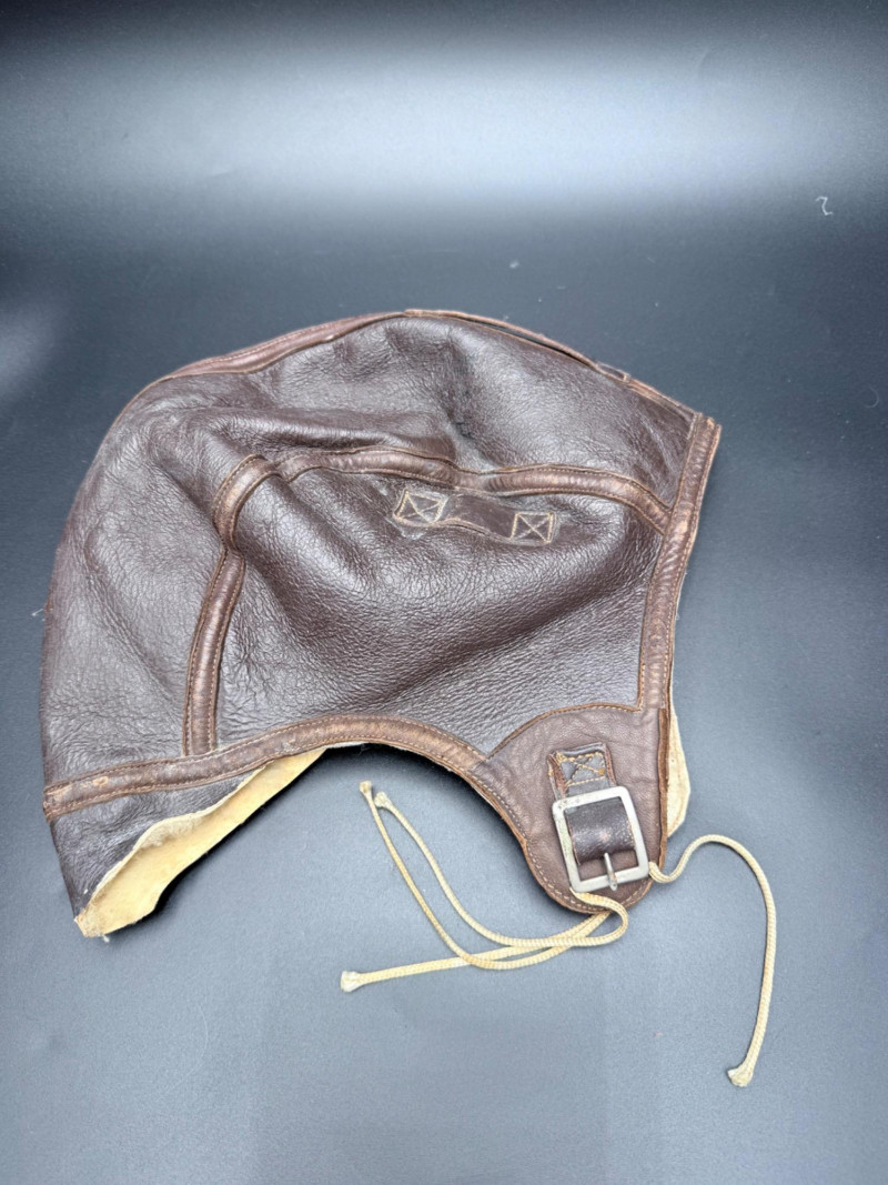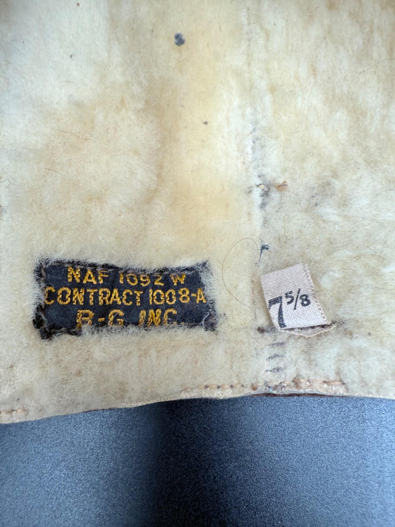 Brown leather aviator cap with shearling lining, stitched flaps, and buckle strap. Interior label marked “NAF 1092W CONTRACT 1008-A B-G INC.” Size 7 5/8.