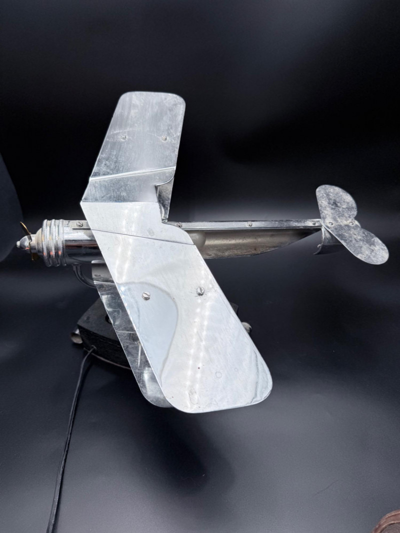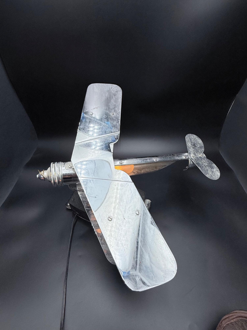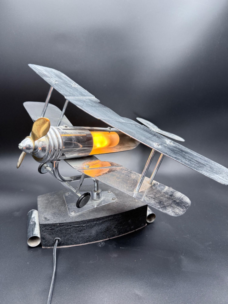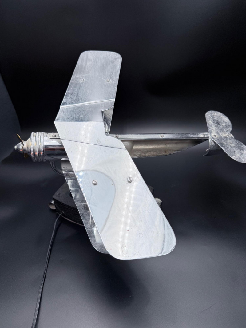 Metal desk lamp in the form of a biplane with dual wings and a cylindrical housing for the light source. Mounted on a rectangular base with power cord and inline switch. Wingspan: 18", Length: 18".