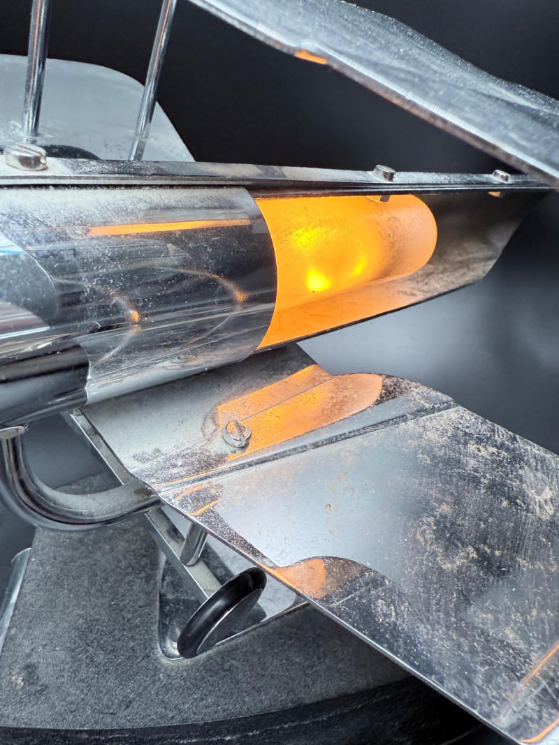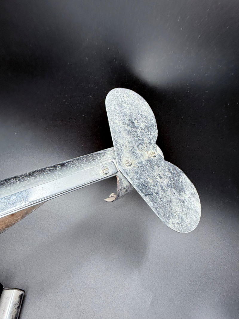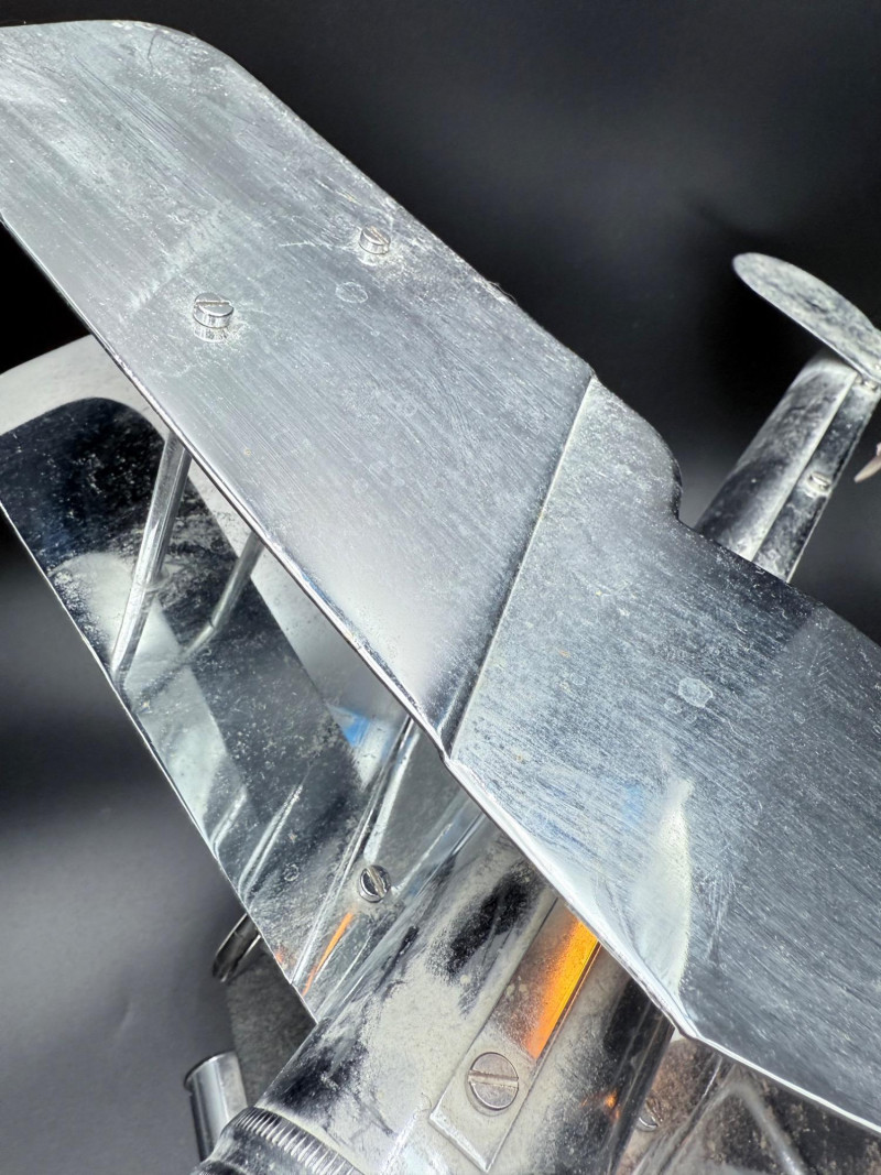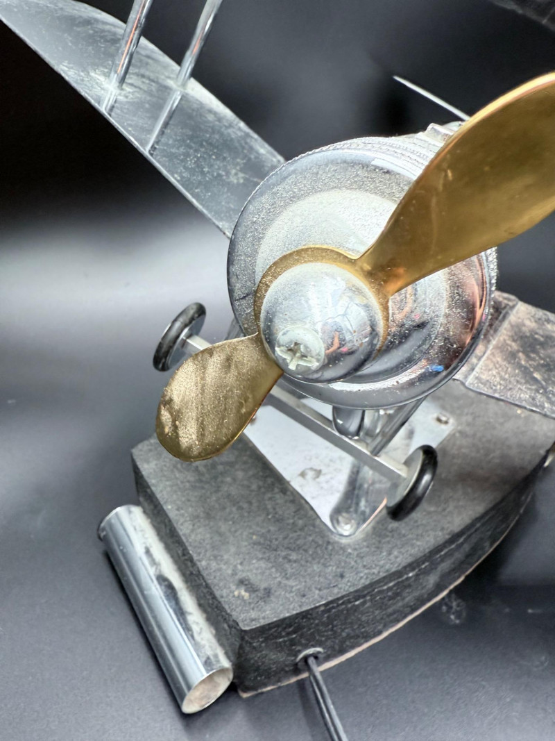 Metal desk lamp in the form of a biplane with dual wings and a cylindrical housing for the light source. Mounted on a rectangular base with power cord and inline switch. Wingspan: 18", Length: 18".