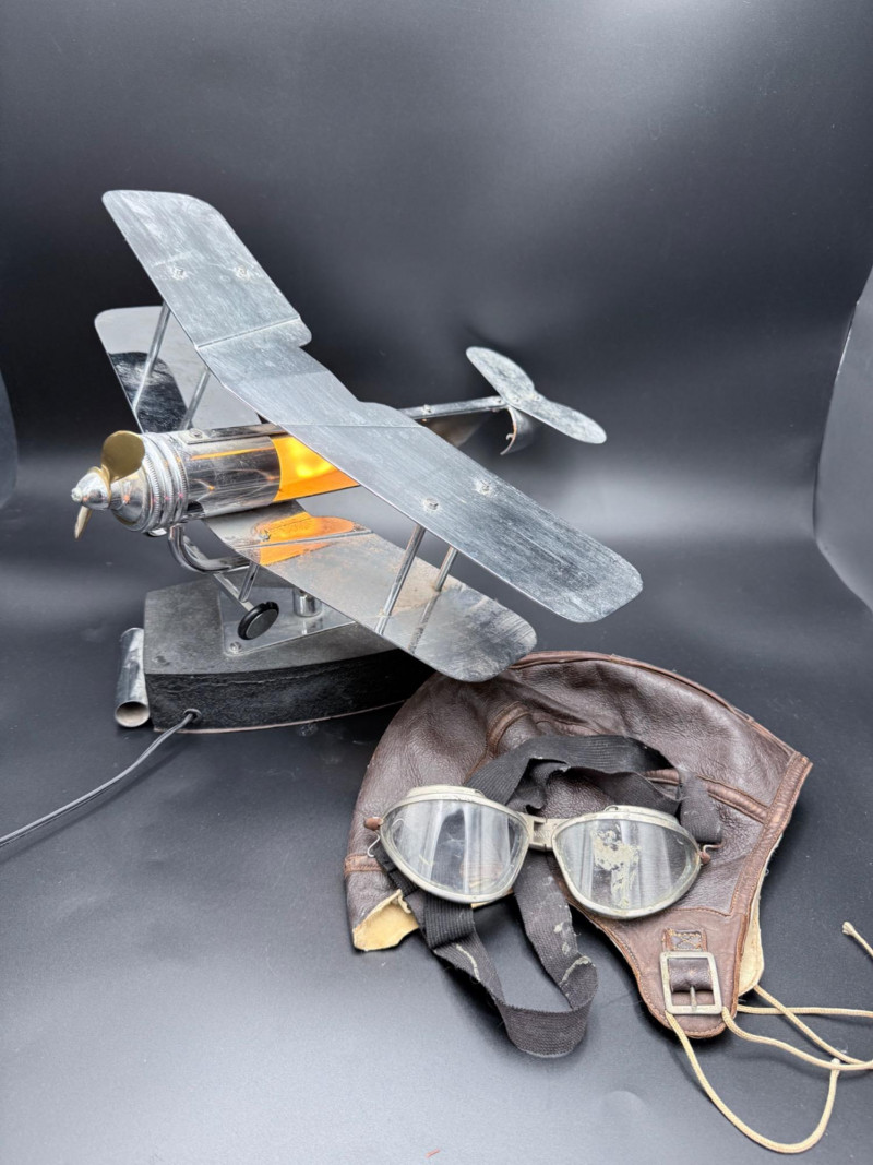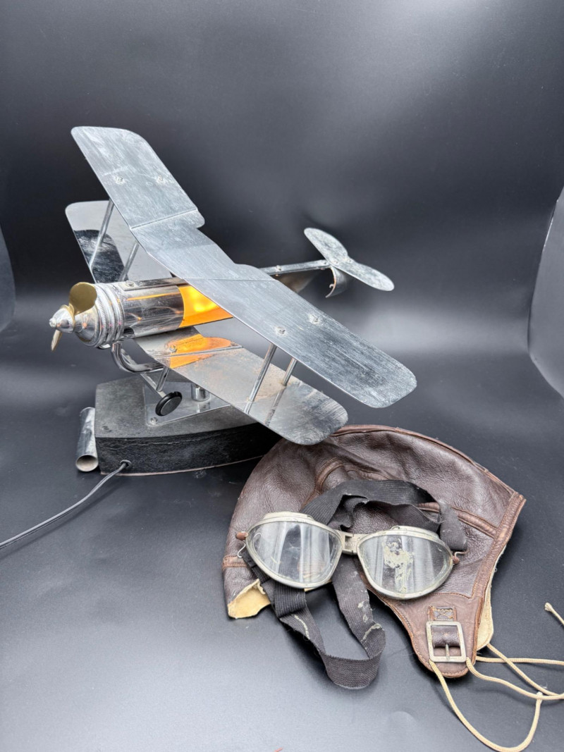 Lot # 44 - Aviation Set – Biplane Lamp, Antique Goggles and Flight Cap