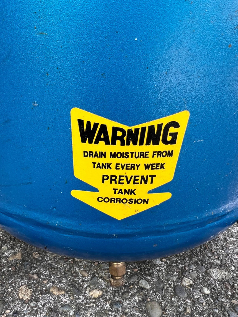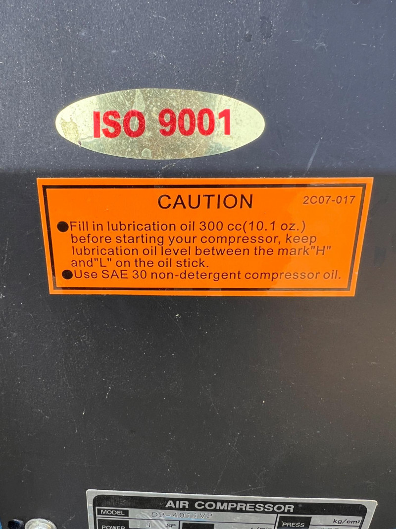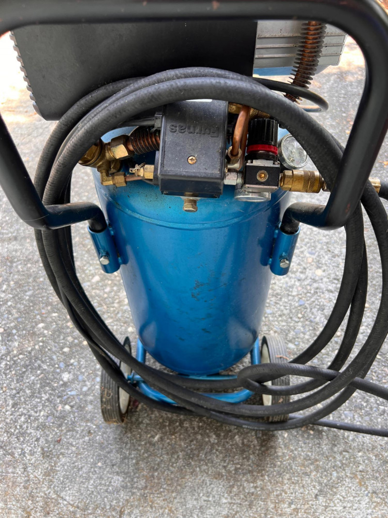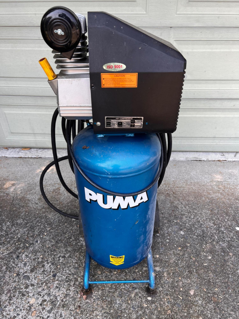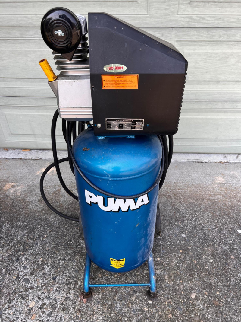 Puma Portable Air Compressor Electric-powered vertical air compressor with wheeled base and integrated handle. Features a piston pump with oil fill port, side-mounted motor housing, and pressure gauge with regulator. Fitted with hose connectors, a drain valve, and caution labels. Dimensions: