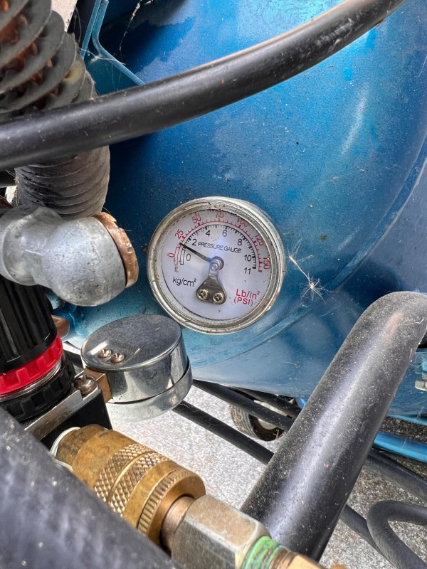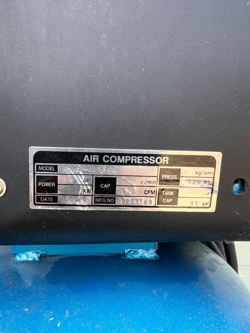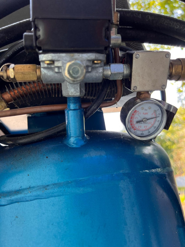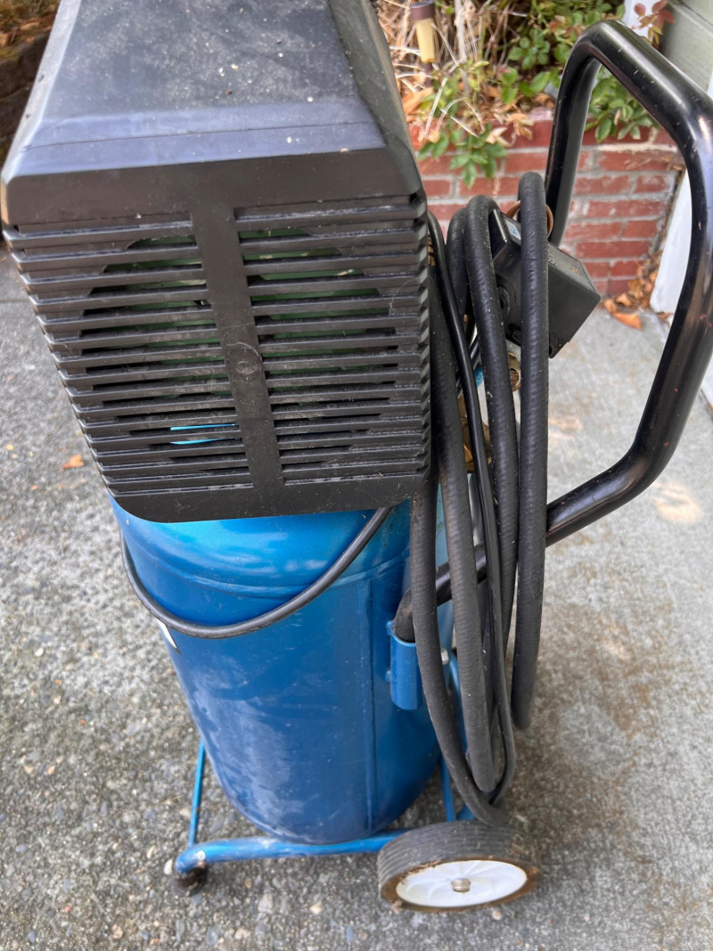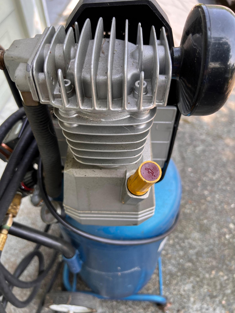 Puma Portable Air Compressor Electric-powered vertical air compressor with wheeled base and integrated handle. Features a piston pump with oil fill port, side-mounted motor housing, and pressure gauge with regulator. Fitted with hose connectors, a drain valve, and caution labels. Dimensions: