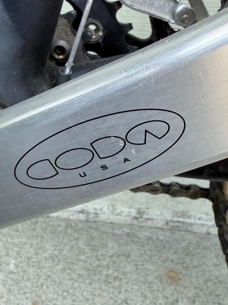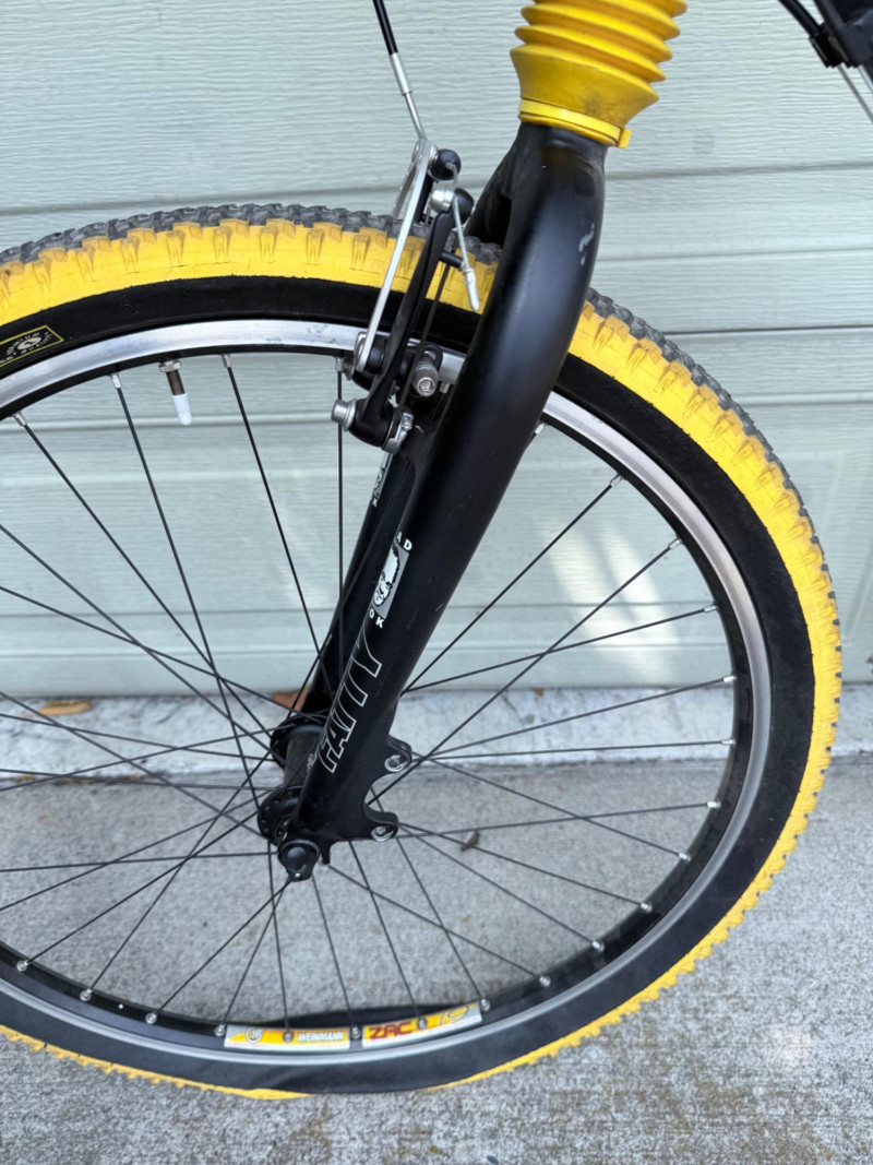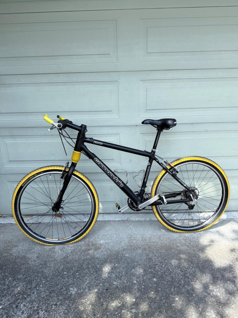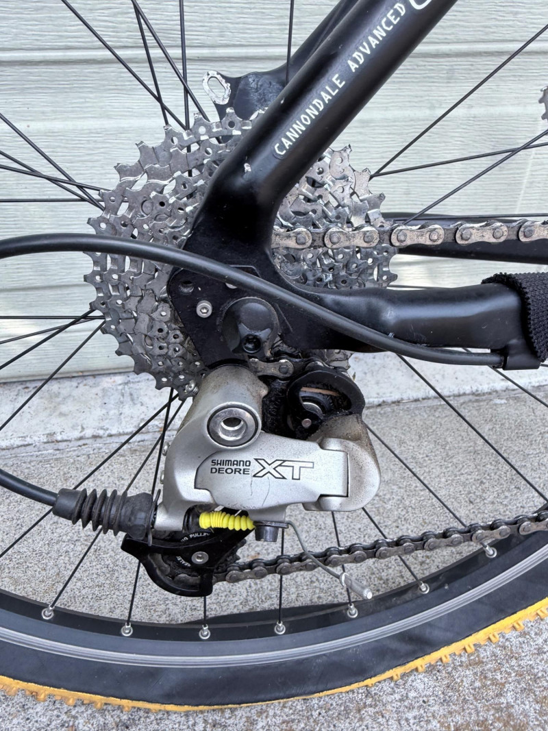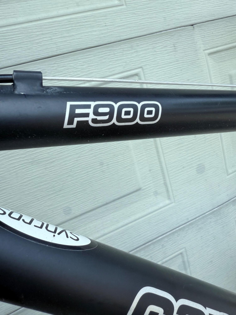 Cannondale F900 CAAD3 Mountain Bike – 26" This mountain bike features a Cannondale CAAD3 frame with a black matte finish, marked “F900” and “DISC-SPECIFIC.” It is fitted with CODA USA and CODA Expert components, including crank and handlebar parts. The drivetrain is equipped with a Shimano Deore XT rear derailleur, GripShift twist shifters, and a multi-speed cassette. The bike includes a HeadShok Fatty front suspension fork and Arch Rival 50 brakes. The wheels are mounted with French-made tires marked "Premium Quality" with yellow tread. Additional features include a Thomson seat post, ergonomic saddle with center channel, alloy pedals with toe cages, and a water bottle cage. Note: Tires show visible wear and the bike is untested.
