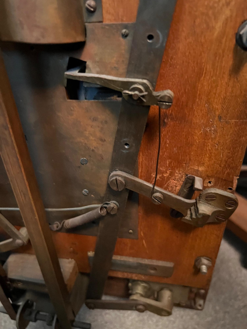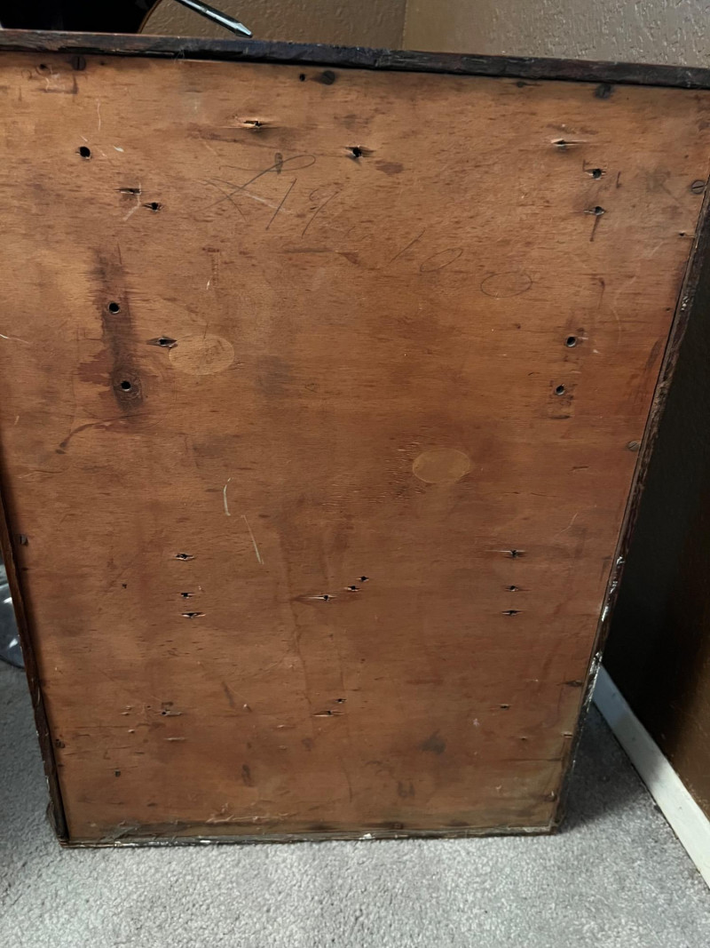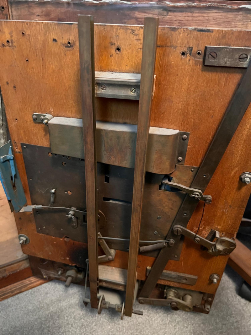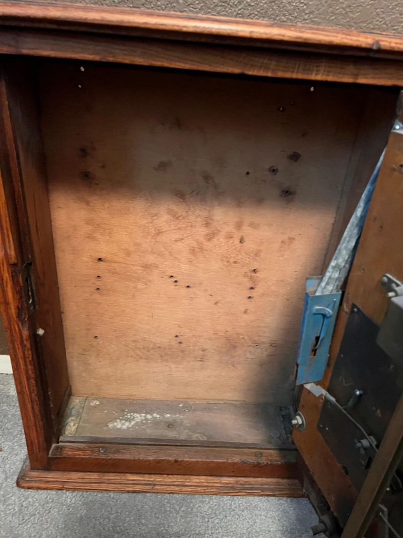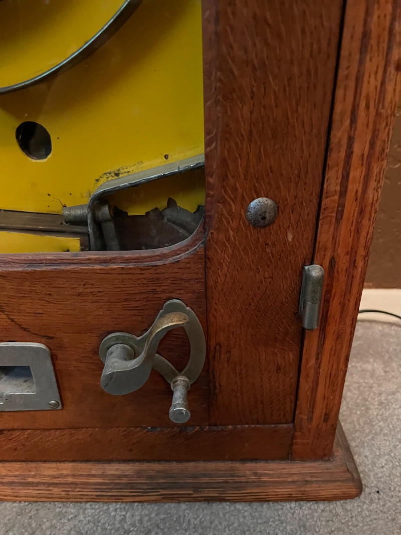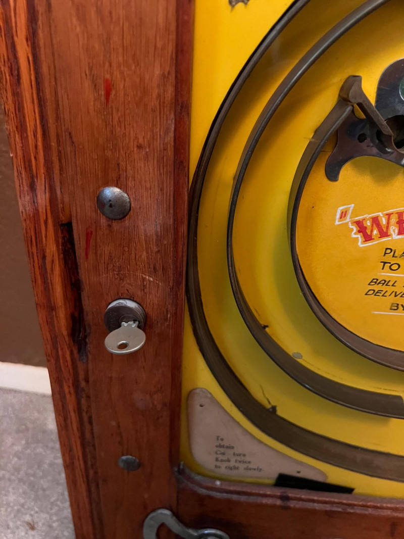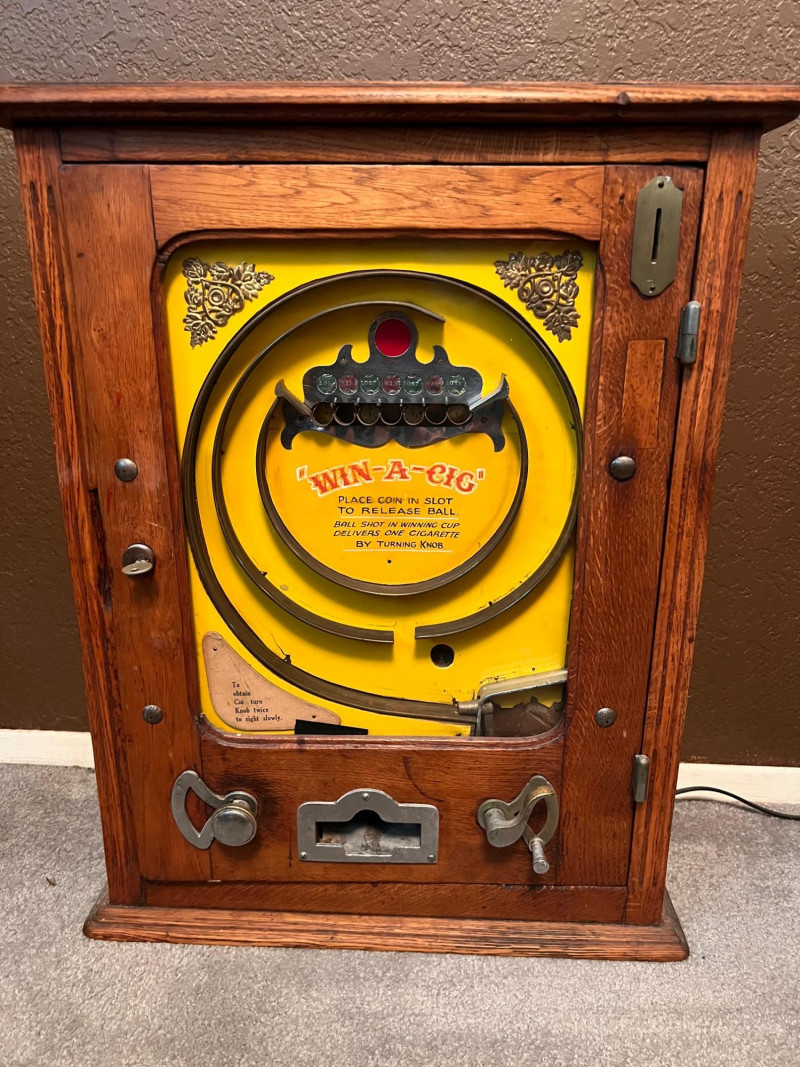 Early 20th Century “Win-A-Cig” Cigarette Trade Stimulator Machine A countertop arcade-style cigarette dispenser from the early to mid-20th century, likely dating to the 1930s–1950s. The machine is housed in a wooden cabinet with a front glass display showing a yellow playfield marked with the name “WIN-A-CIG.” Players insert a coin to release a ball, which rolls along a metal track toward one of several labeled slots. A winning slot dispenses a cigarette when the knob is turned. The unit includes a coin slot, metal crank, ball chute, and payout mechanism. Internal levers and rods are visible behind the rear panel, showing the mechanical operation. Dimensions: