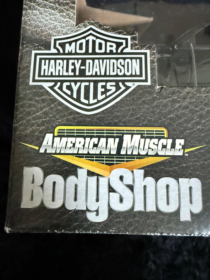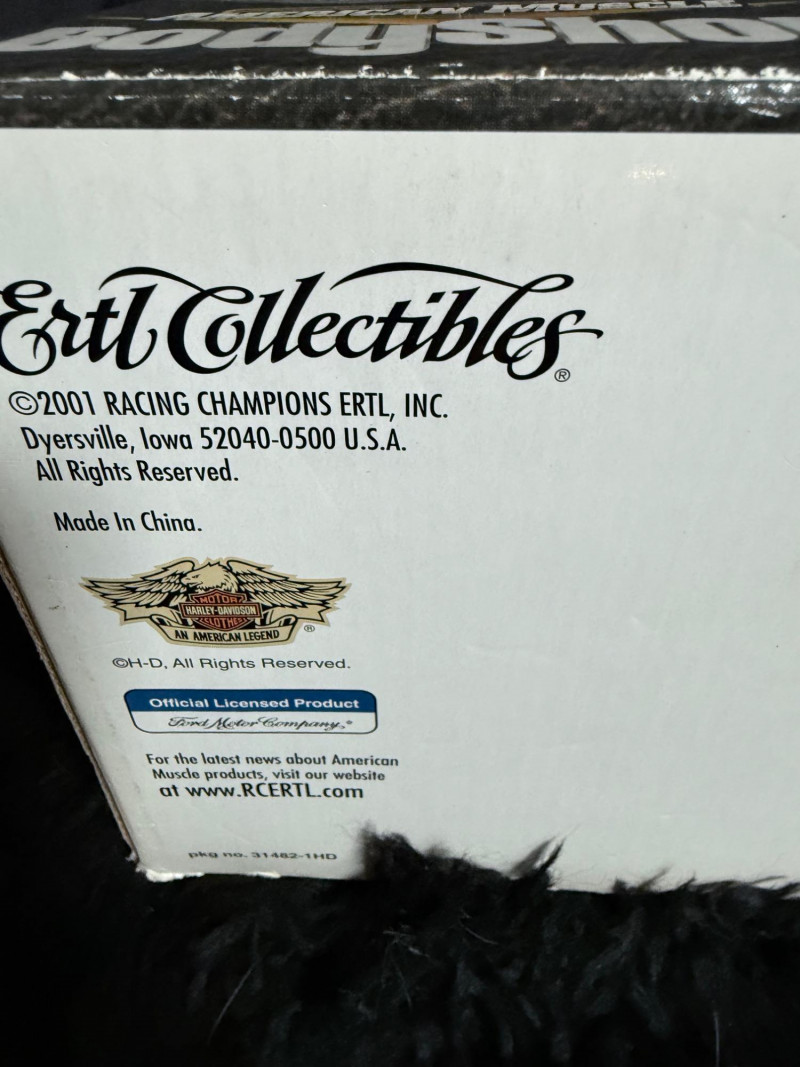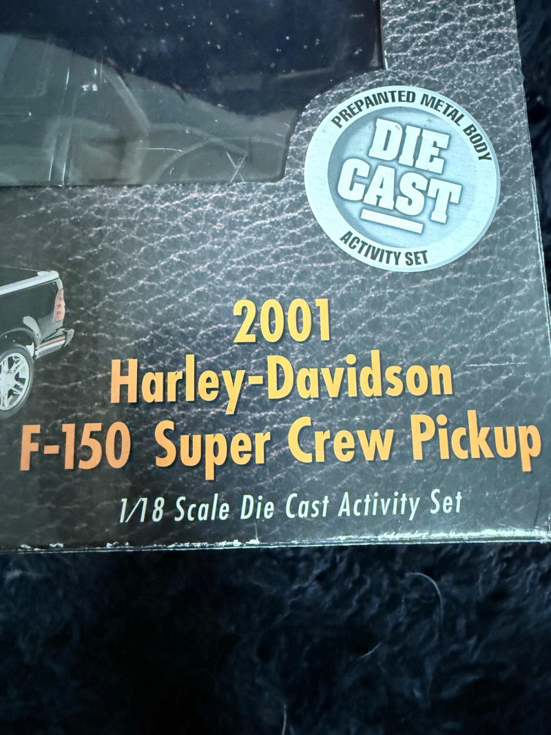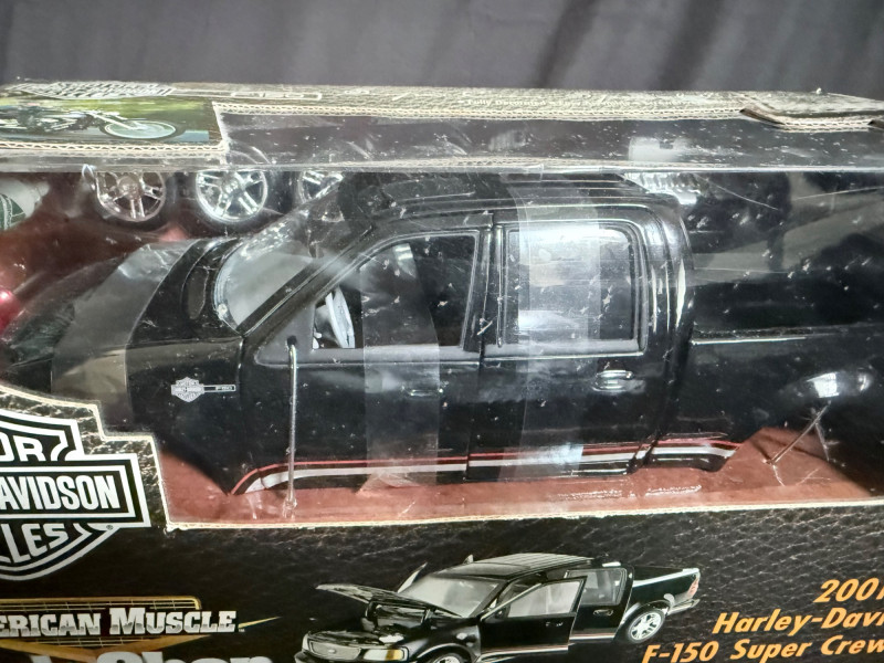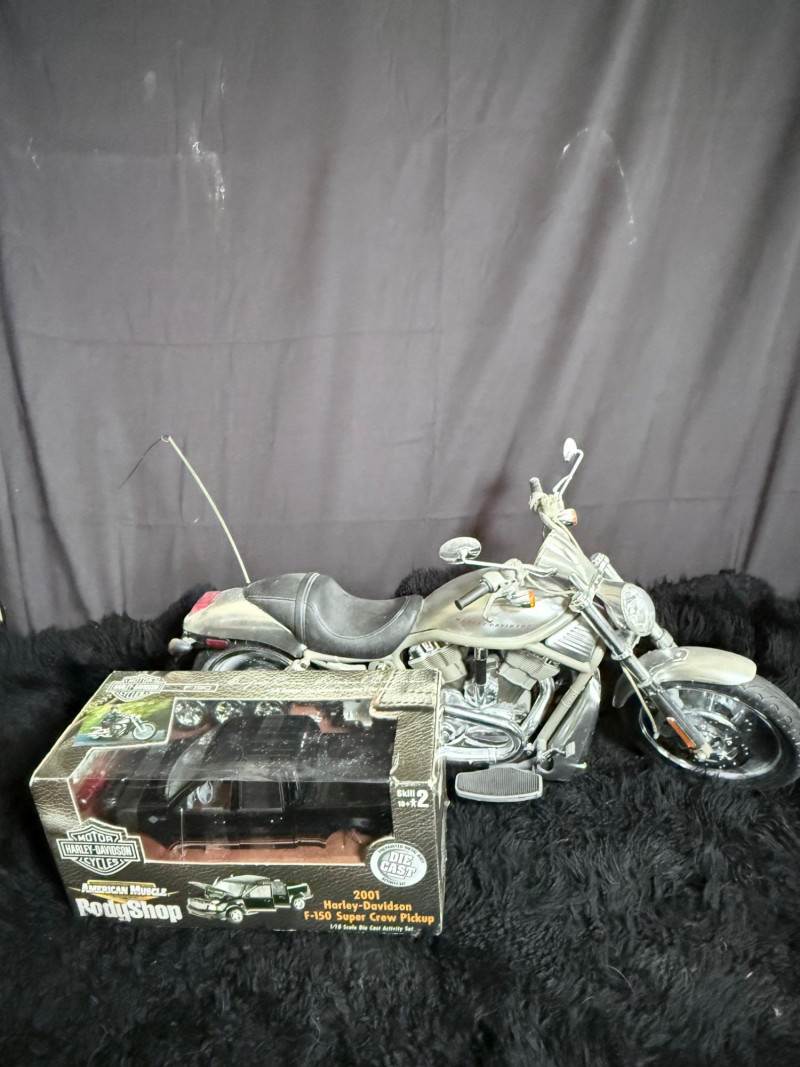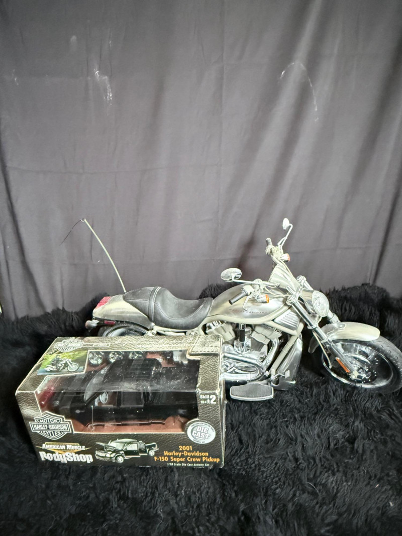 Harley-Davidson Motorcycle and Die-Cast Truck Set A pair of Harley-Davidson collectibles, including a large display motorcycle and a 1:18 scale die-cast 2001 Ford F-150 Super Crew Pickup truck. The motorcycle features chrome engine components, dual exhaust, rubber tires, and antenna. The truck is part of the American Muscle Body Shop series by Ertl Collectibles and remains in its original packaging. Note: Motorcycle is not remote-controlled. Not tested. May not function. Motorcycle Dimensions: Truck Packaging Dimensions (Boxed): Set Includes: