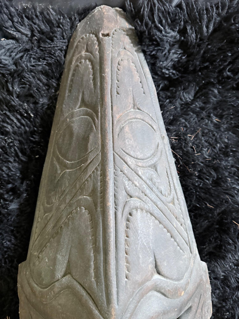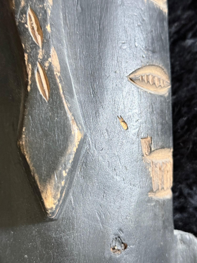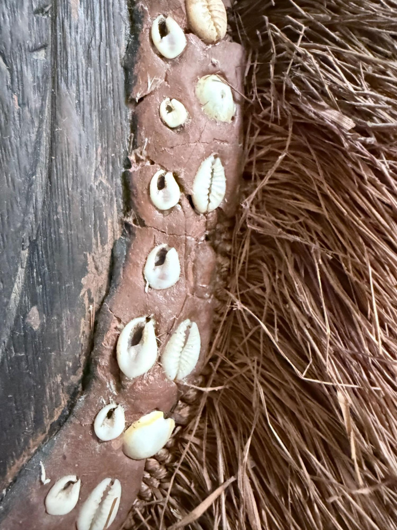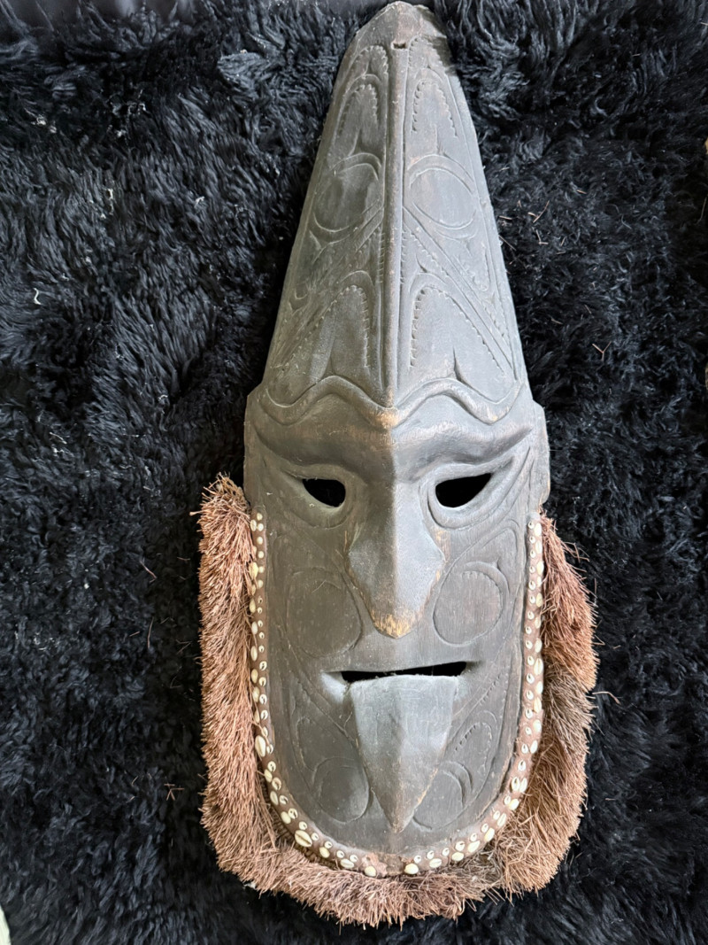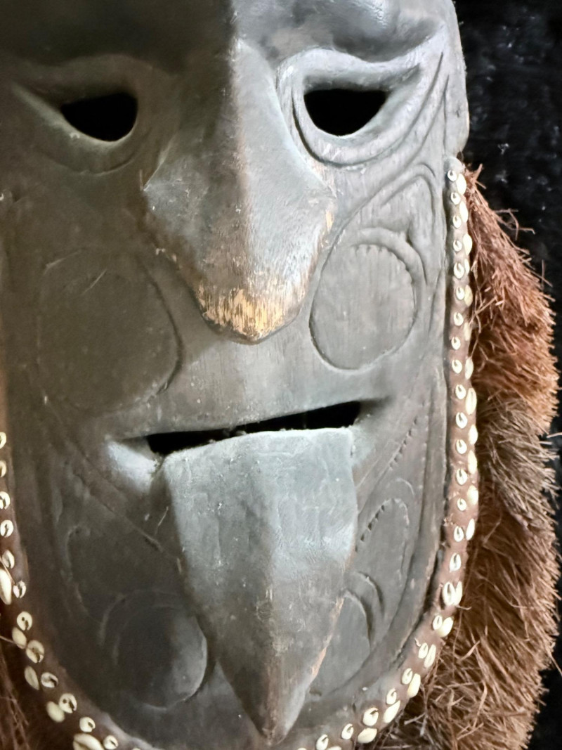 • Tall carved black mask with incised motifs, raffia fringe, and cowrie shell trim