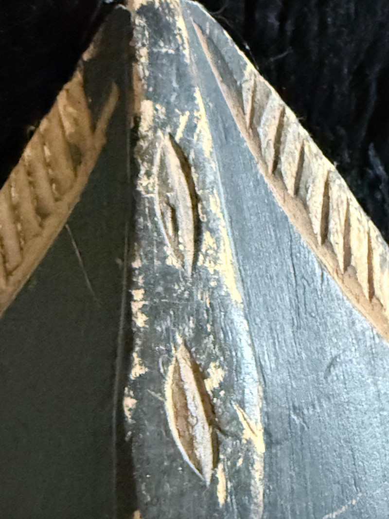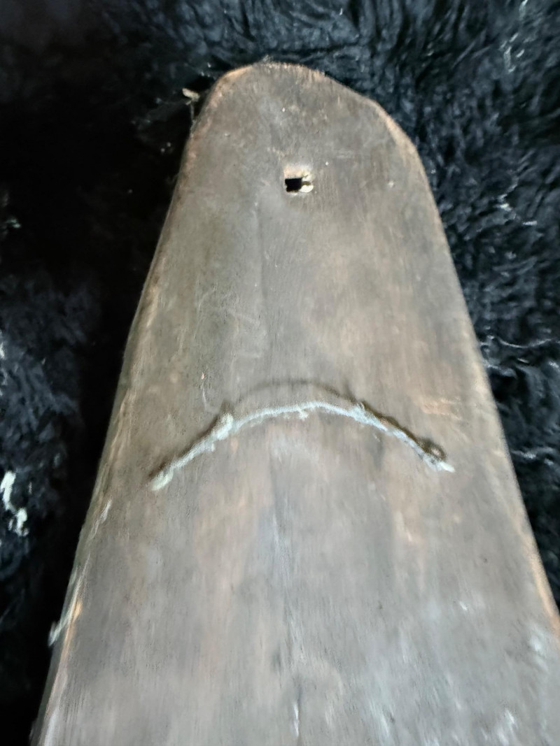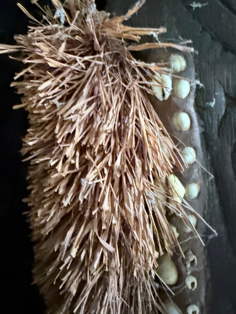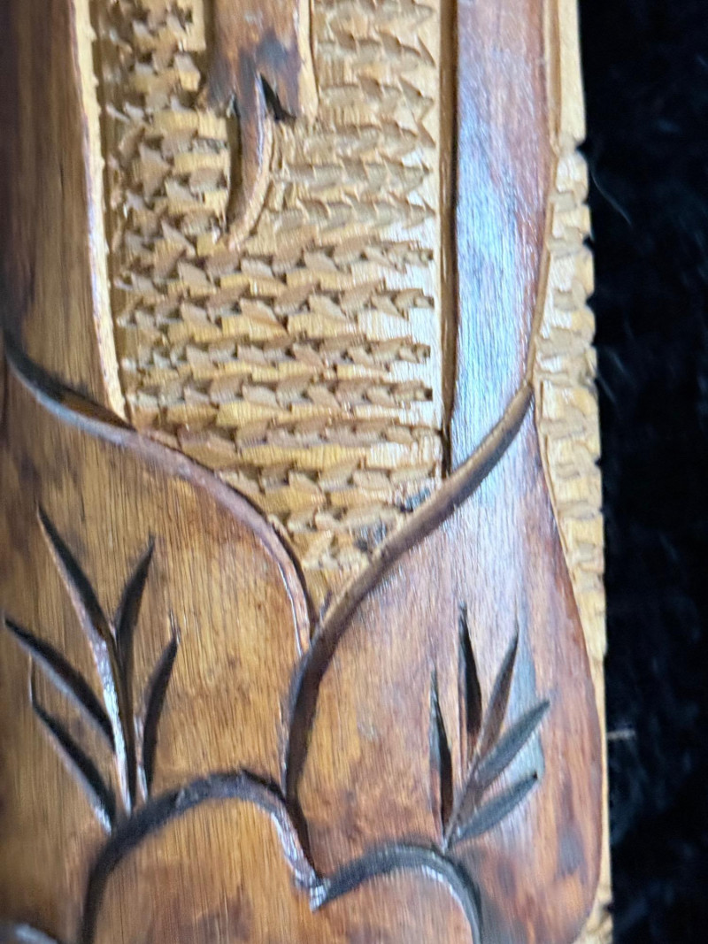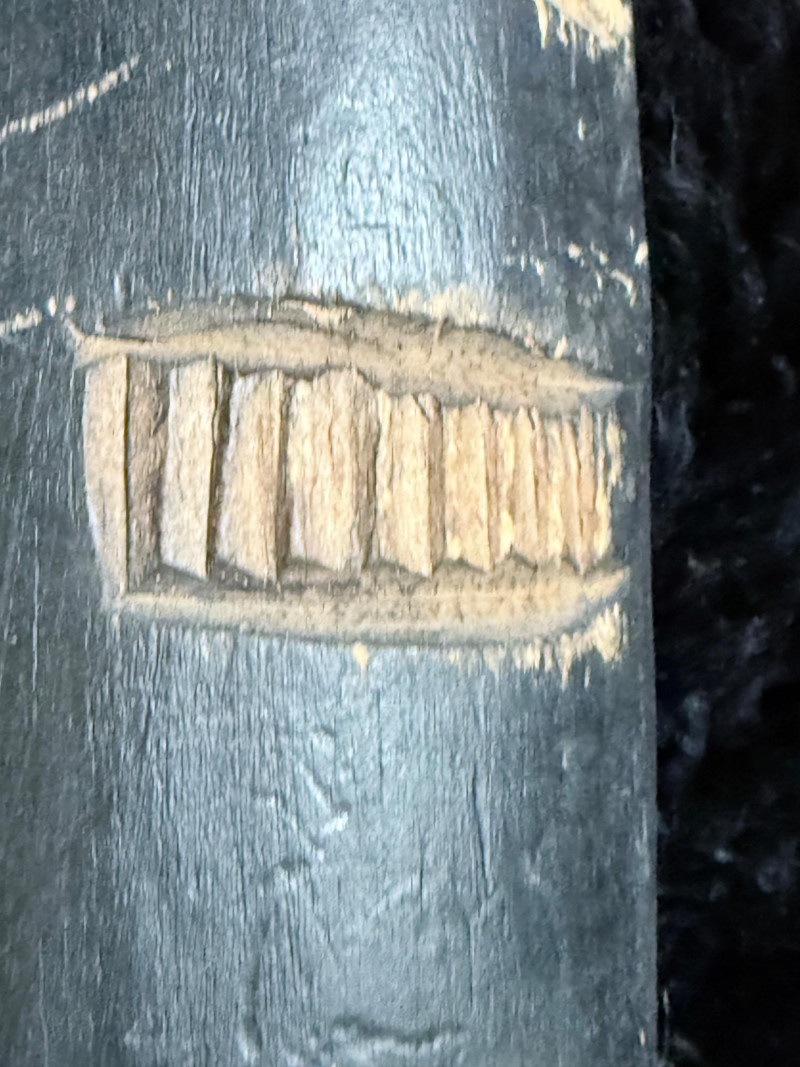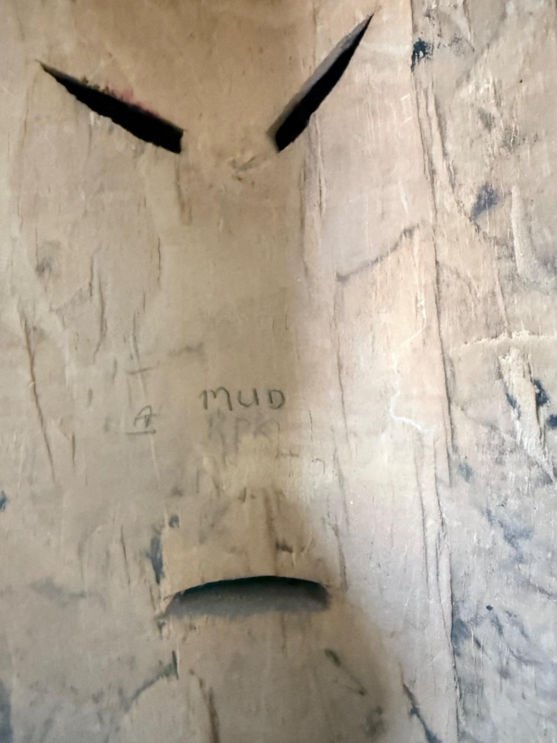 • Tall carved black mask with incised motifs, raffia fringe, and cowrie shell trim