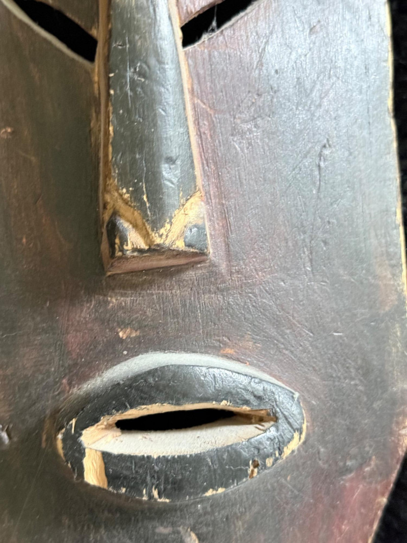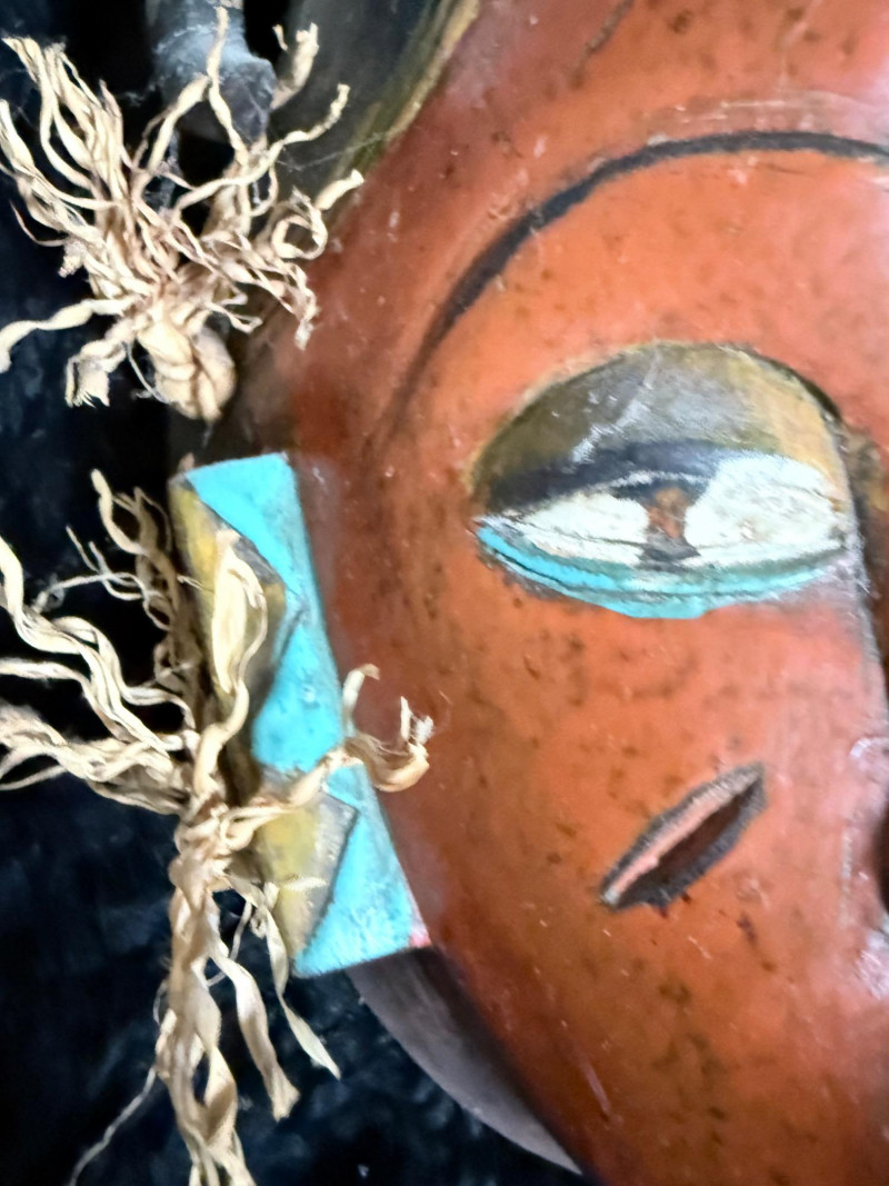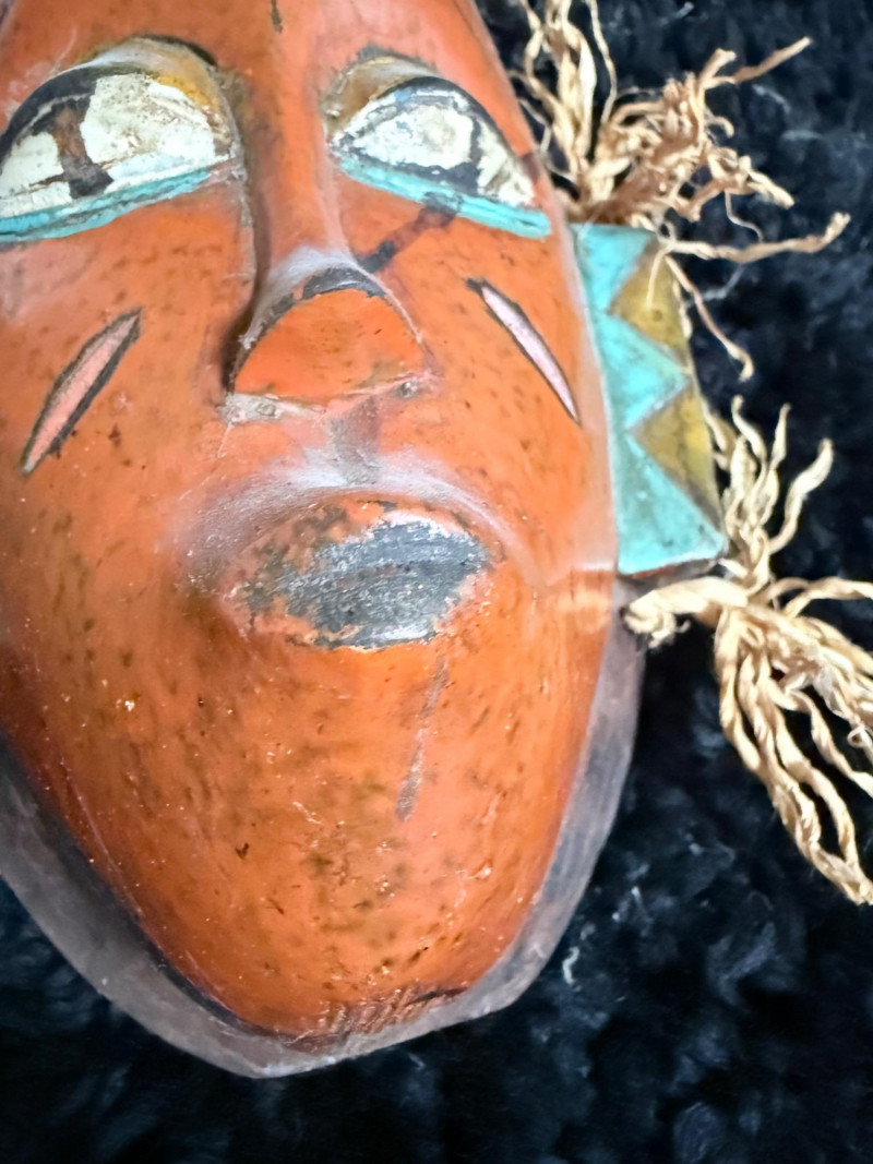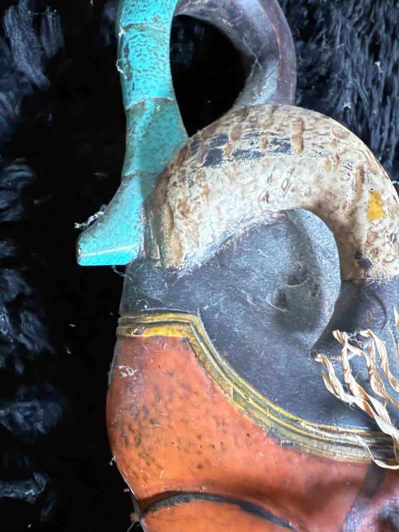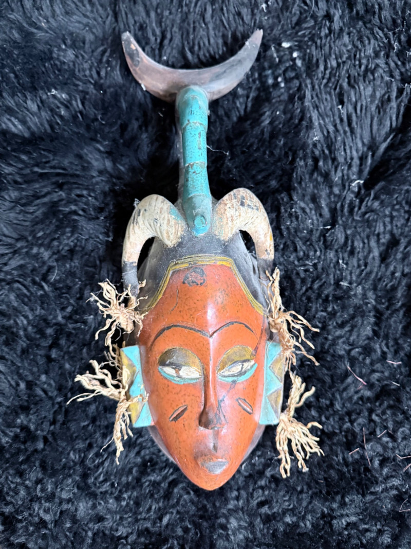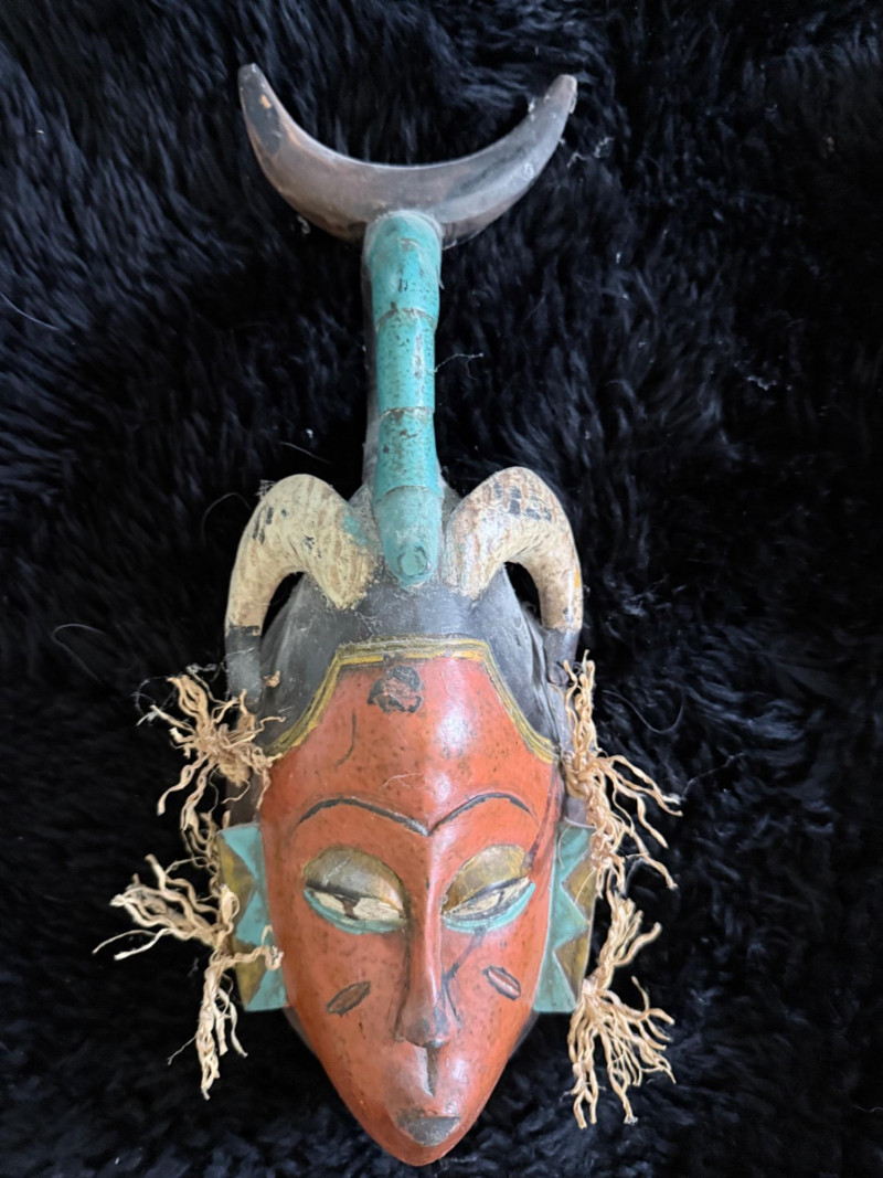 • Guro-style mask with crescent crest, painted facial features, dual horns, and raffia accents
