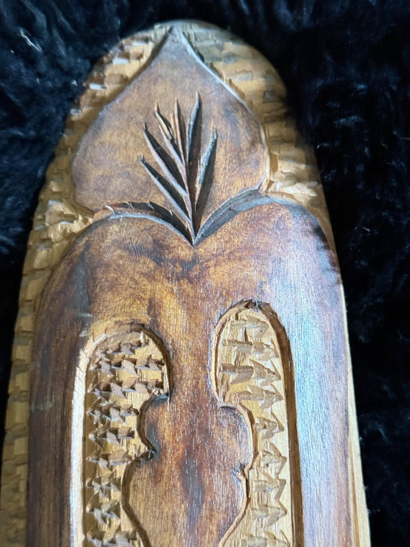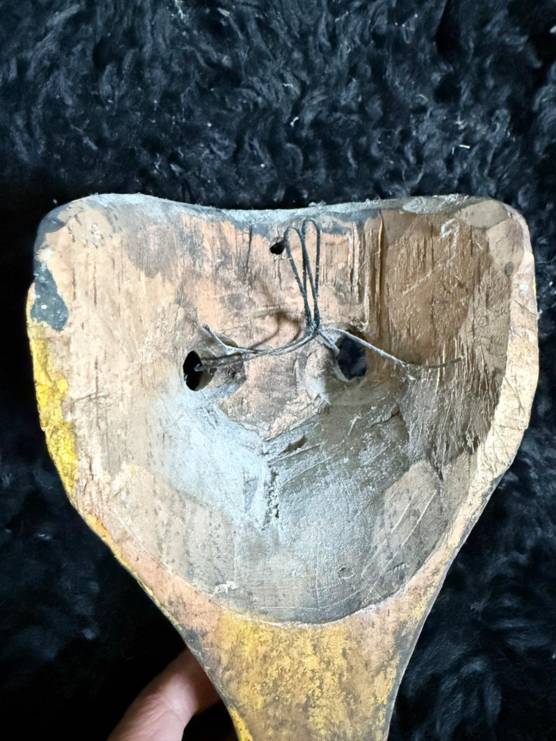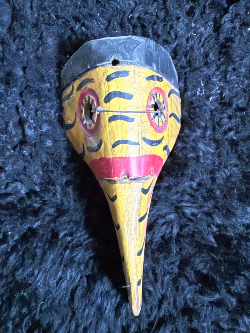 • Painted folk-style mask with long pointed nose, rounded eyes, and yellow surface with striped patterns
