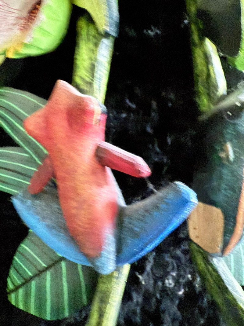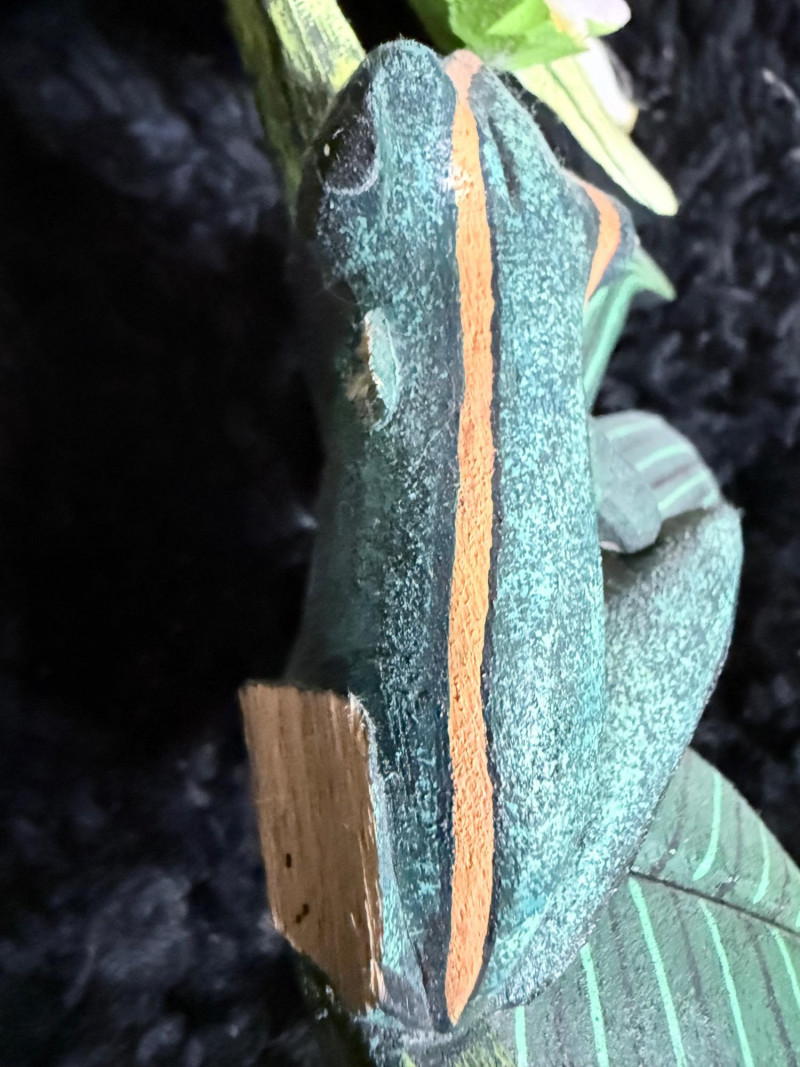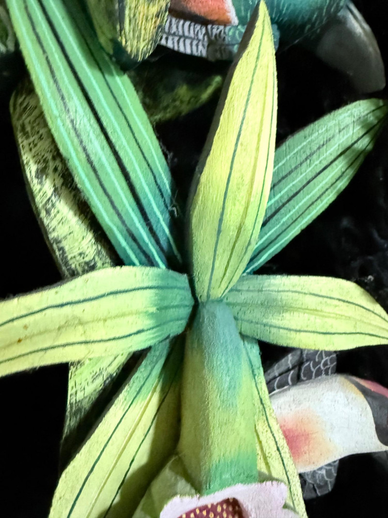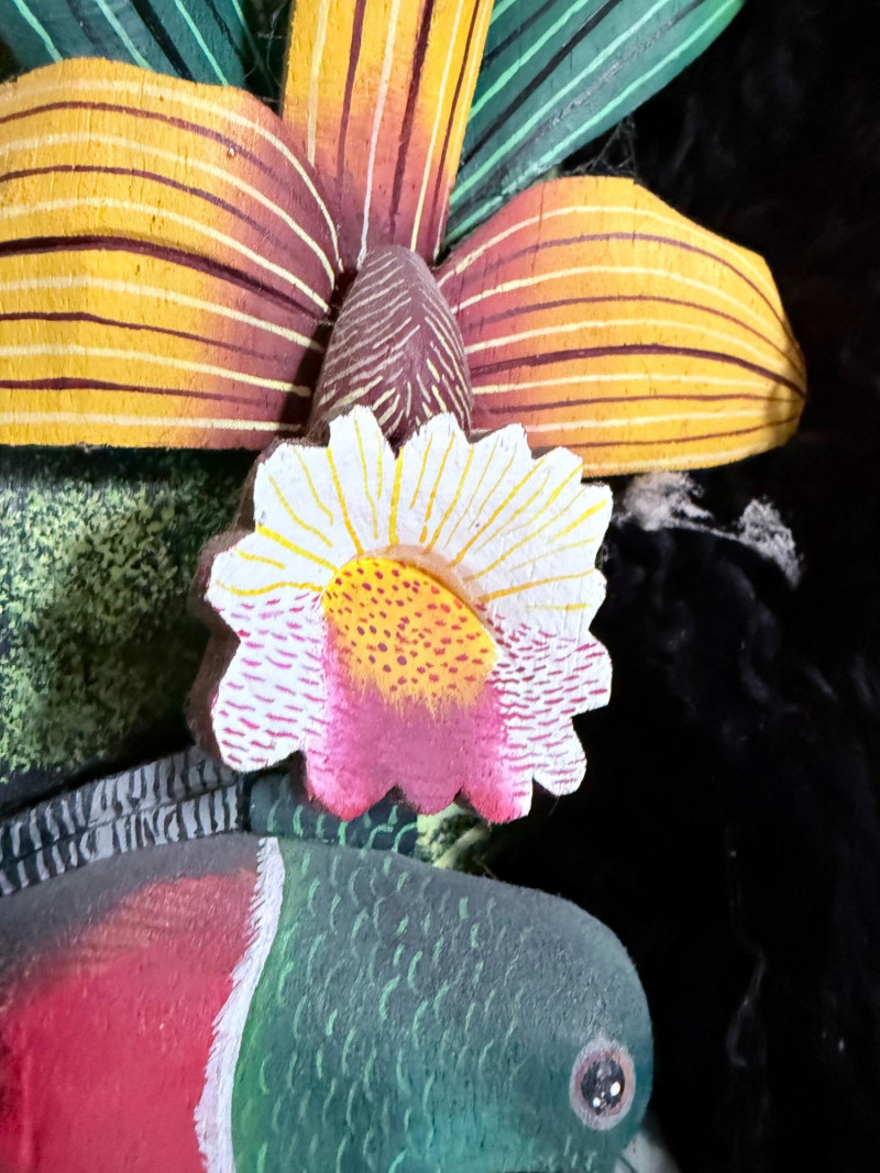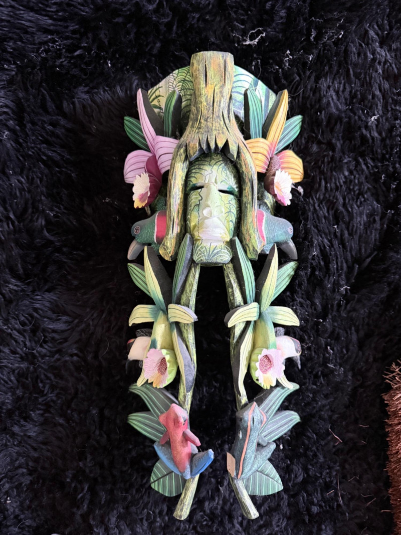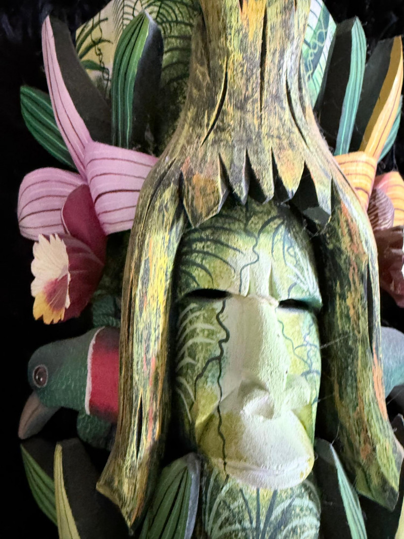 • Vertical jungle-themed mask with applied parrots, frogs, flowers, and foliage in painted relief