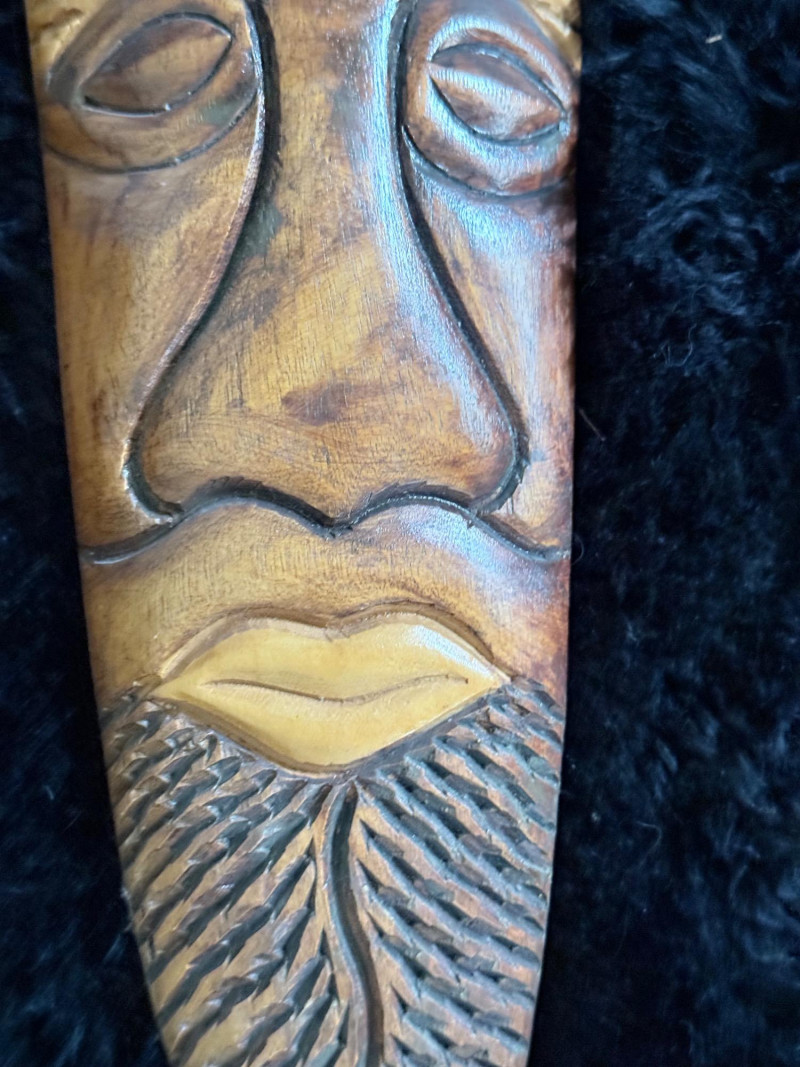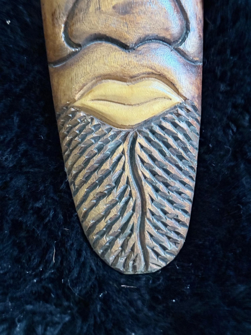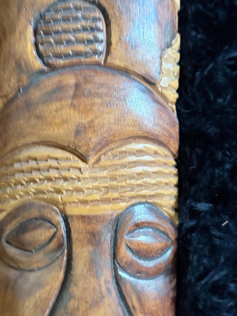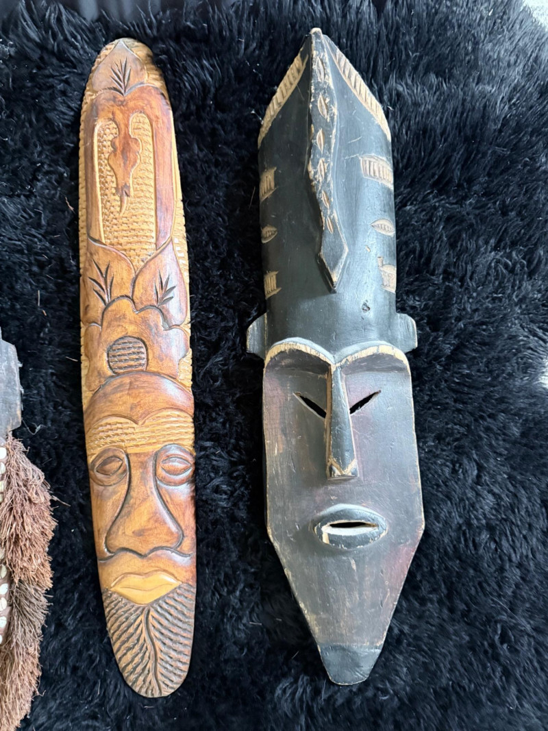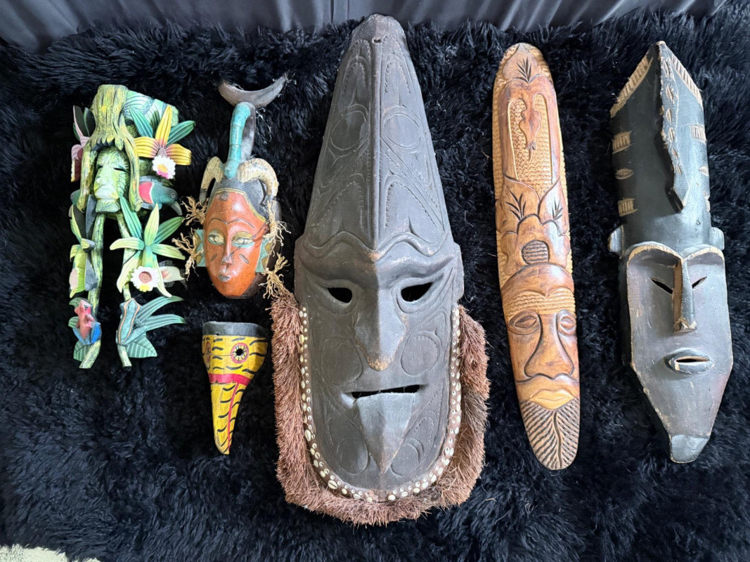 Collection of Hand-Carved Wooden Masks – Global Folk & Tribal Traditions A mixed group of hand-carved wooden masks representing diverse traditions and influences, including African tribal art, Oceanic forms, and global folk carving. The pieces feature painted surfaces, incised motifs, raffia, shells, and stylized facial expressions. Each mask includes hanging hardware or drilled holes for display. Set includes: Dimensions range: 8.5" to 32" H