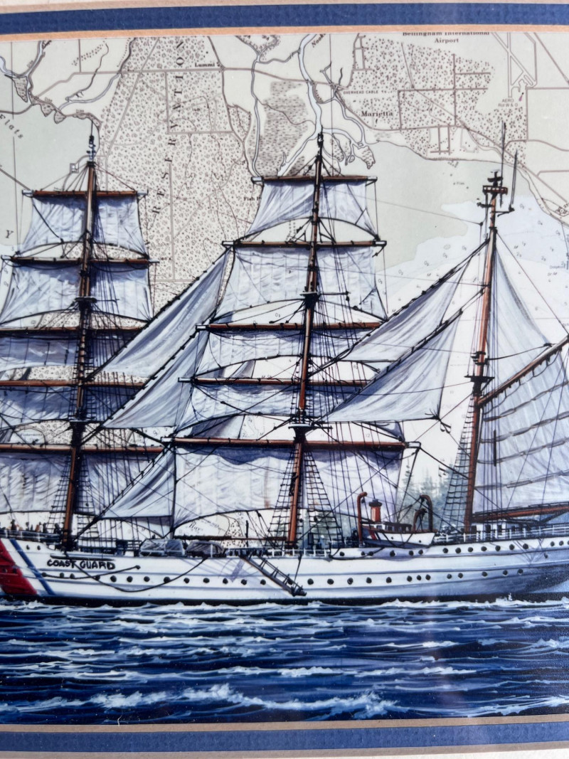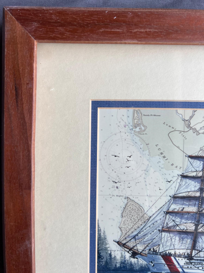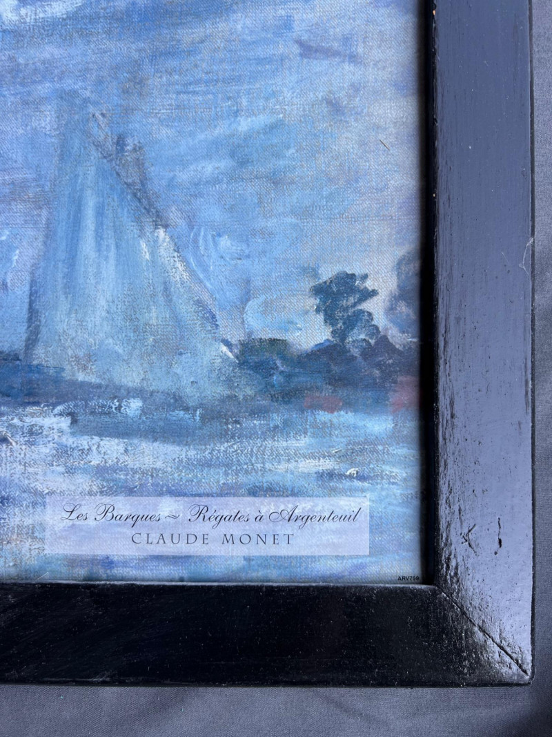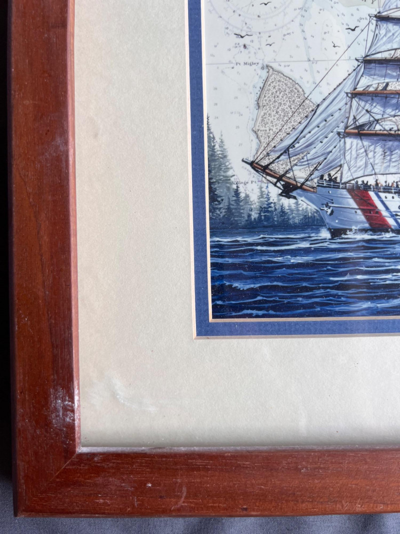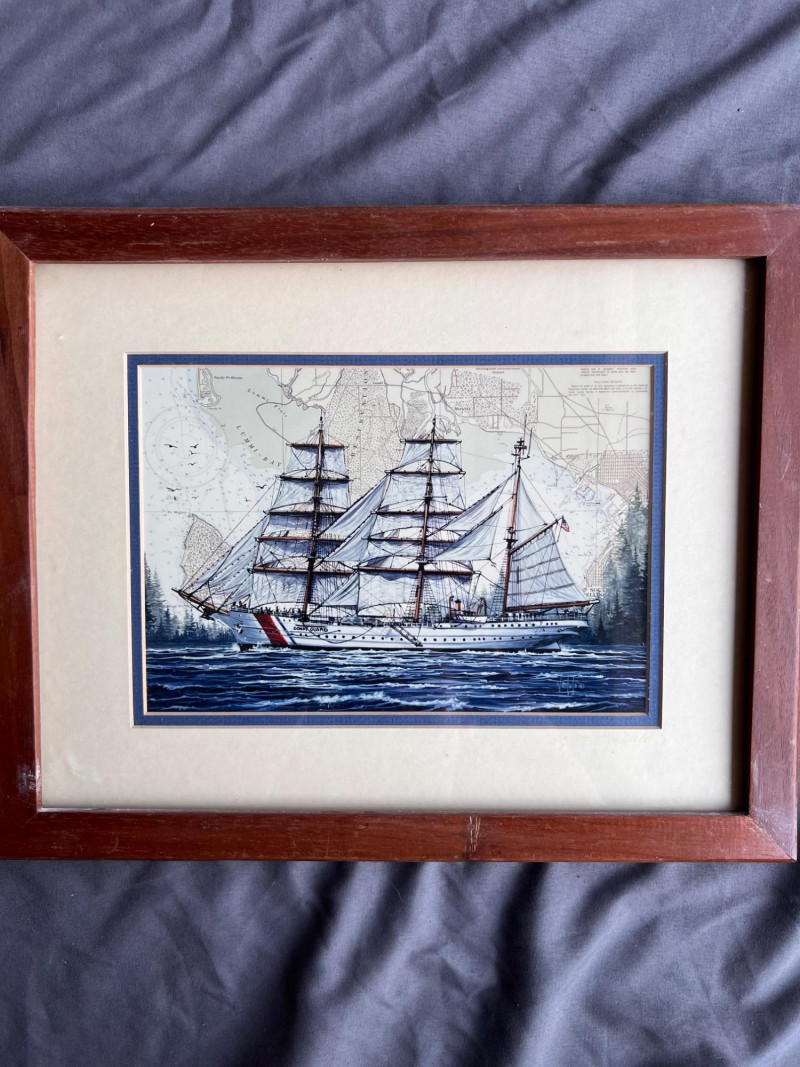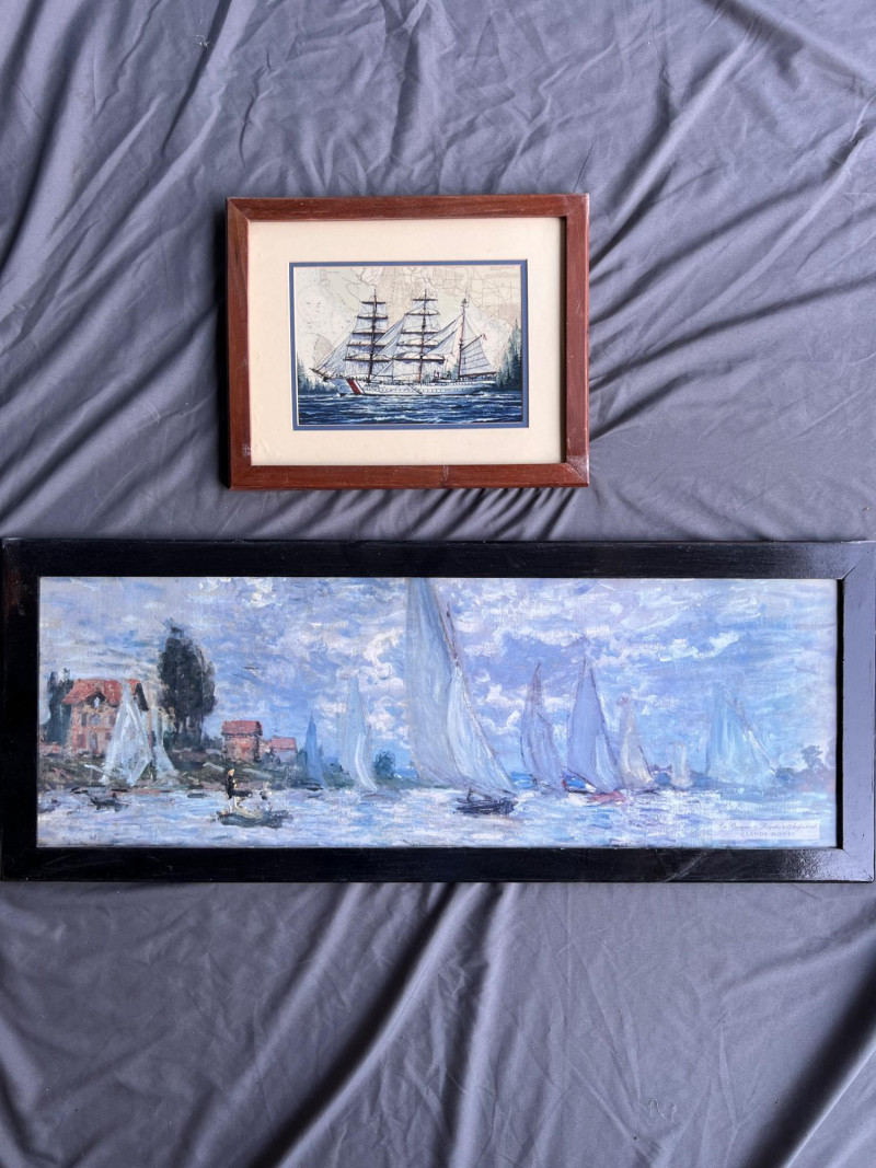 Claude Monet Regatta & Vestufo Tall Ship – Framed Prints (2 Pieces) A pair of framed maritime prints. One is Claude Monet’s Les Barques – Régates à Argenteuil, depicting sailboats near the shore. The other is a limited edition print by Vestufo of a three-masted Coast Guard ship over a nautical chart, signed and numbered 39/850, with a copyright stamp on the reverse. Both are framed in wood. Dimensions: