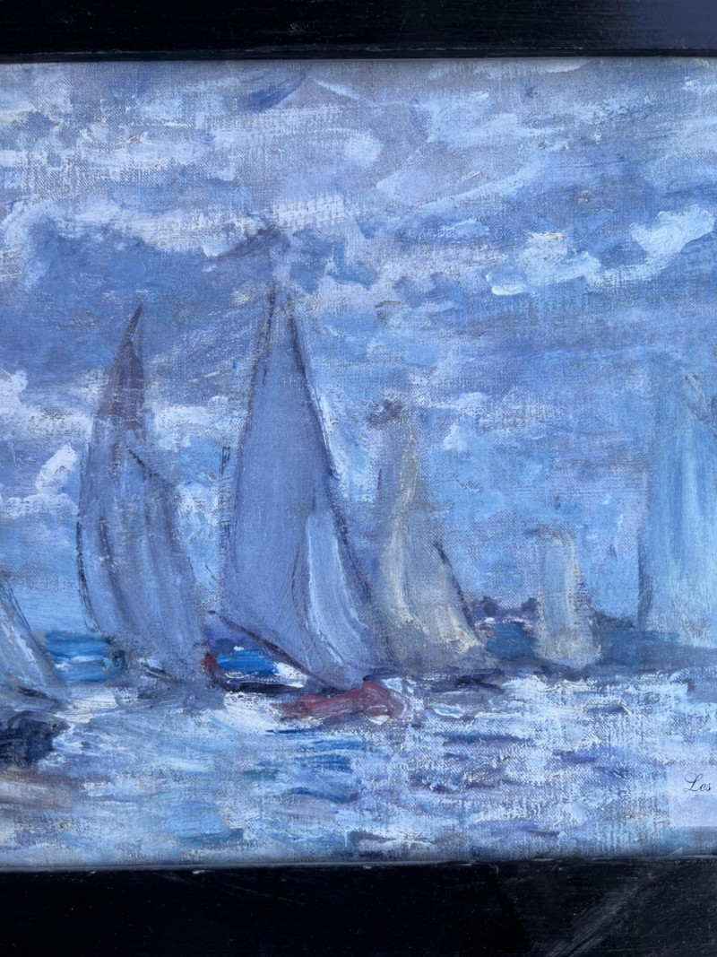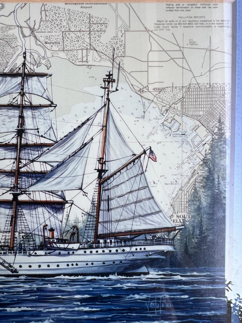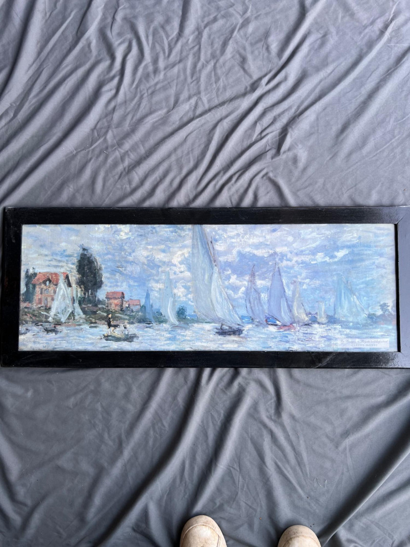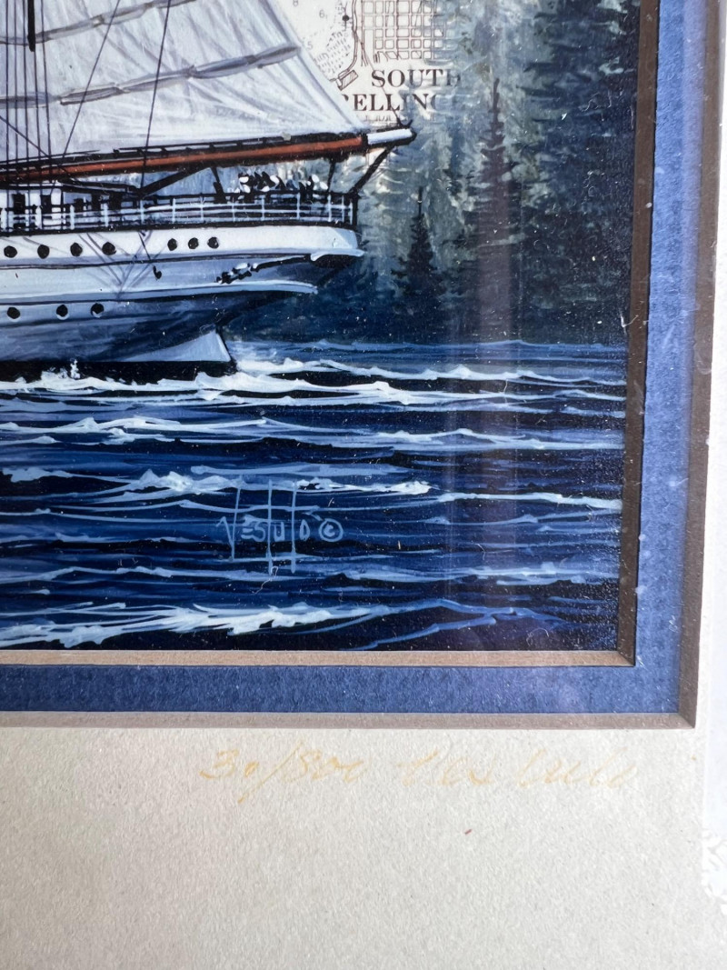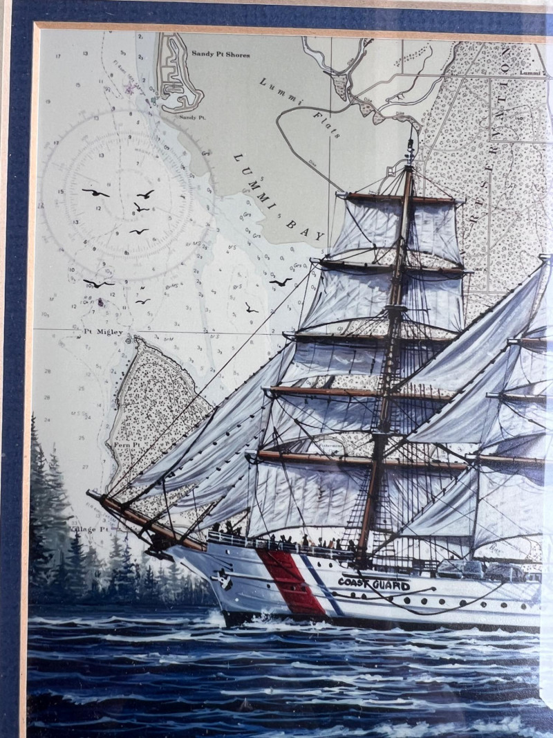 Claude Monet Regatta & Vestufo Tall Ship – Framed Prints (2 Pieces) A pair of framed maritime prints. One is Claude Monet’s Les Barques – Régates à Argenteuil, depicting sailboats near the shore. The other is a limited edition print by Vestufo of a three-masted Coast Guard ship over a nautical chart, signed and numbered 39/850, with a copyright stamp on the reverse. Both are framed in wood. Dimensions: